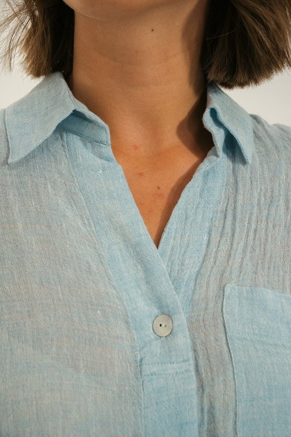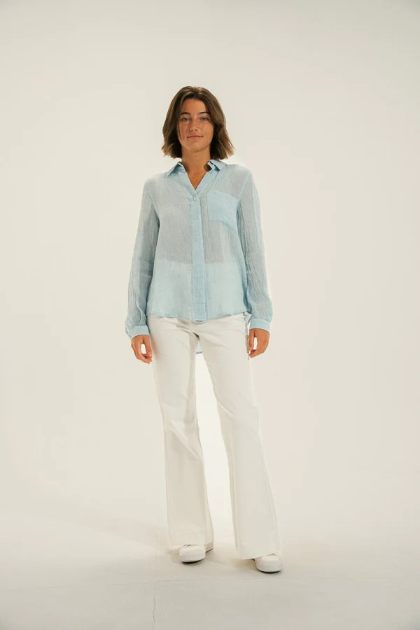 Блуза с длинными рукавами представляет собой идеальное сочетание легкости, комфорта и естественной элегантности. Легкий текстурированный льняной материал обеспечивает отличную воздухопроницаемость и идеально подходит для солнечных дней. Нагрудный карман придает блузе практичный и утонченный вид. Складка на спине обеспечивает плавность, легкость и свободу движений для максимального комфорта в повседневной жизни. Эта модель вписывается в гардероб, вдохновленный Атлантикой и предметами первой необходимости, неподвластными времени.