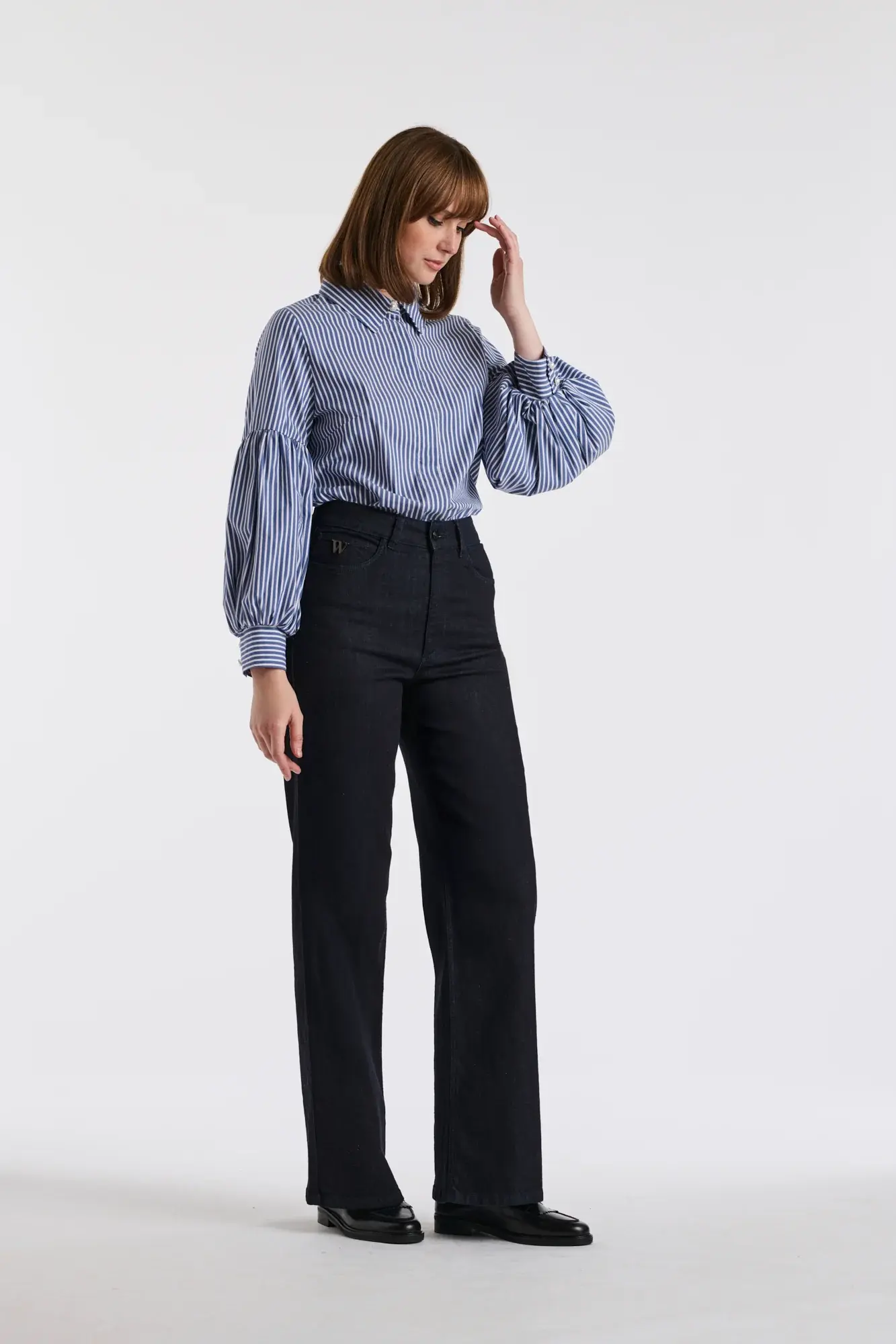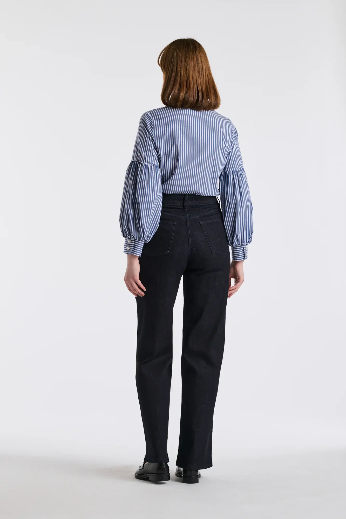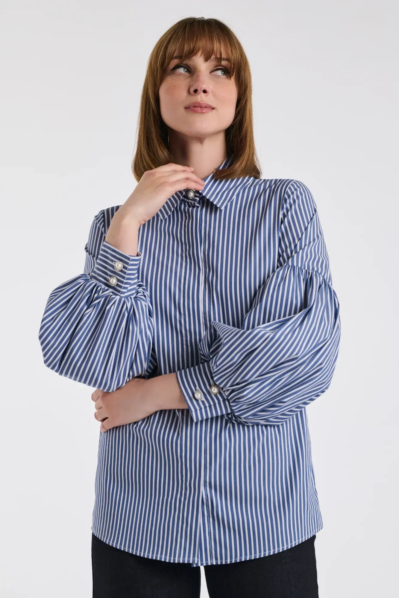 Полосатая блузка с воротником, с планкой на пуговицах и рукавами-буфами с манжетами из хлопкового поплина. Эта рубашка была разработана в Париже, в его исторической мастерской. Все этапы производства осуществлялись в Тунисе.