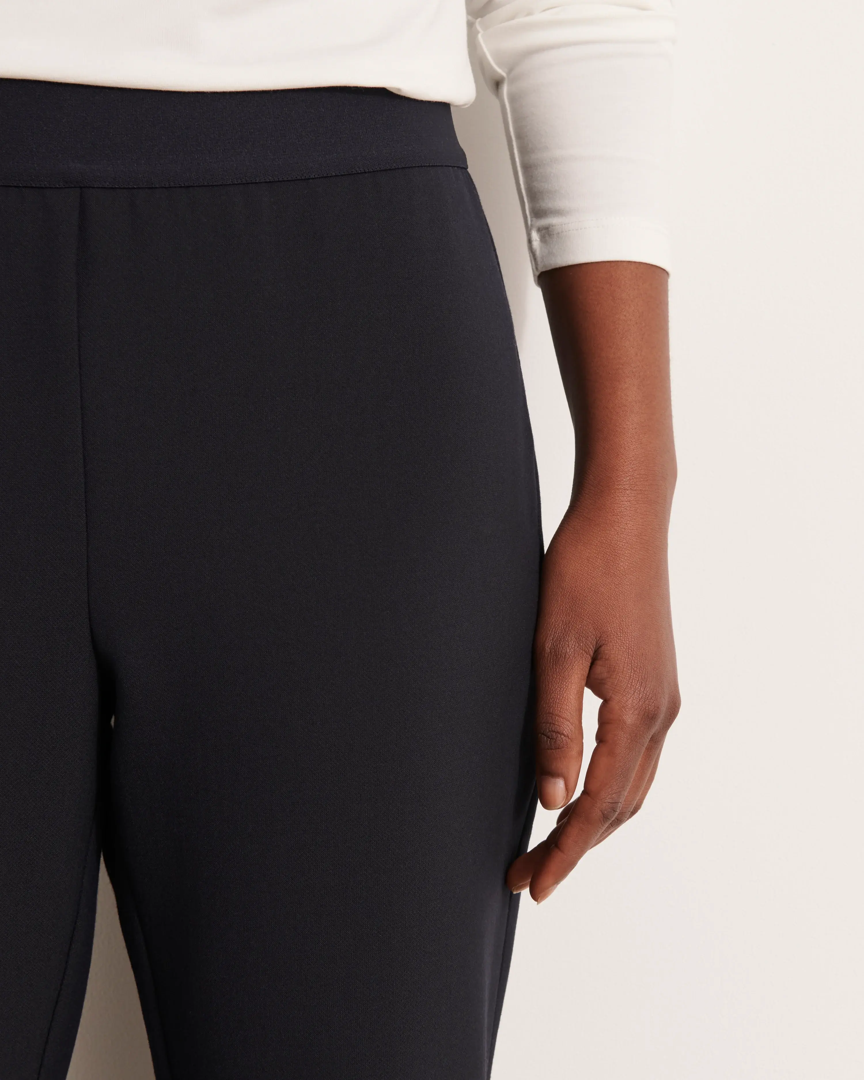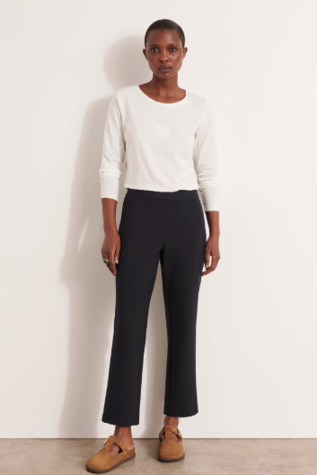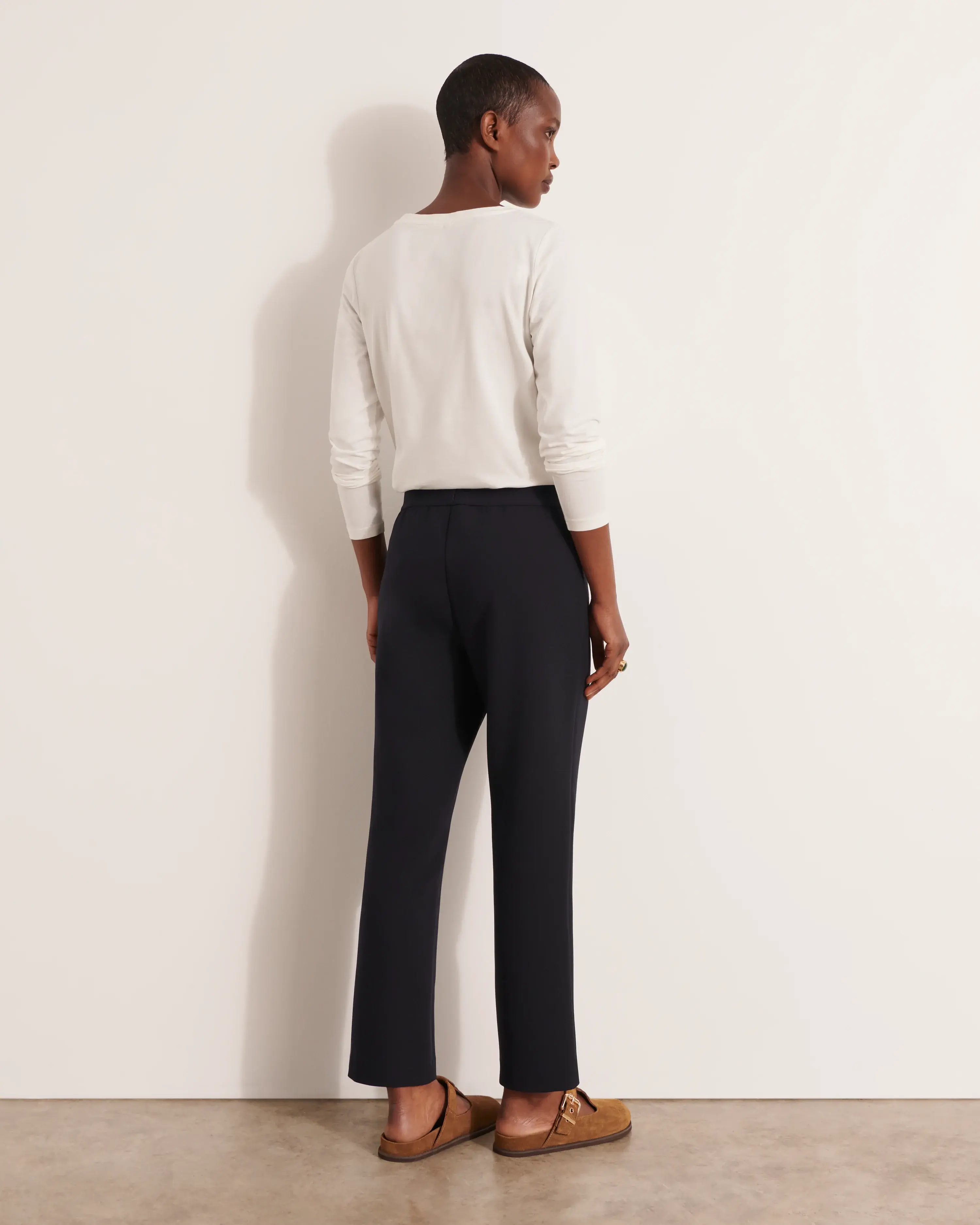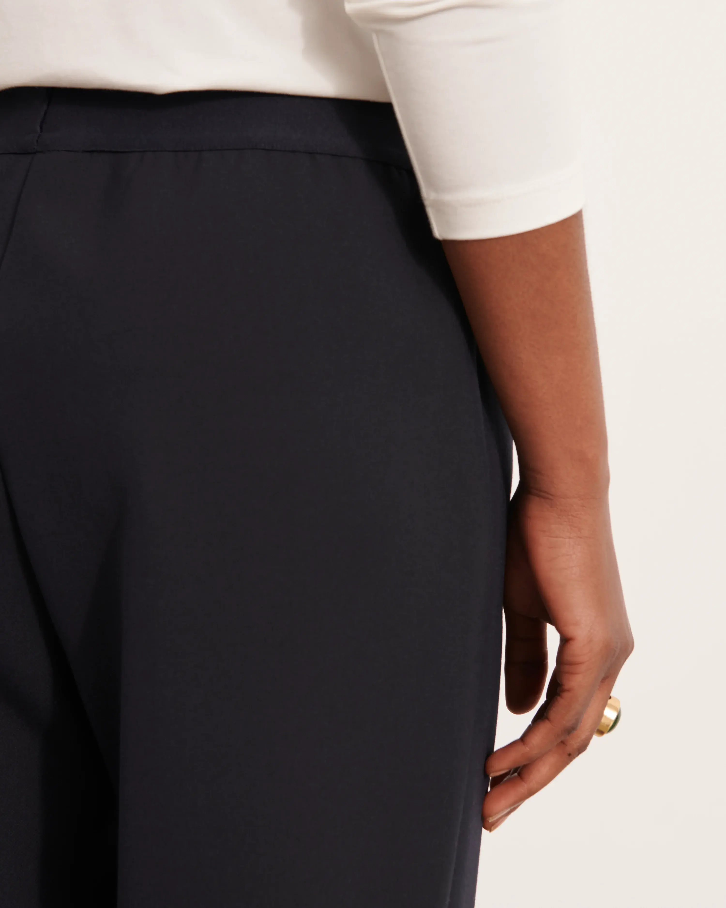 Трикотажные брюки длиной 7/8 прямого кроя с эластичным поясом из плотной эластичной ткани обеспечивают свободу движений и элегантный силуэт. Нейтральный тёмно-синий цвет , который легко комбинировать, делает их современным и вневременным предметом гардероба.Состав: 27% вискоза 7% хлопок 63% полиэстер 3% эластан