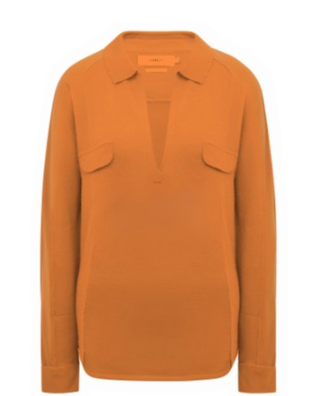 Темно-серый свитер с отложным воротником, будто позаимствованным у поло, и глубоким V-образным вырезом станет удачным вложением в повседневный гардероб. Для изготовления модели, декорированной клапанами спереди, использовали почти невесомый нежный кашемир. Тонкий материал согревает лучше обычной шерсти, но при этом не создает дискомфорта в теплом помещении.