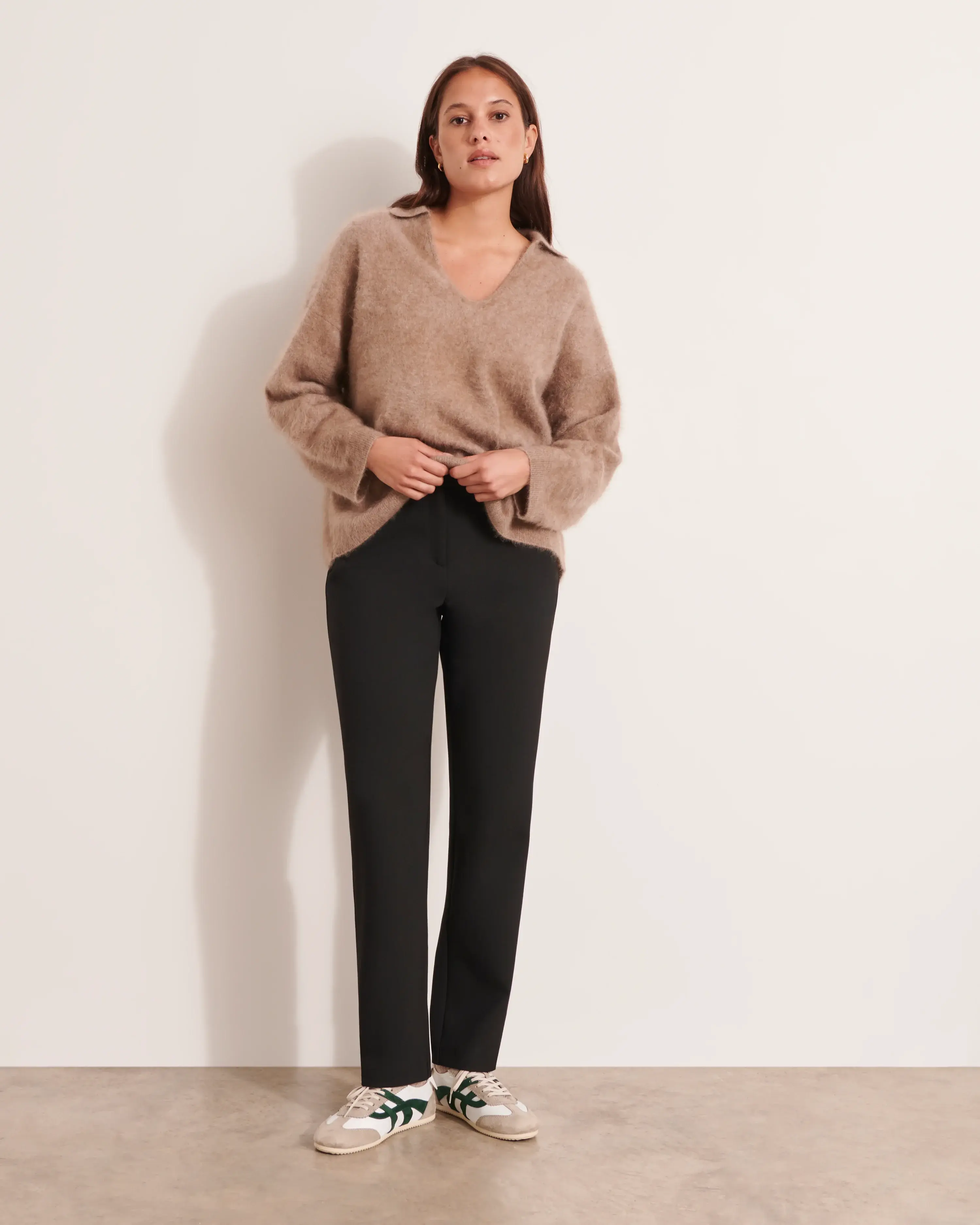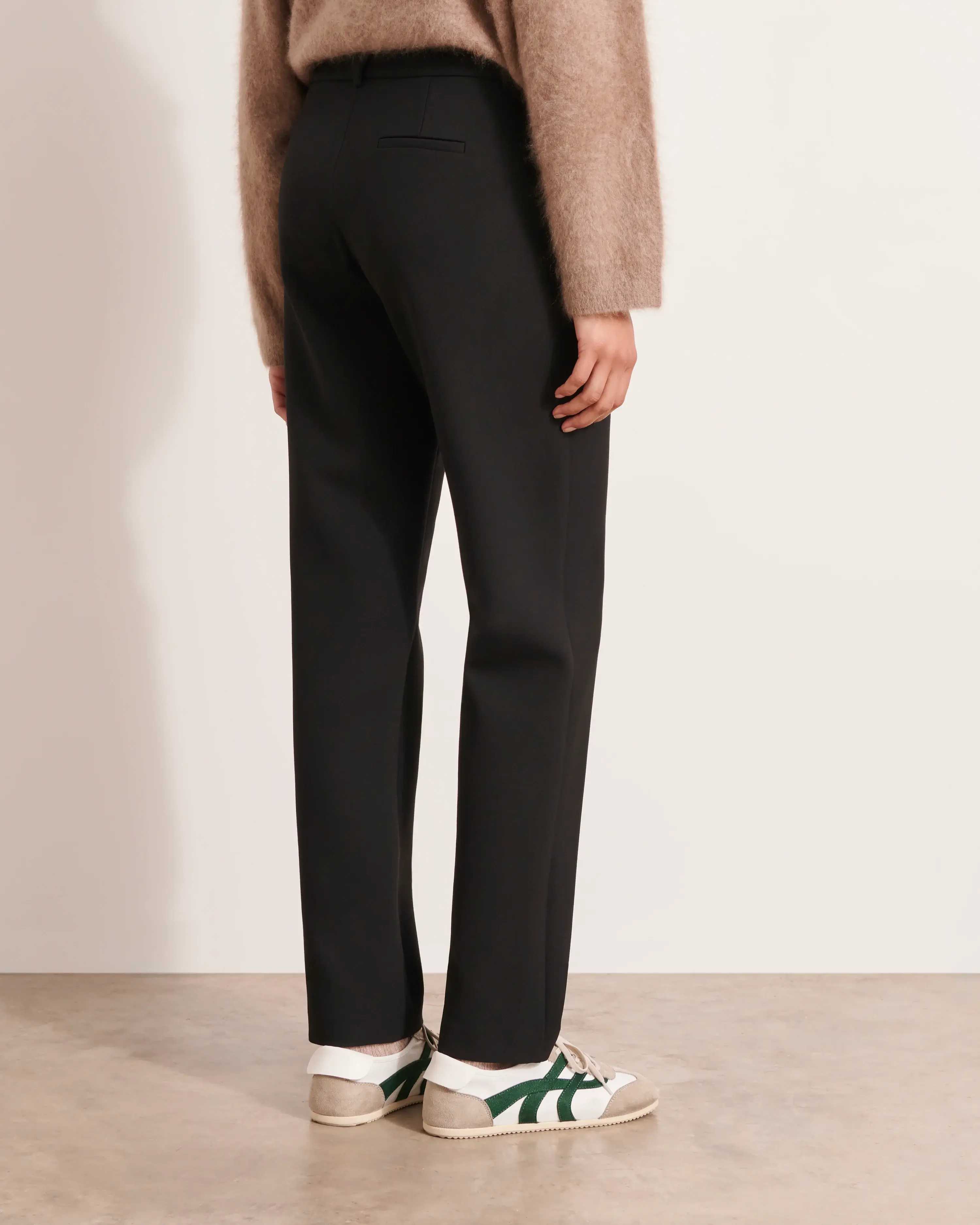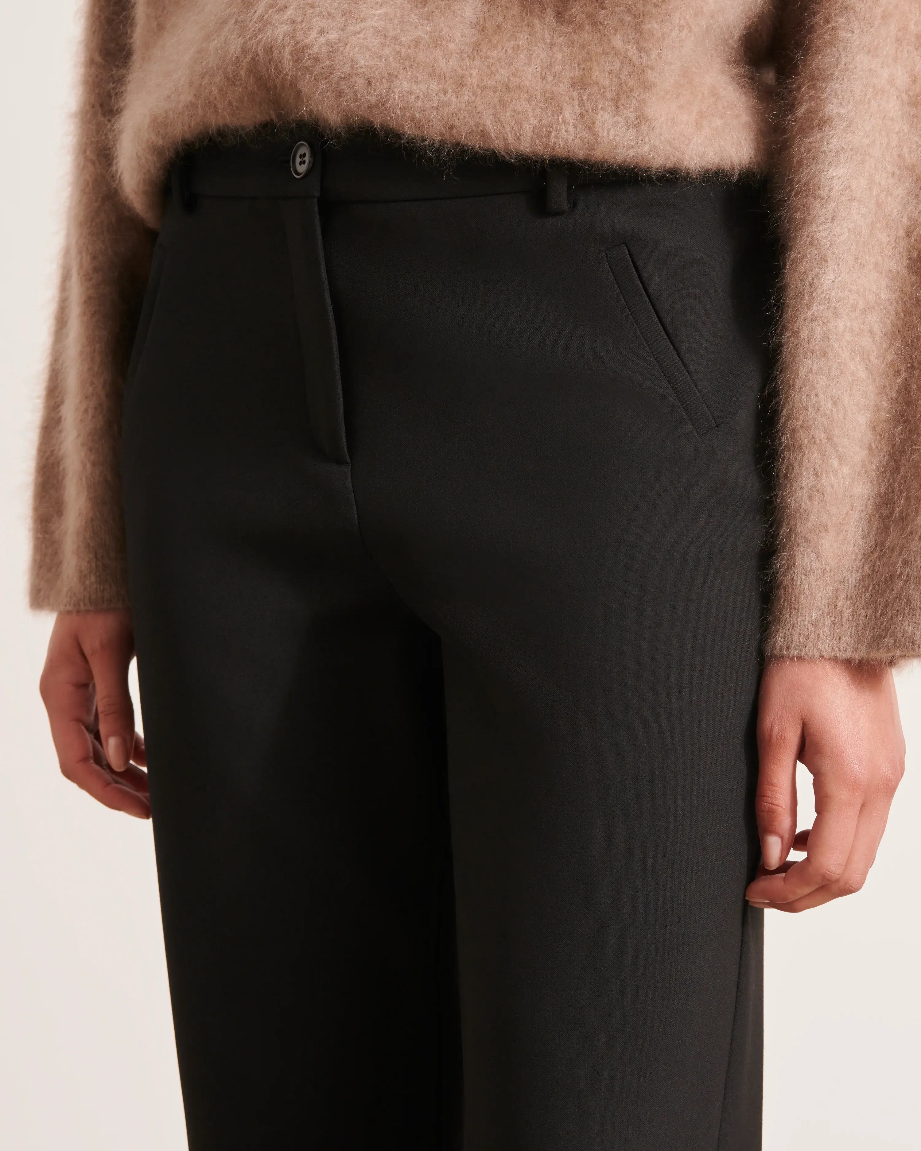 Трикотажные чёрные брюки из плотной эластичной ткани сочетают в себе элегантность и повседневный комфорт. Два косых кармана спереди и карман сзади добавляют практичности и сдержанности. Благодаря шлёвкам на поясе их можно носить с ремнём или без него, в зависимости от Ваших предпочтений.