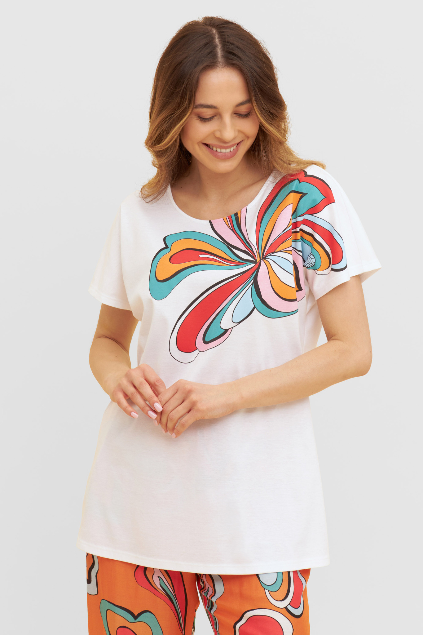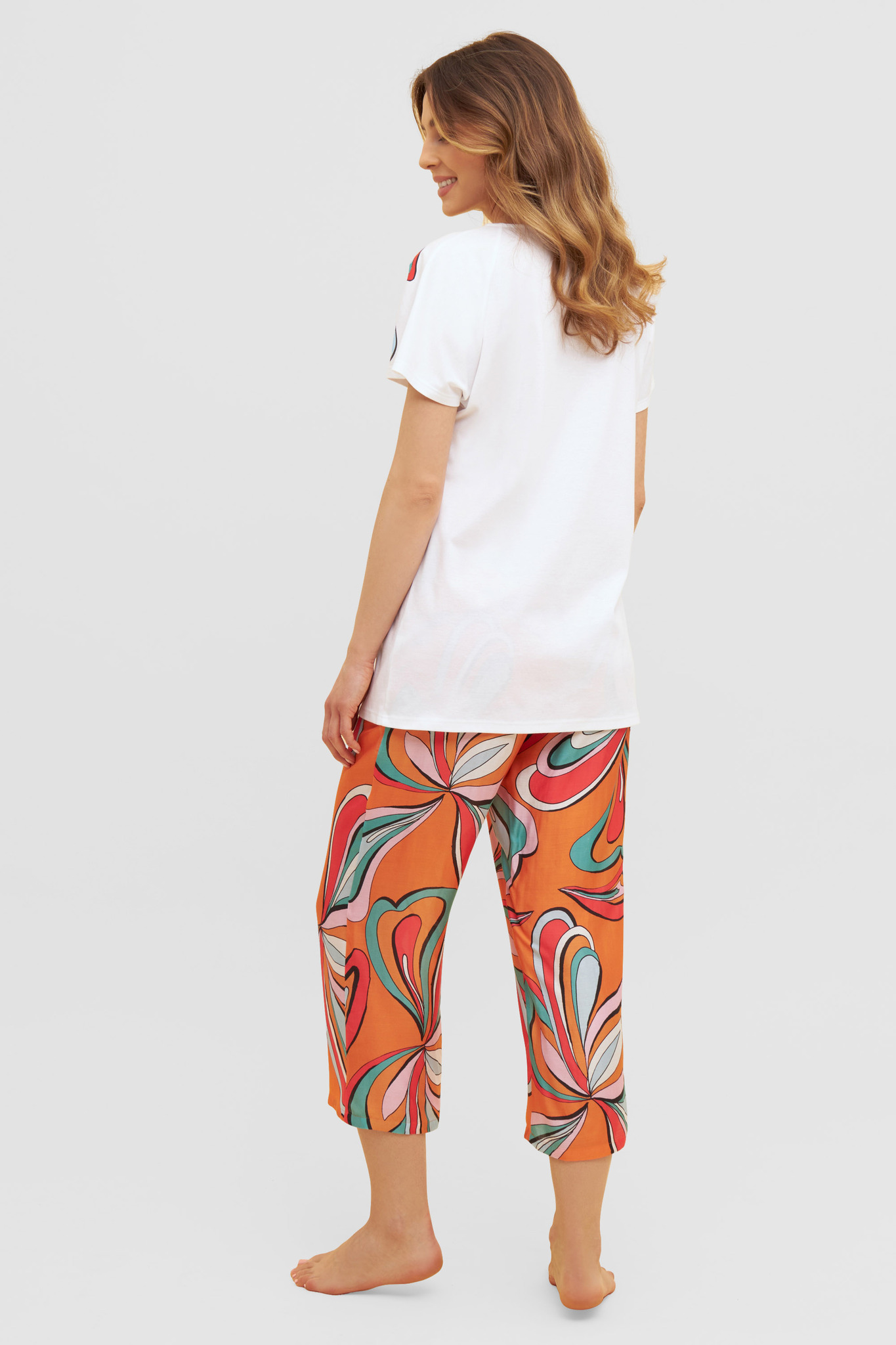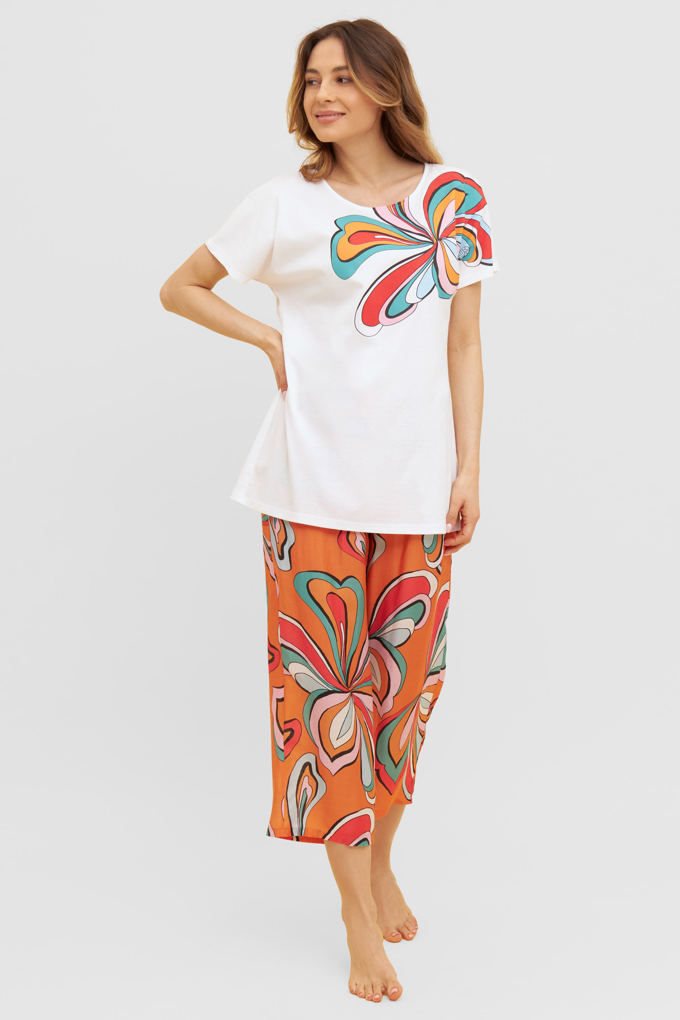Модные брюки-кюлоты свободного кроя с эластичным поясом с ярким восточным принтом в стиле Пейсли подчеркивает роскошный стиль. Брюки можно носить и дома, как домашний костюм, и на море в качестве пляжного ансамбля. Вместе с коралловой футболкой они создают прекрасный ансамбль. Вечерний променад в этих брюках вдоль набережной создаст Вам ощущение радости и чувство комфорта, а так же будет приковывать всеобщее внимание. Цвет коралл/черный/ванильДлина 7/8Состав: брюки 100% хлопок