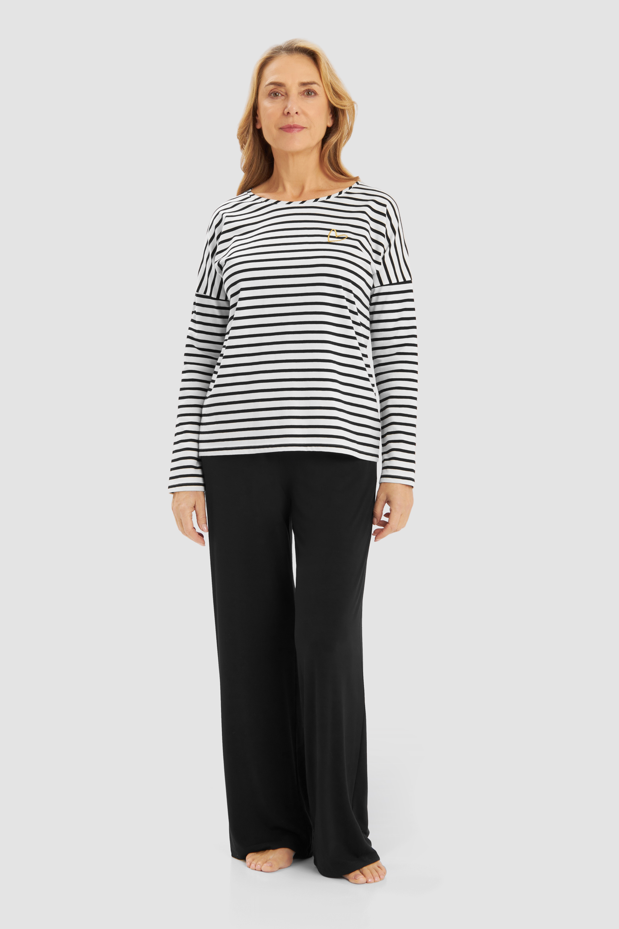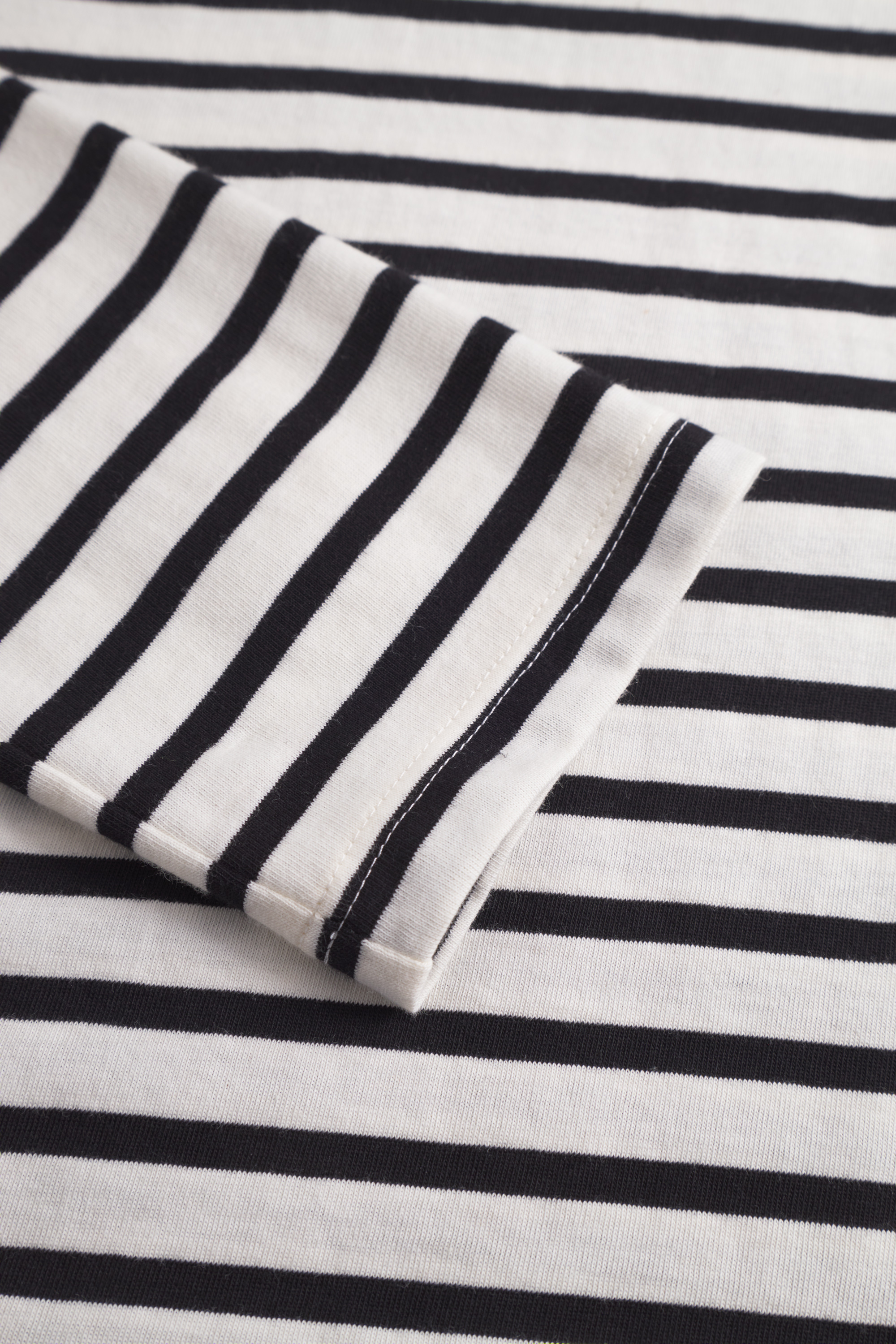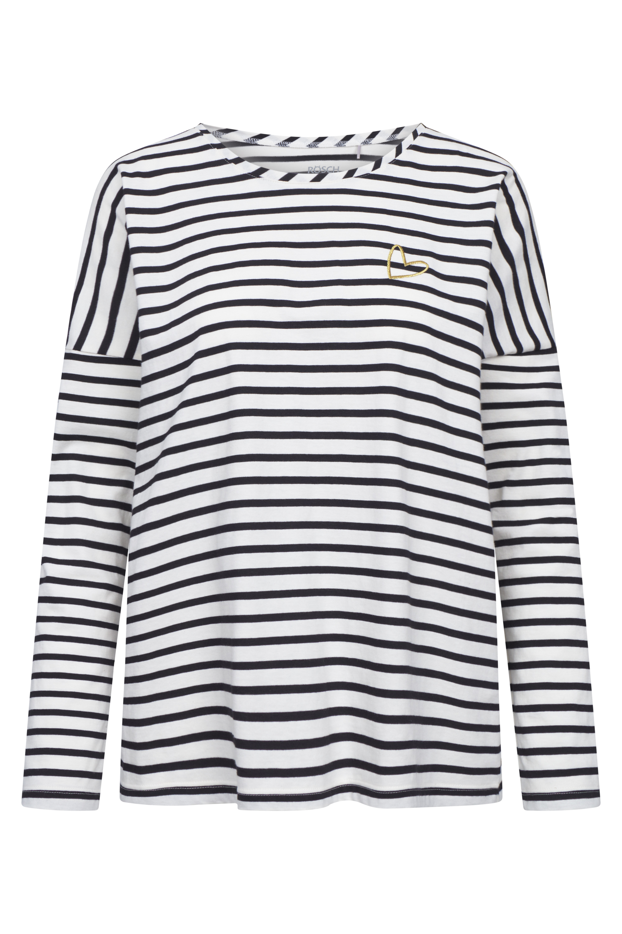 Комфортная полосатая футболка в морском стиле со спущенными плечами из мягкой ткани создает непринужденный образ. Небольшое золотое сердечко, вышитое на левой стороне, украшает футболку.