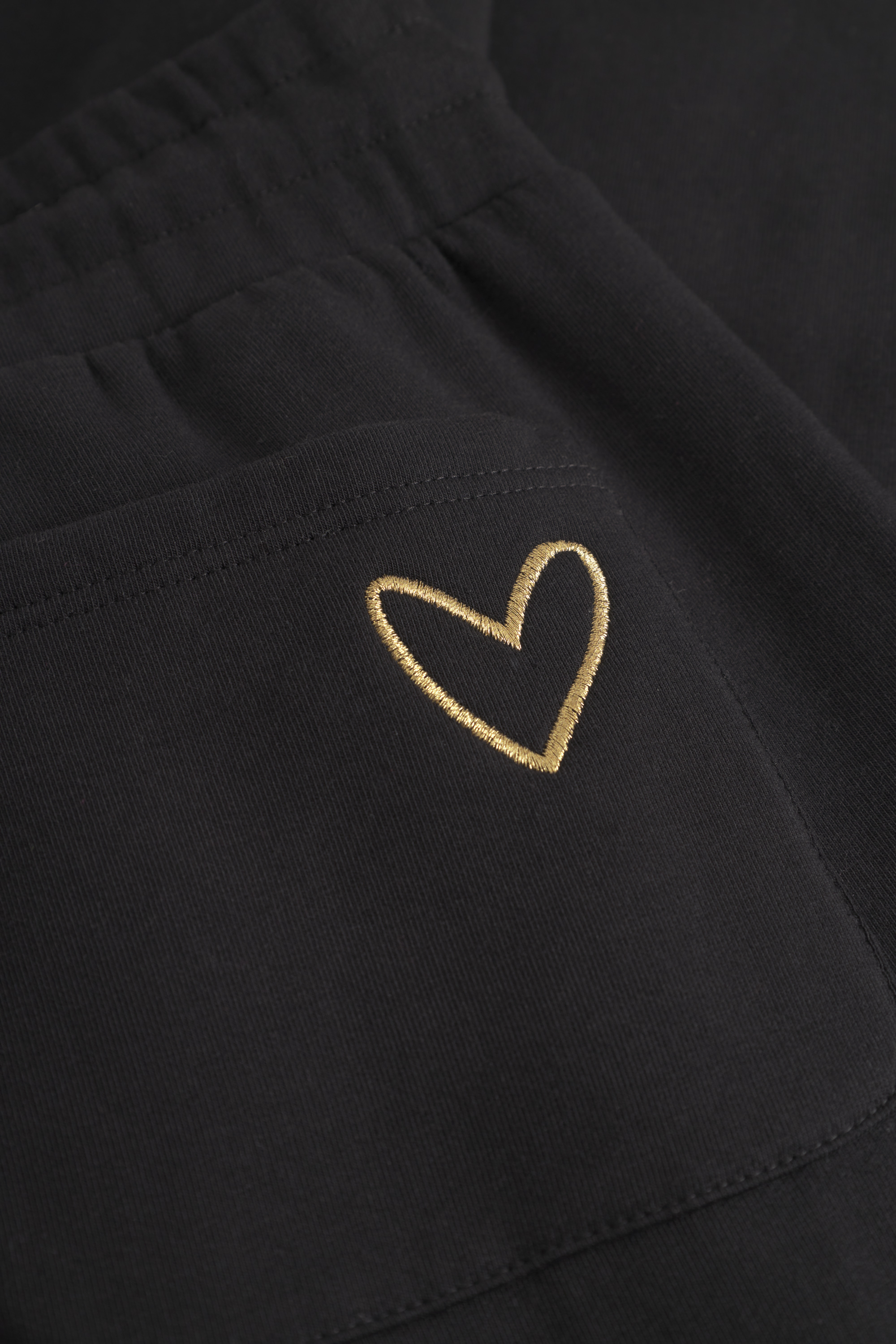 Широкие спортивные брюки из мягкого, ворсистого флиса с боковыми карманами и мягким поясом с кулиской. Задний карман придает брюкам непринужденный вид, на котором вышито золотое сердечко.