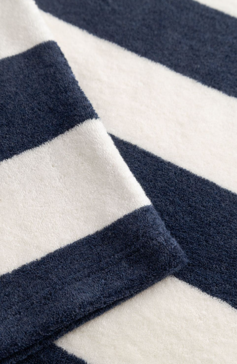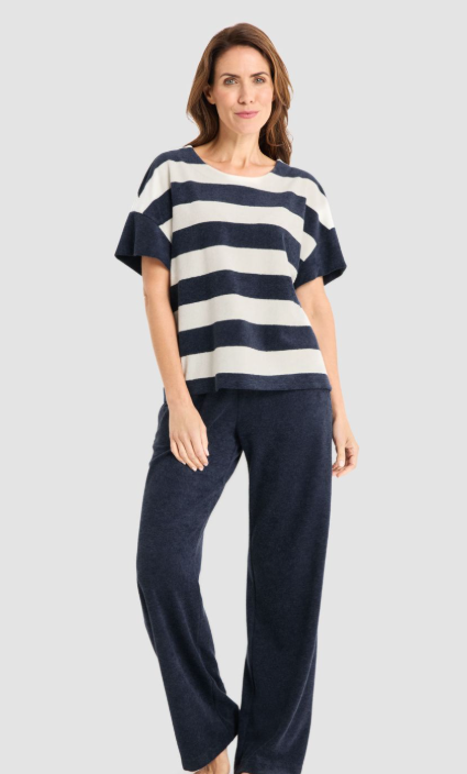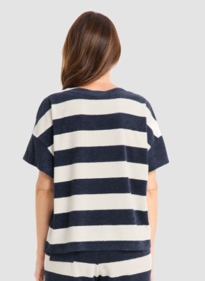 Великолепная трикотажная футболка с короткими рукавами из махровой ткани с логотипом. К ней подойдут темно-синие брюки, вместе они создадут прекрасный пляжный ансамбль.