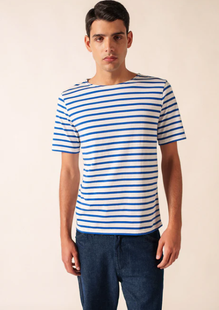 Футболка с короткими рукавами и круглым вырезом имеет морской оттенок, который также напоминает нам о том, что во время военного похода моряки часто сами отрезали рукава бретонки, чтобы чувствовать себя более комфортно.