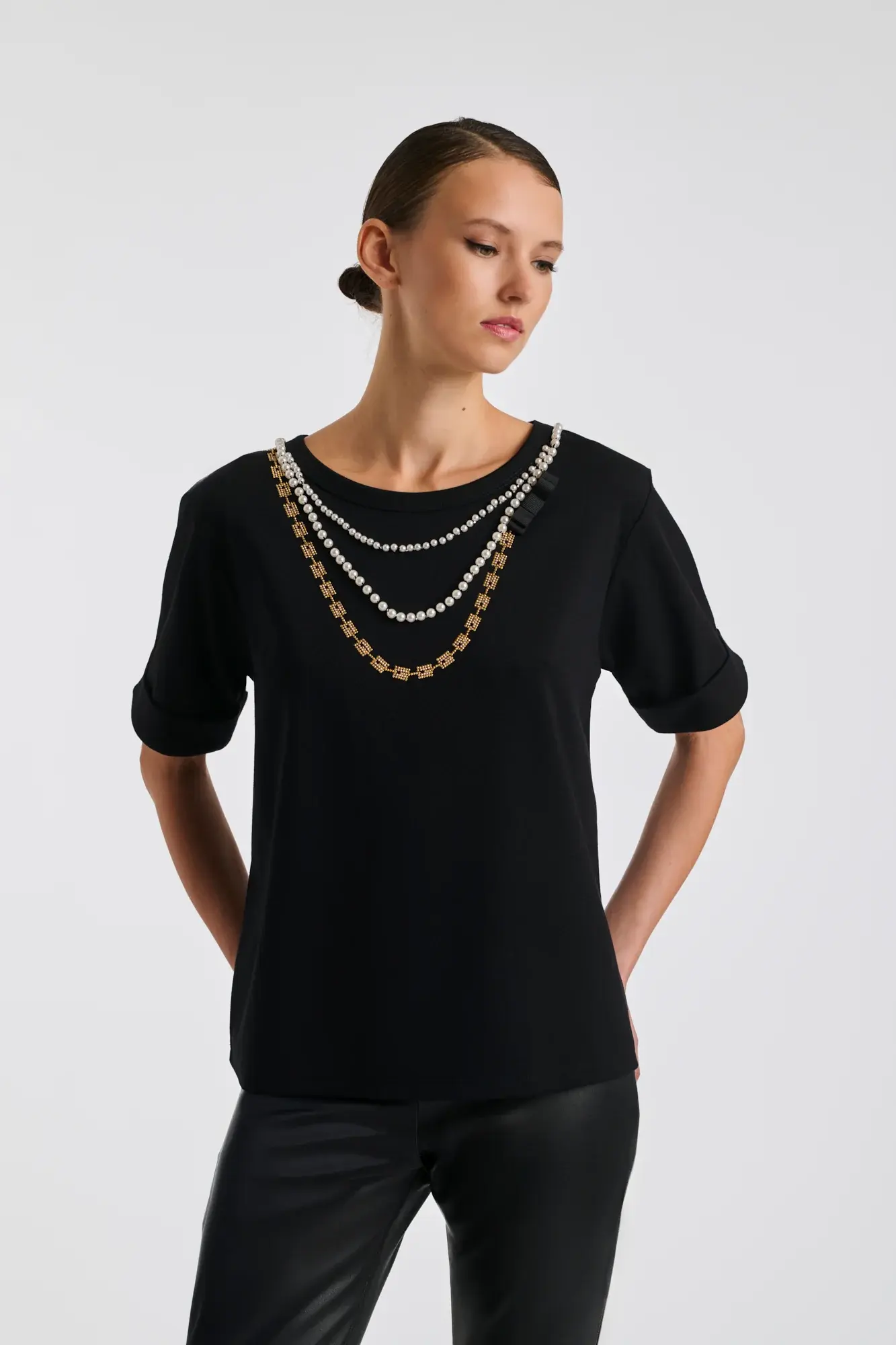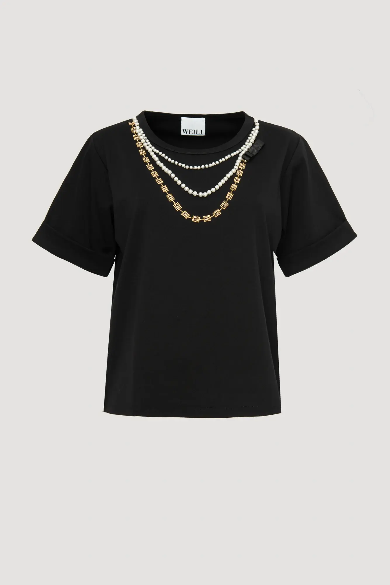 Футболка с короткими рукавами с отворотами с эффектом оптической иллюзии, украшенная двумя рядами жемчужных ожерелий и цепочкой из страз для создания шикарного образа. Эта футболка была разработана в Париже, в его исторической мастерской, но все этапы производства осуществлялись в Италии с использованием итальянских тканей.