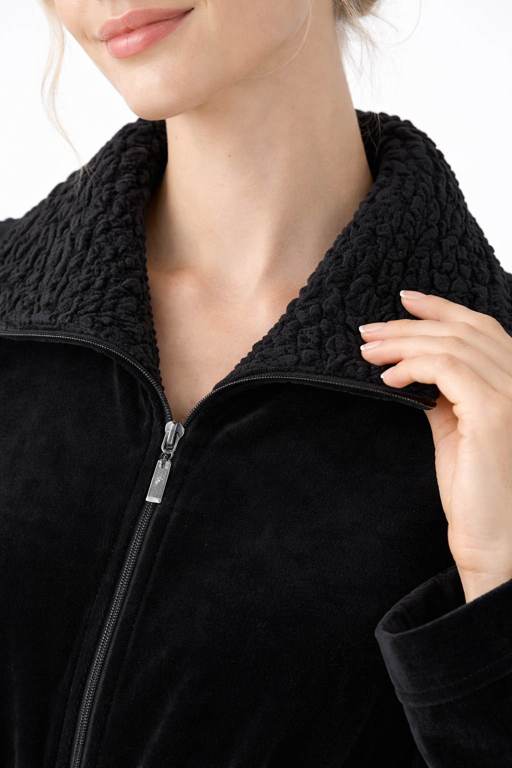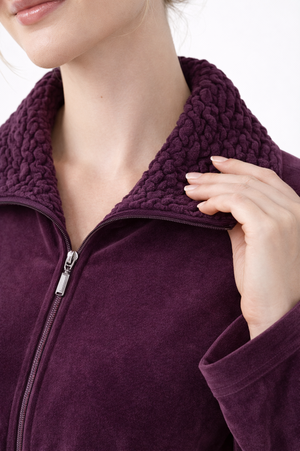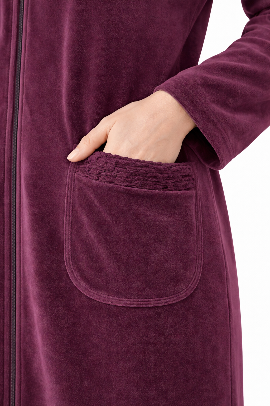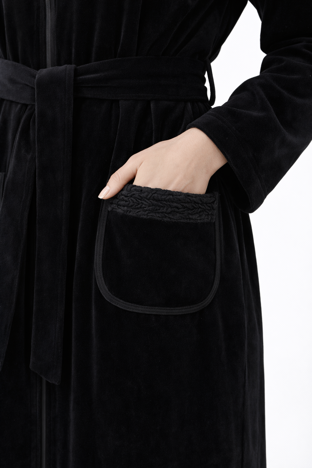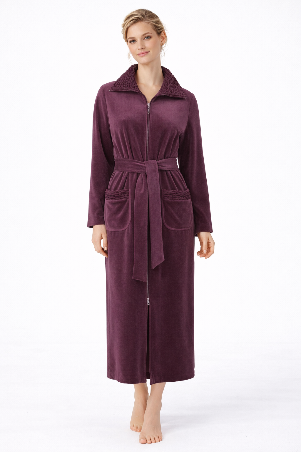 Великолепный велюровый халат с двойной молнией с отложным воротником с декоративной отделкой и такой же отделкой на карманах. Этот халат подарит Вам ощущение праздника. Халат представлен в двух цветах черном и бордовом. Сделано в Германии.