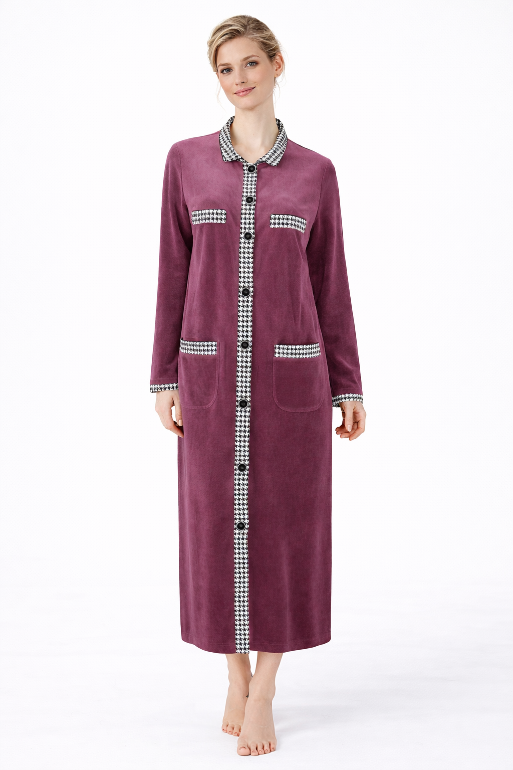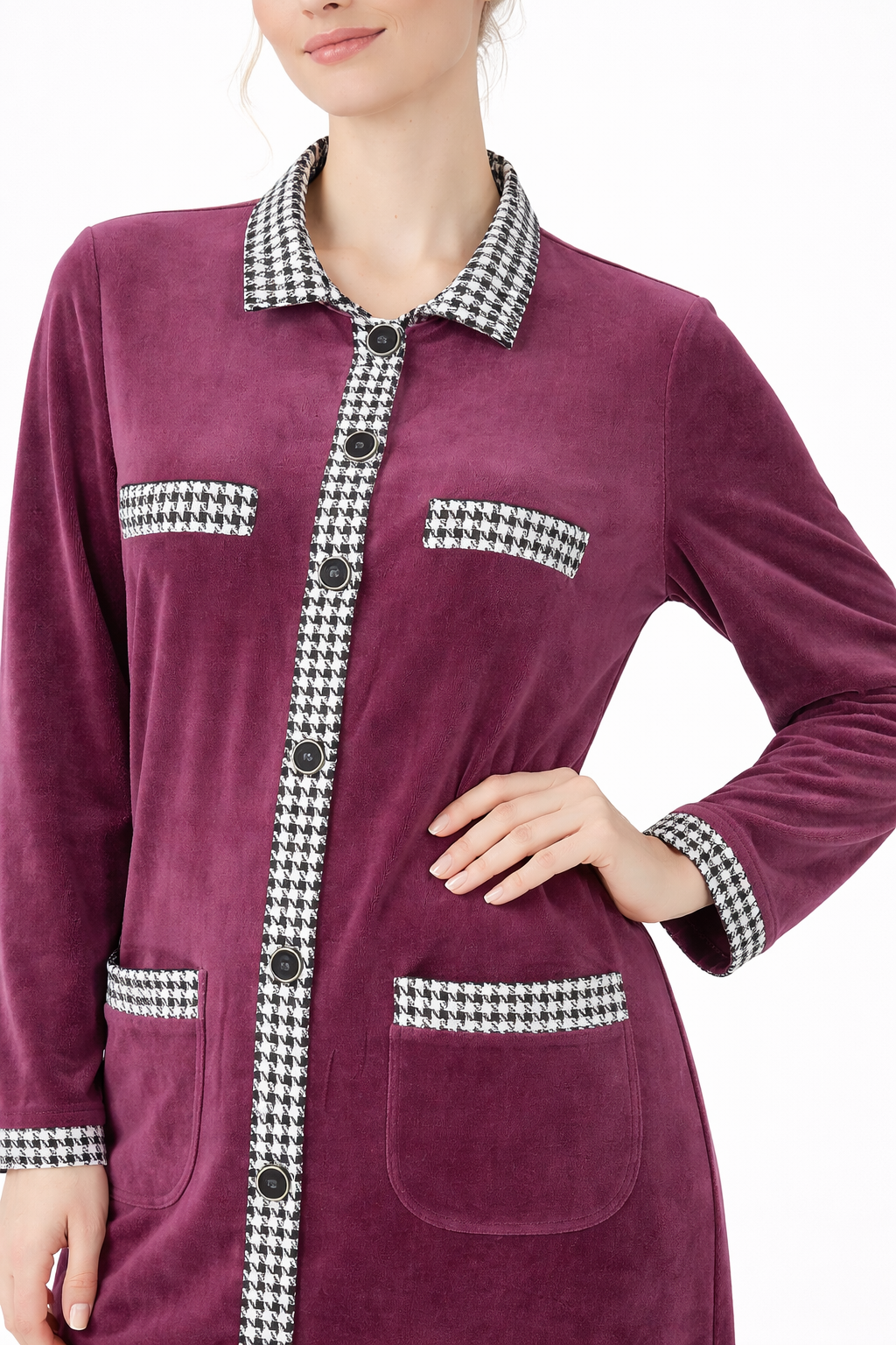 Великолепный велюровый халат в стиле Шанель с планкой и застежкой на пуговицы, с отложным воротником, накладными карманами. Декоративная отделка с принтом "гусиная лапка" украшает воротник, рукава и карманы, подчеркивая изысканный стиль. Этот халат подарит Вам ощущение праздника.