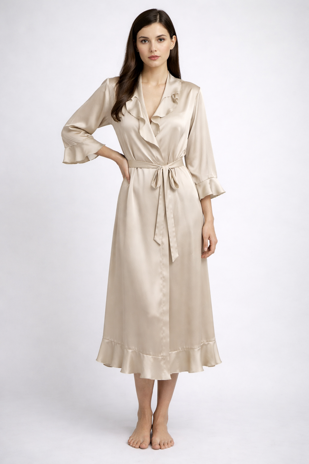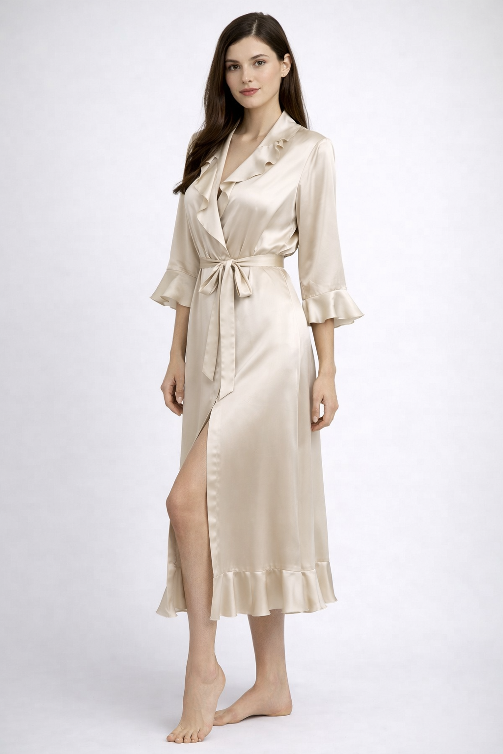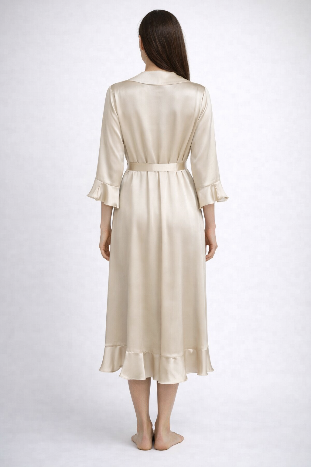 Великолепный халат-кимоно из 100% шелка с высококачественным ажурным кружевом темного цвета вдоль ворота до низа халата и рукавам. Халат имеет боковые карманы и пояс. Этот халат подарит Вам ощущение праздника. Сделано в Германии.