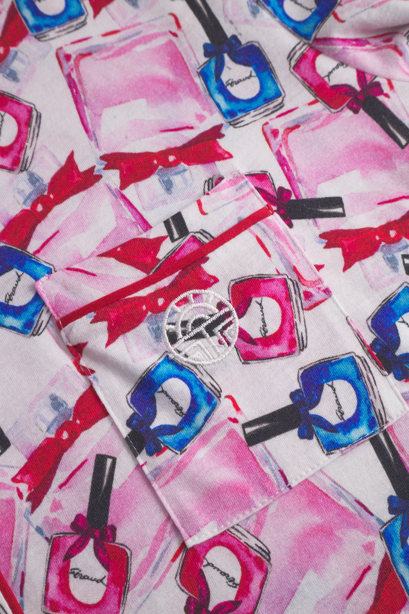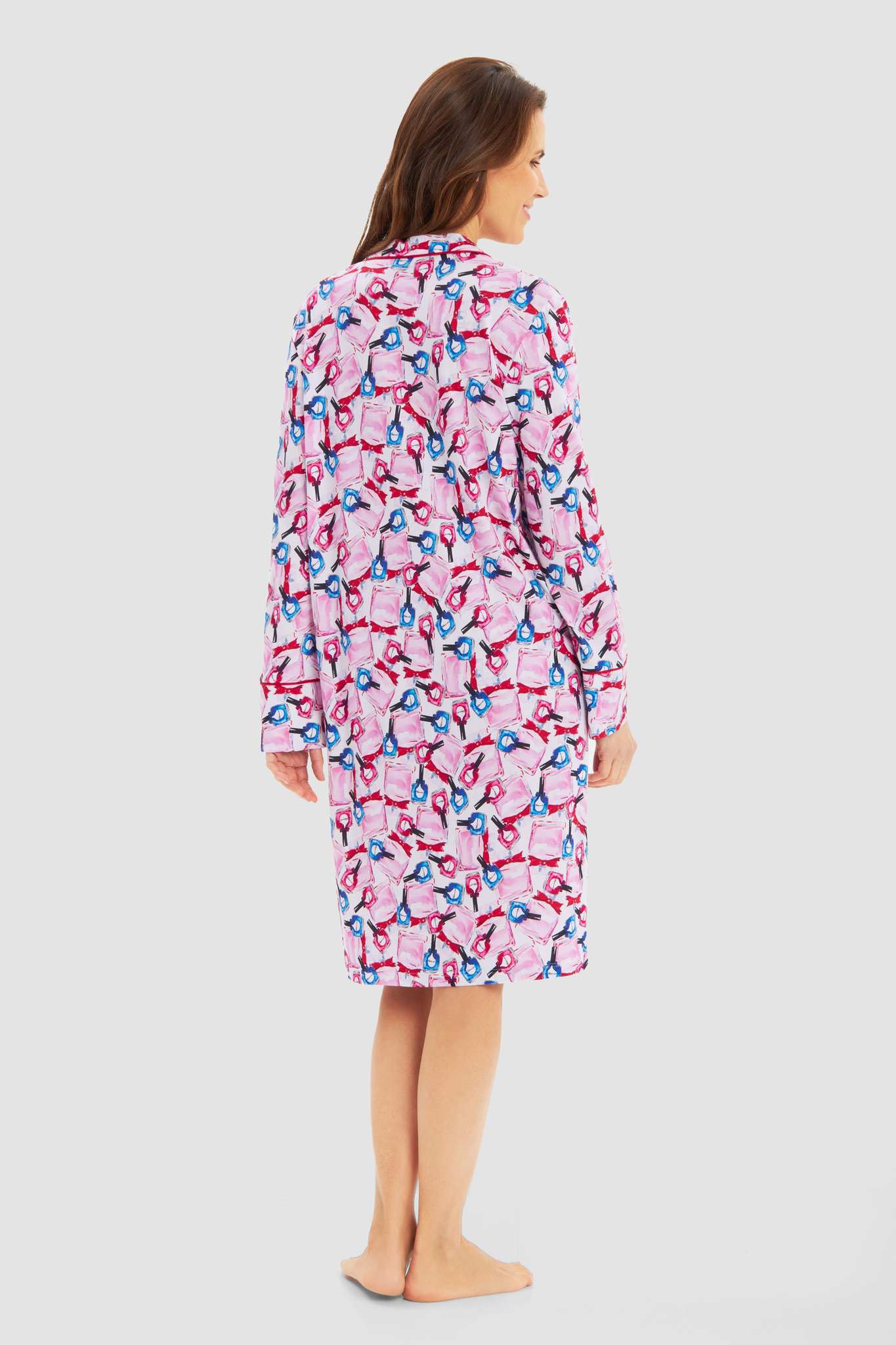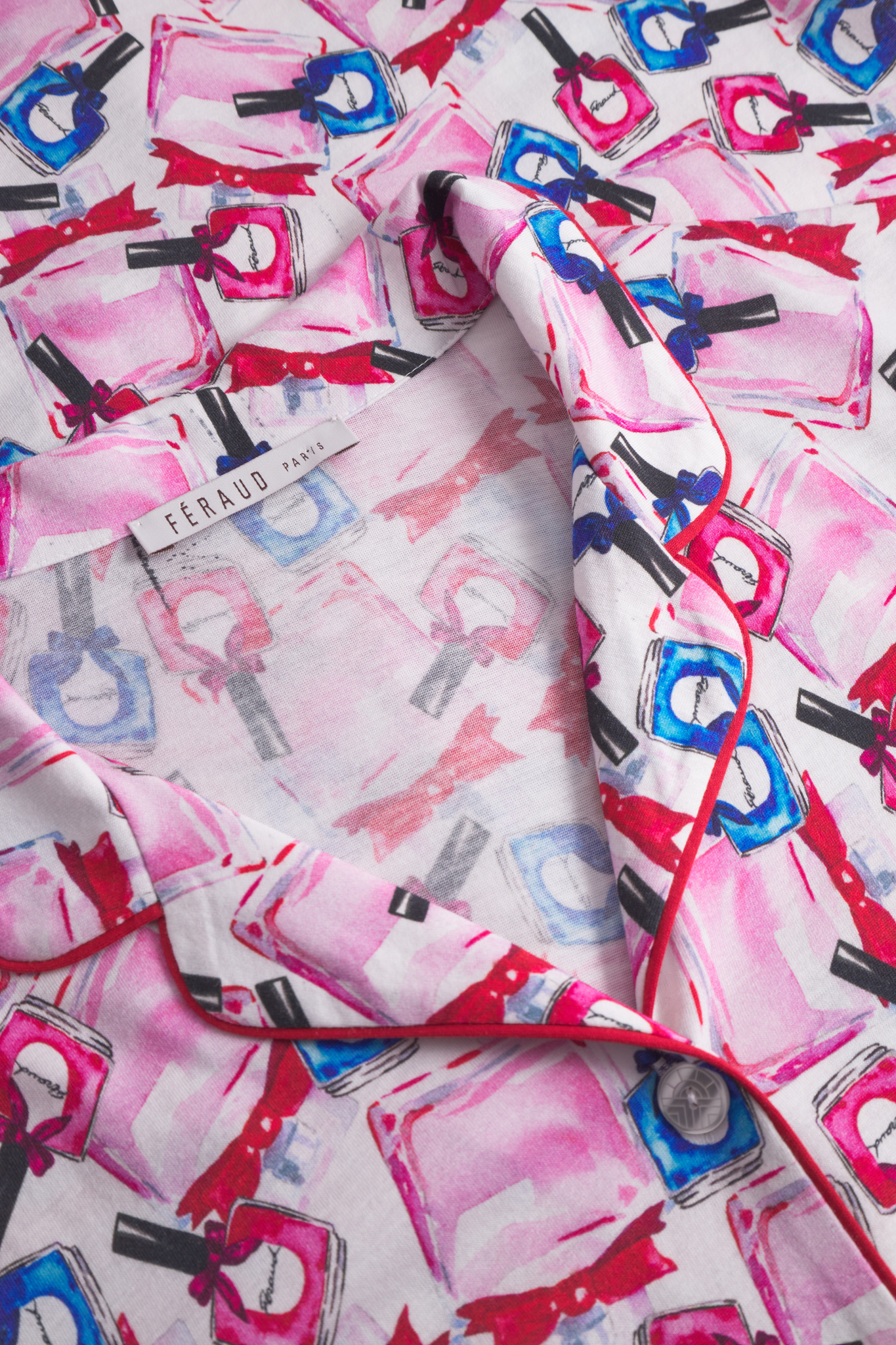 Симпатичный халат в мужском стиле на пуговицах с отложным воротником, длинными рукавами в розово-голубых тонах с принтом в виде разноцветных бутылочек лака для ногтей. Элегантный контрастный кант на воротнике, манжетах и нагрудном кармане придает халату стильный вид. Дополнительной деталью является декоративный вышитый логотип Féraud.