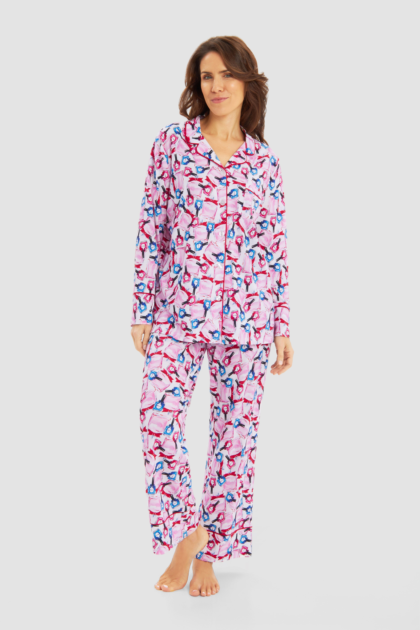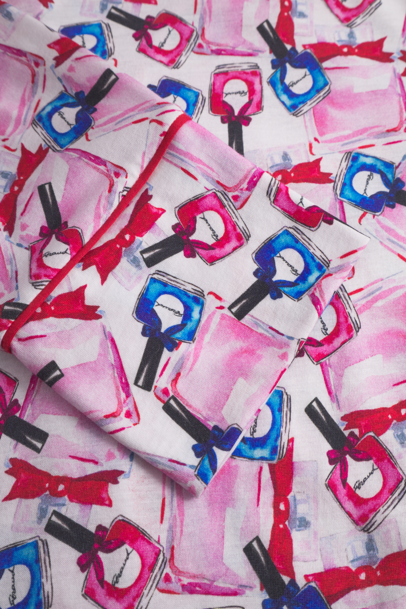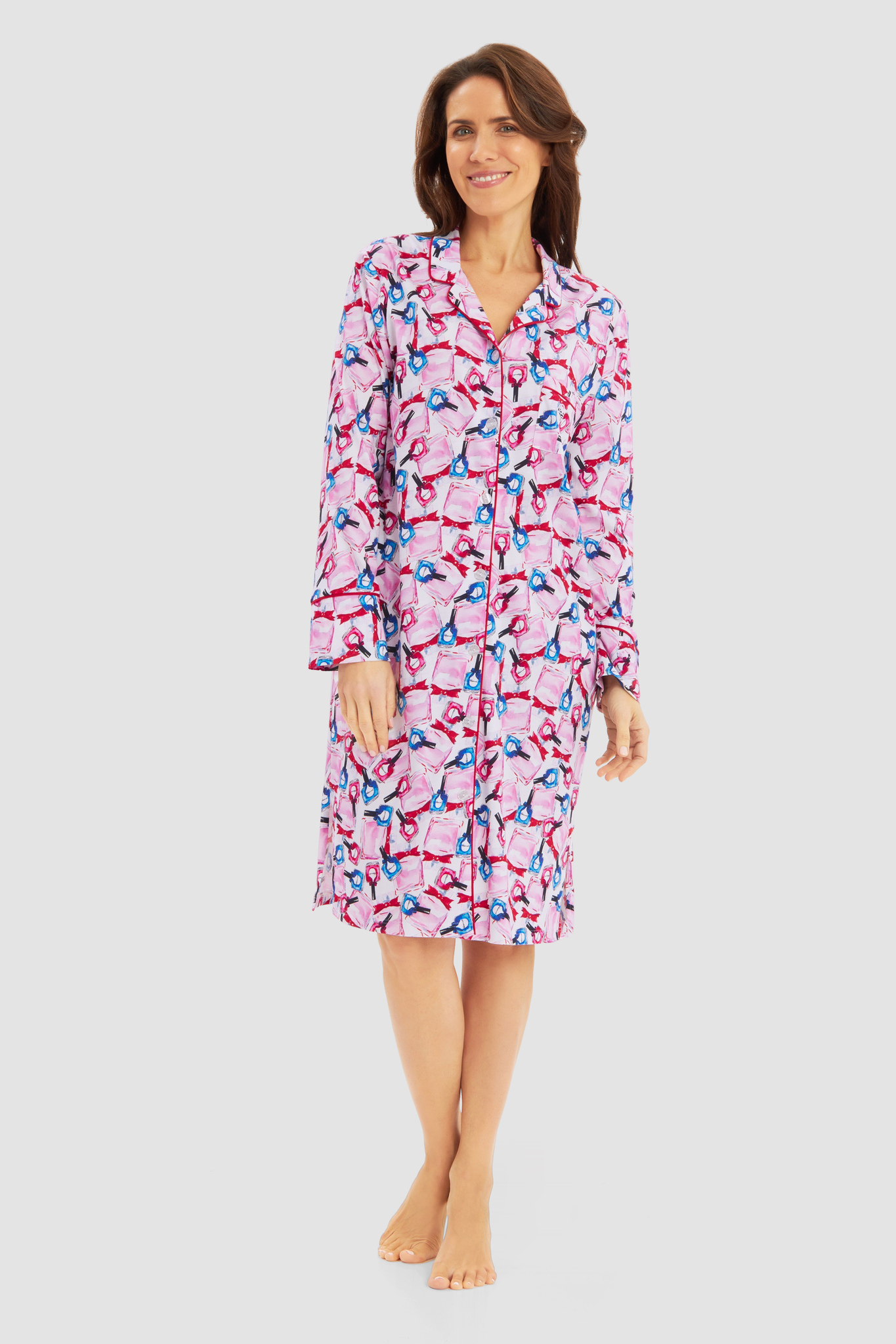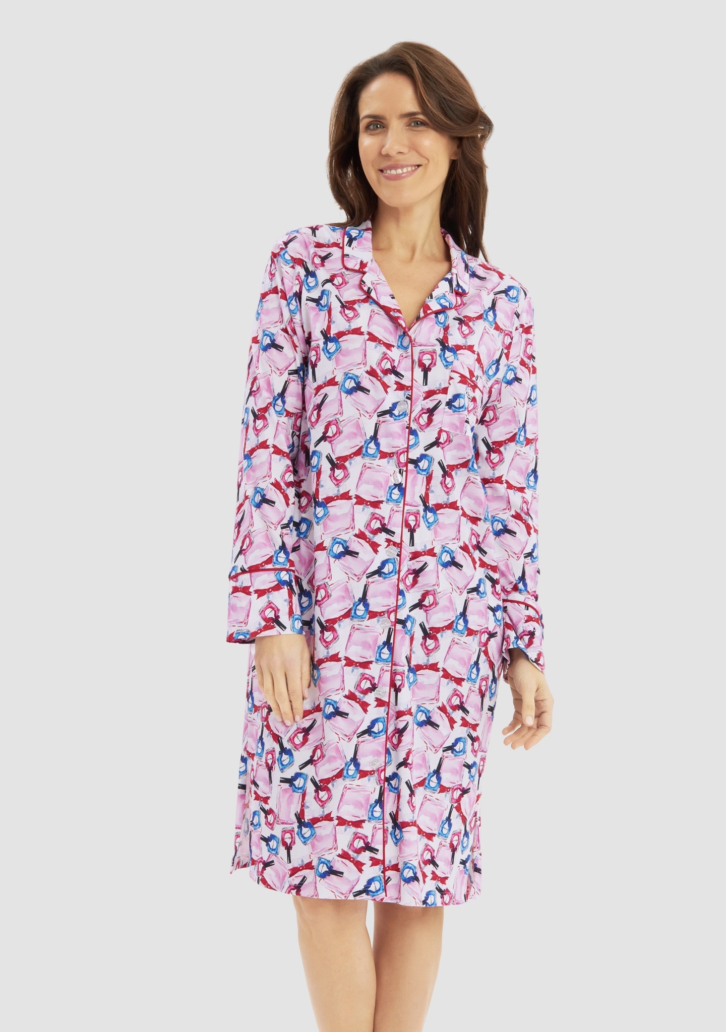 Симпатичный халат в мужском стиле на пуговицах с отложным воротником, длинными рукавами в розово-голубых тонах с принтом в виде разноцветных бутылочек лака для ногтей. Элегантный контрастный кант на воротнике, манжетах и нагрудном кармане придает халату стильный вид. Дополнительной деталью является декоративный вышитый логотип Féraud.