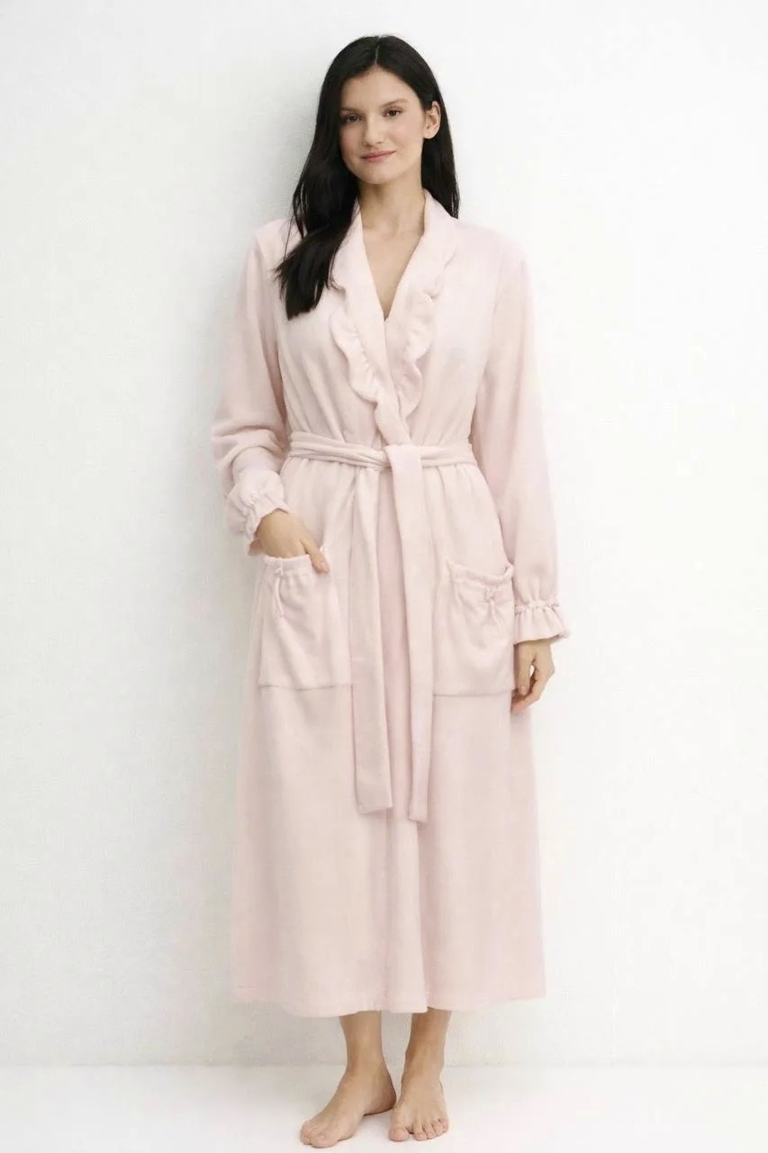 Великолепный тонкий трикотажный халат абрикосового цвета с широким воротником с декоративной кулиской. Рукава и карманы также украшены кулиской, которая создает романтический и утонченный образ. Благодаря кулиске, Вы можете по своему желанию регулировать размеры воротника, его форму и объем. Халат необыкновенно мягкий, приятный телу и обеспечивает высокий уровень комфорта.