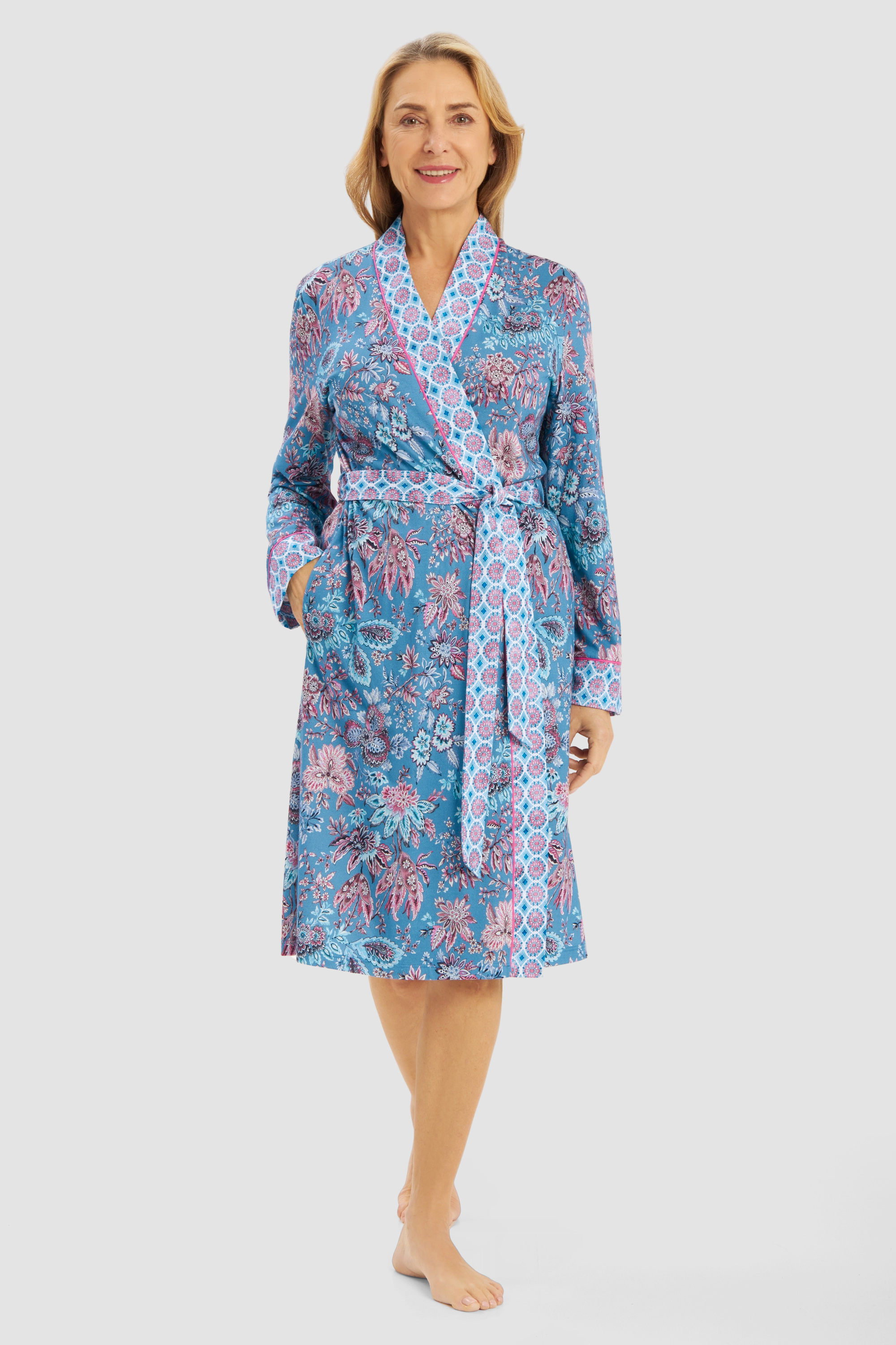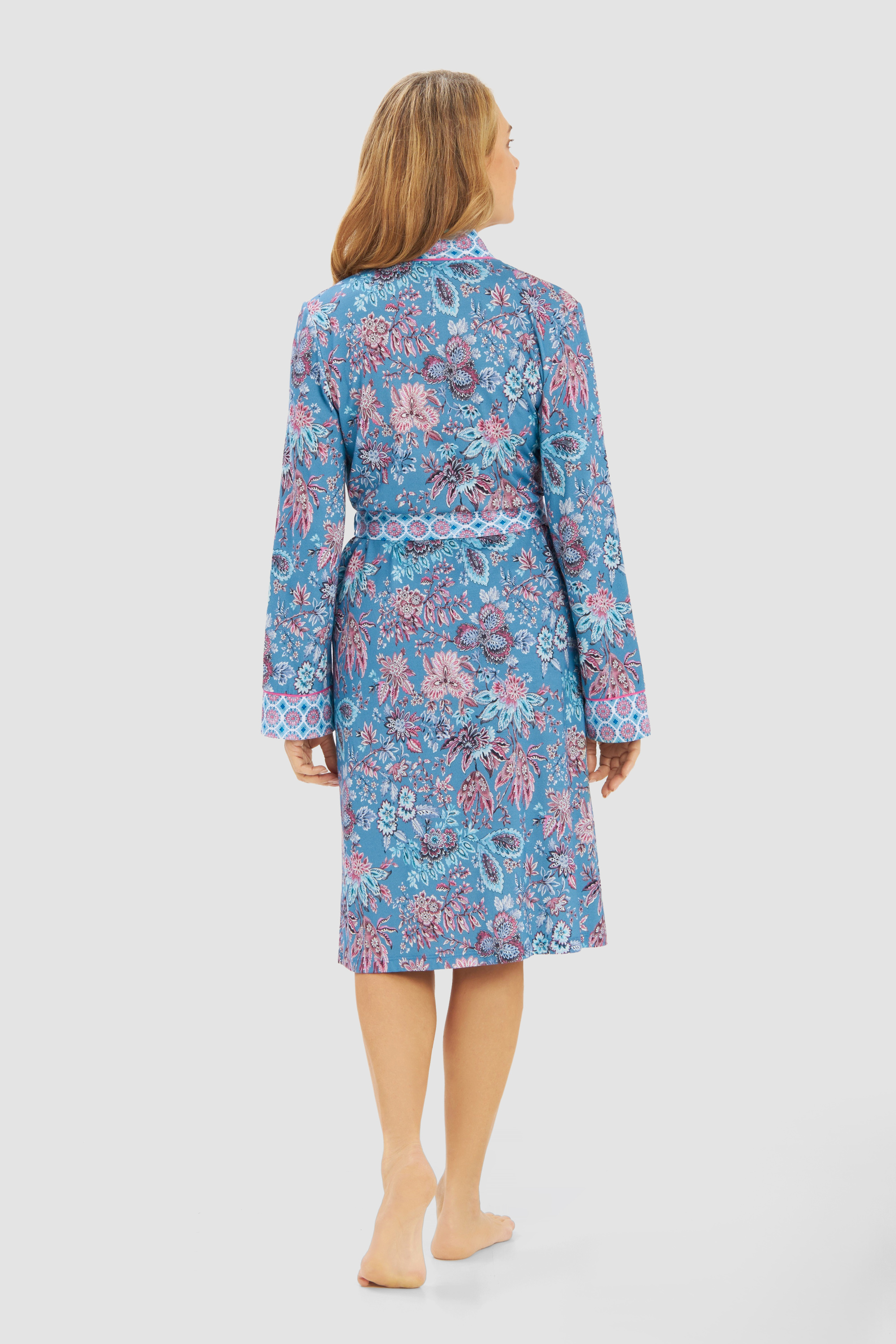 Великолепный халат с отделкой в тон ткани. Контрастная окантовка на рукавах и передней части, пояс и карманы. Идеальный спутник для отдыха дома – будь то чтение, отдых или уютные посиделки в компании друзей.