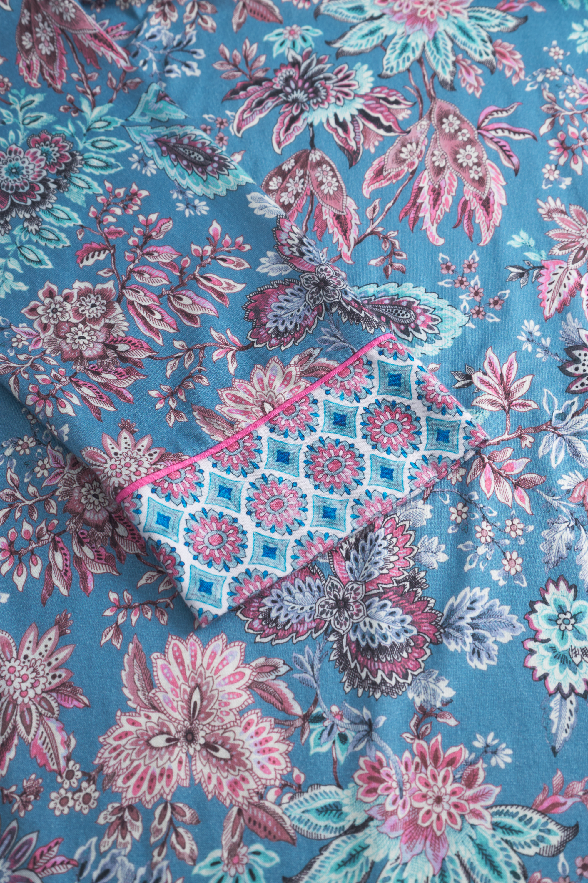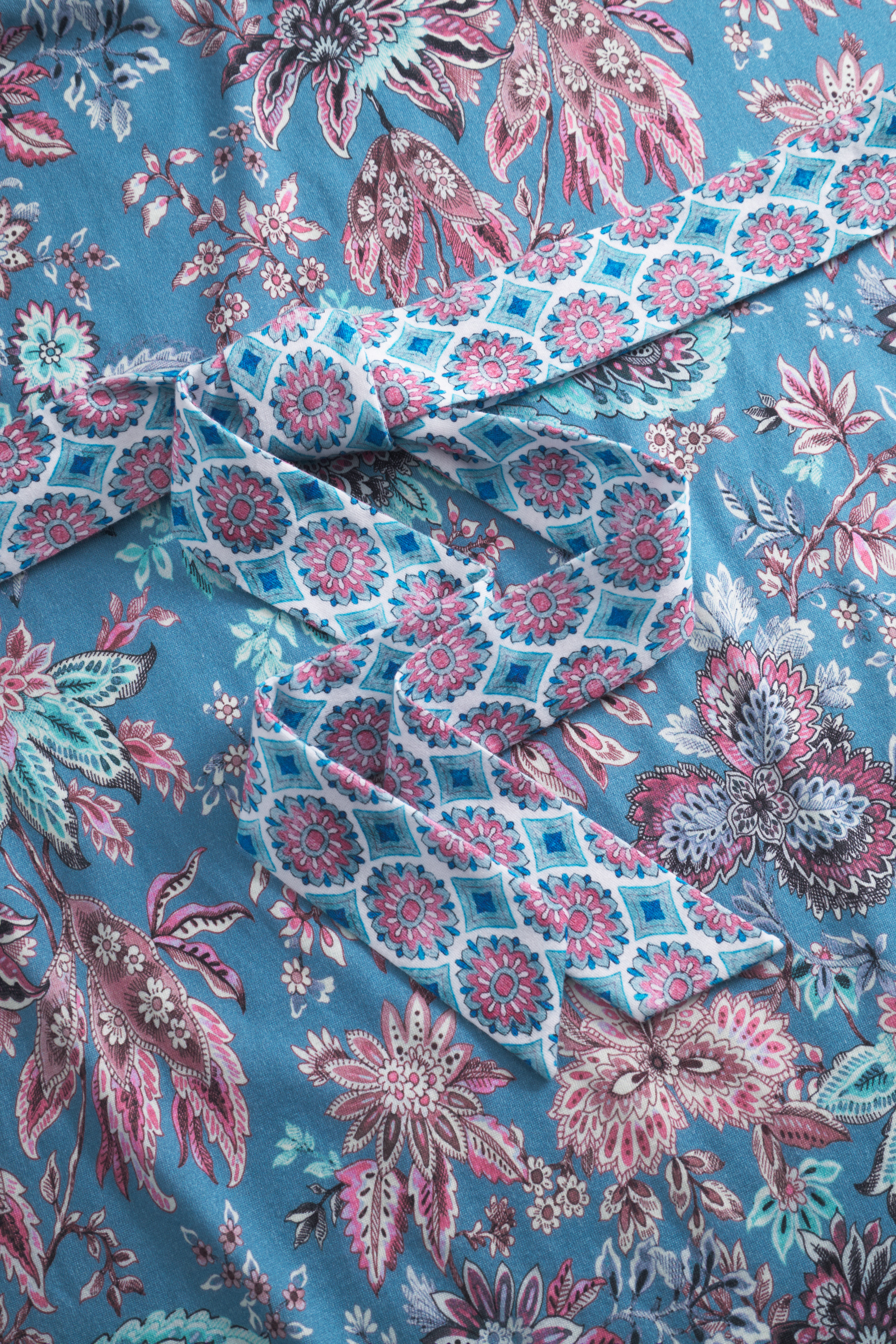 Красивая сорочка с круглым вырезом с декоративной отделкой, длинными рукавами и затейливым принтом из ткани в розово-голубых тонах.