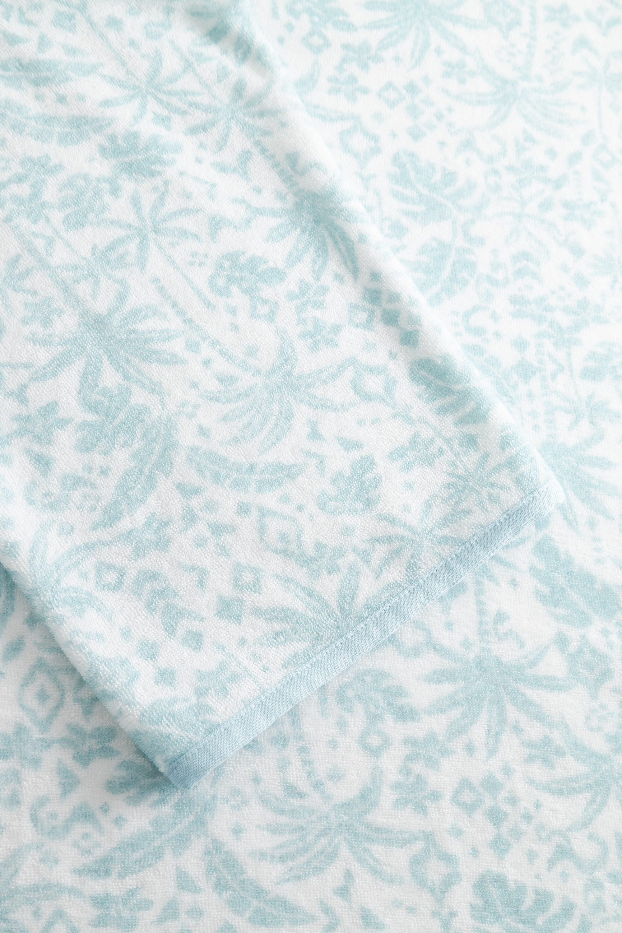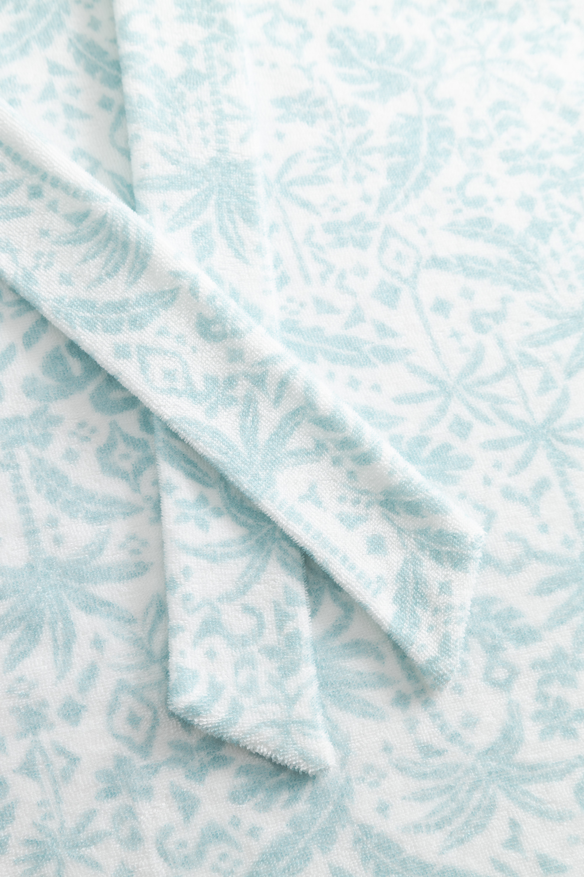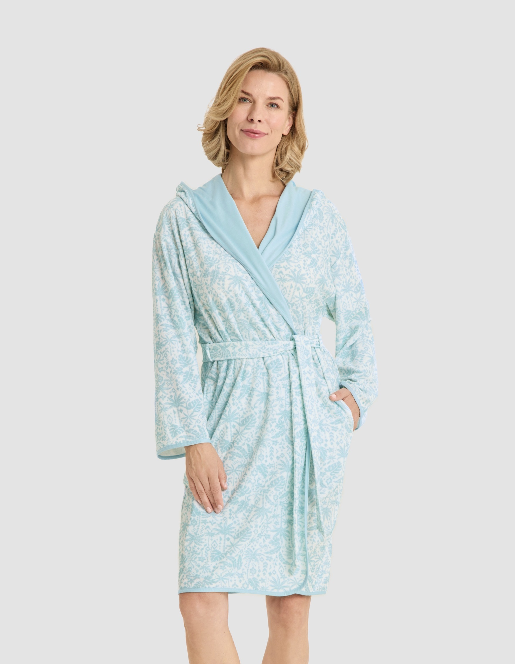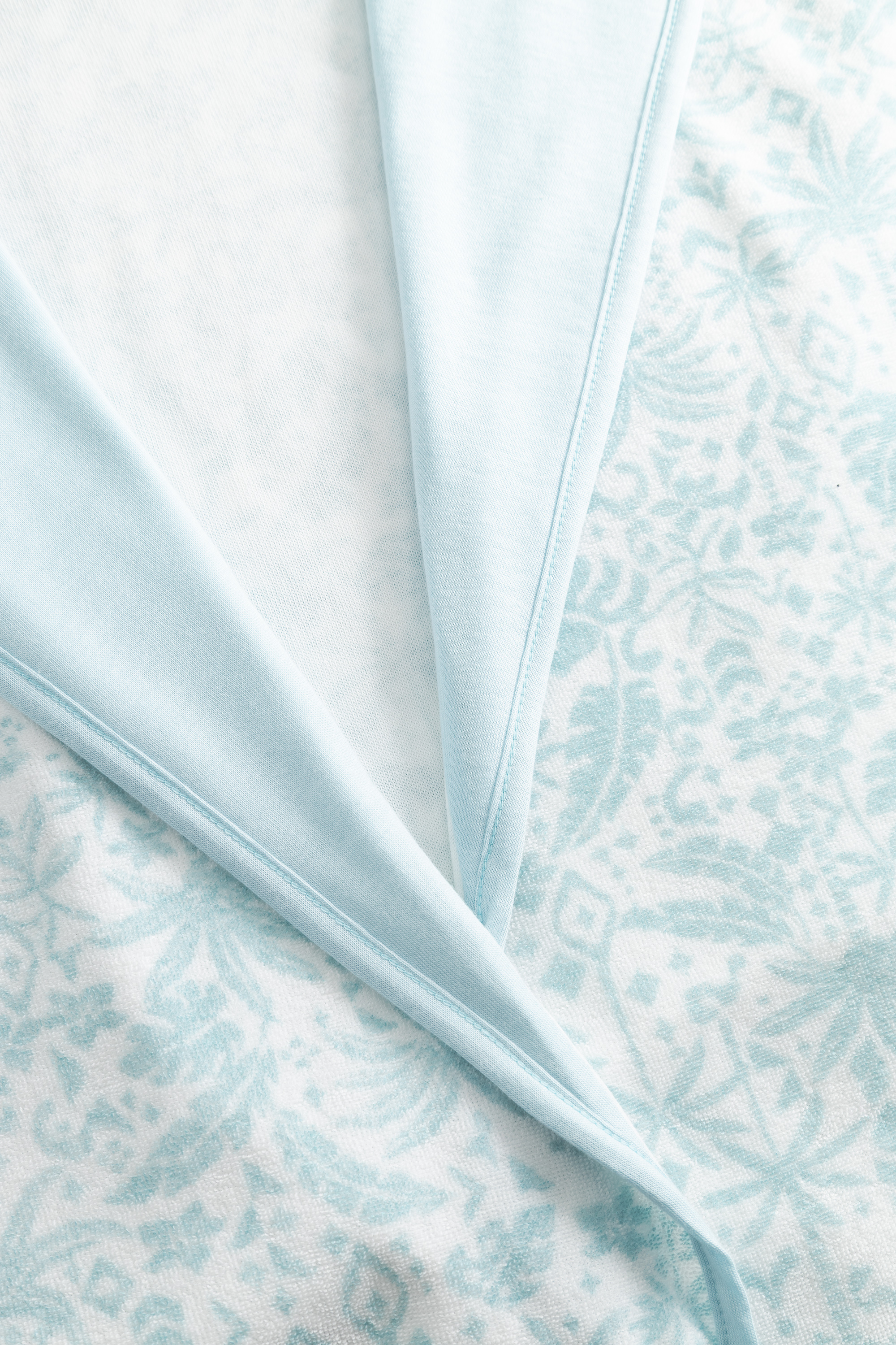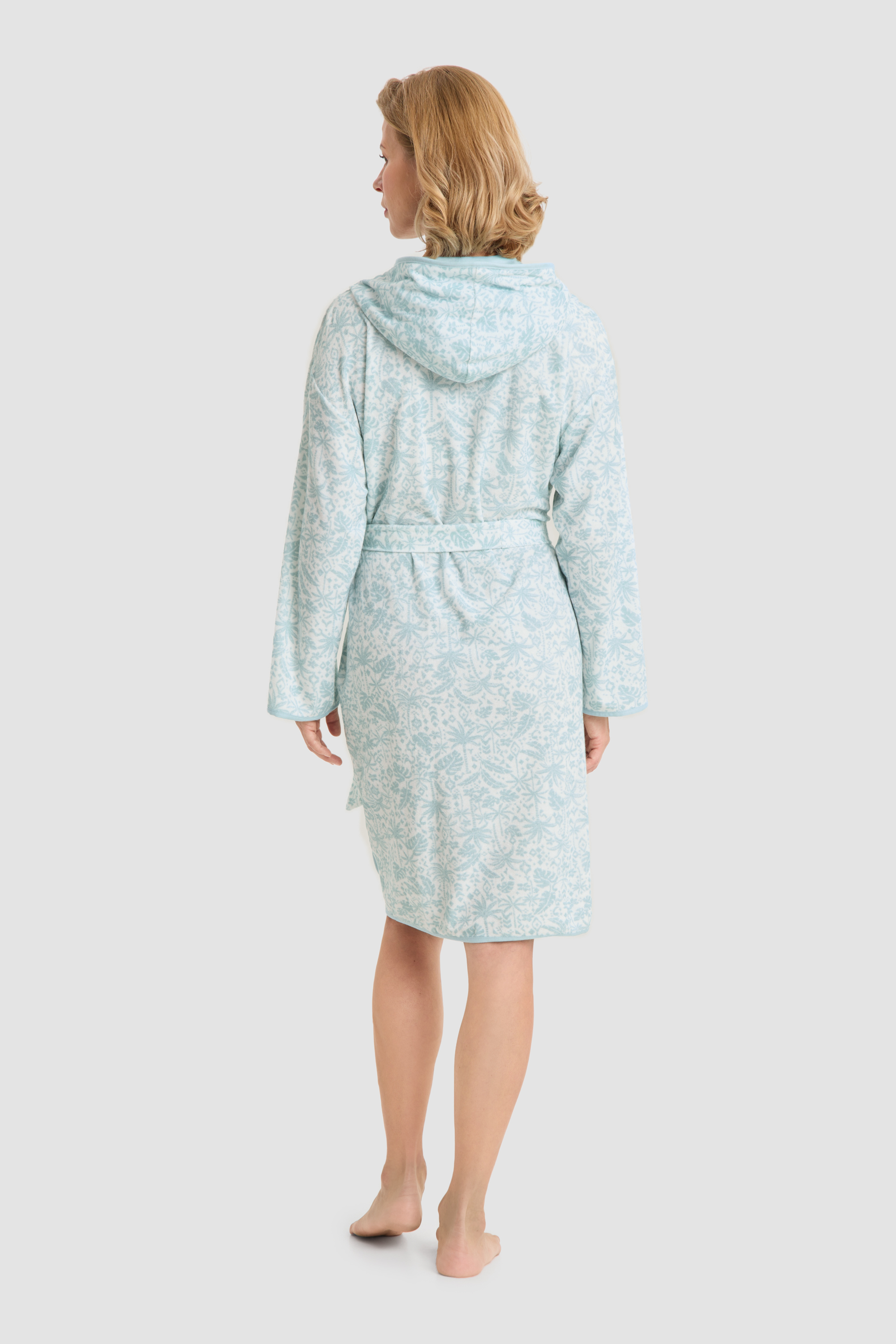 Тонкий трикотажный махровый халат с капюшоном, поясом и боковыми карманами в нежном бело-голубом цвете из мягкой ткани.