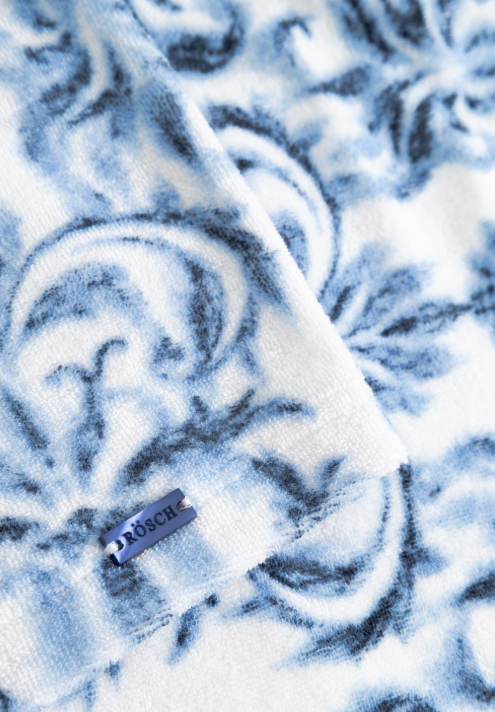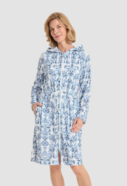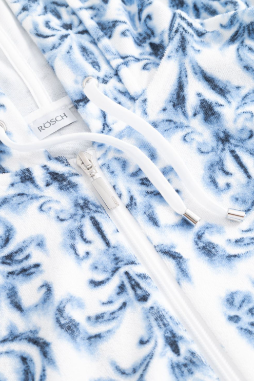 Великолепный халат с капюшоном, боковыми карманами, двусторонней молнией и кулиской на талии из тонкой махровой ткани с волшебными цветами гибискуса в бело-голубых тонах.