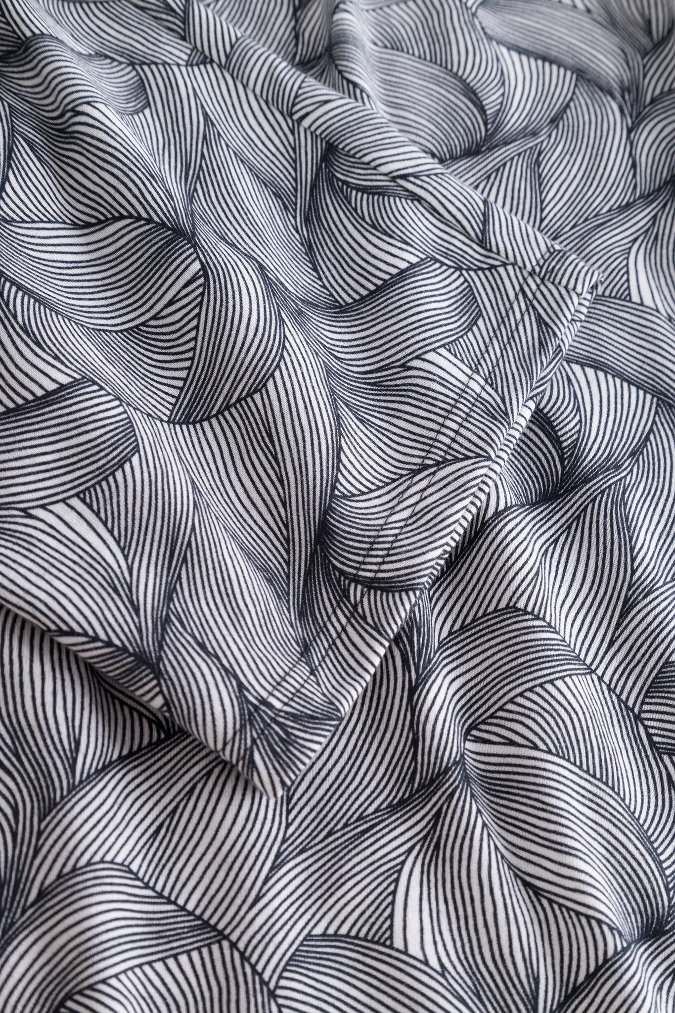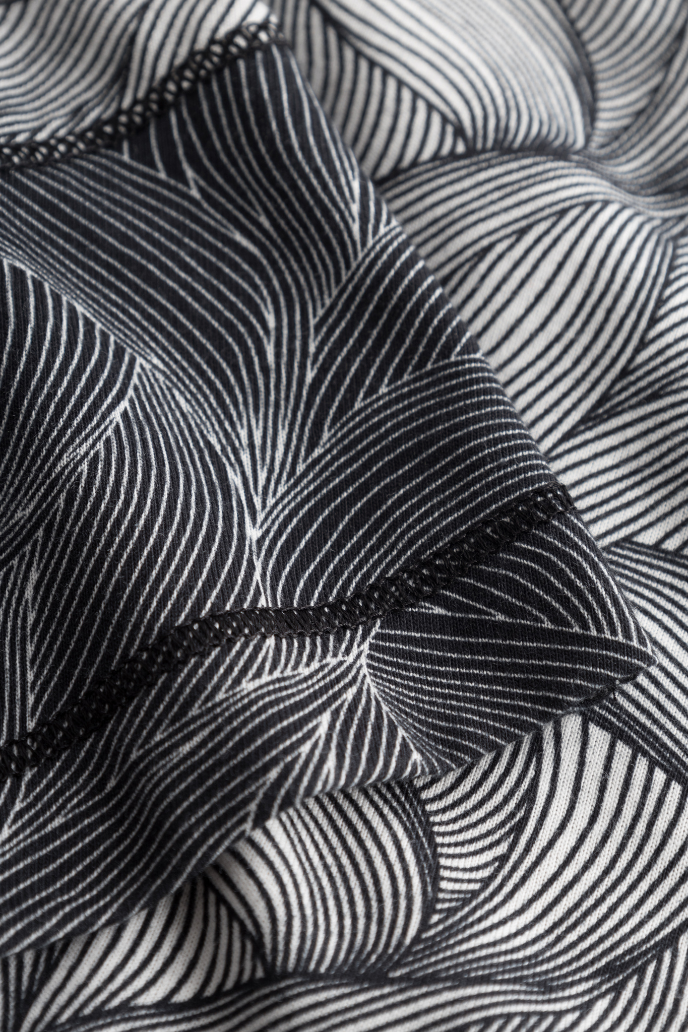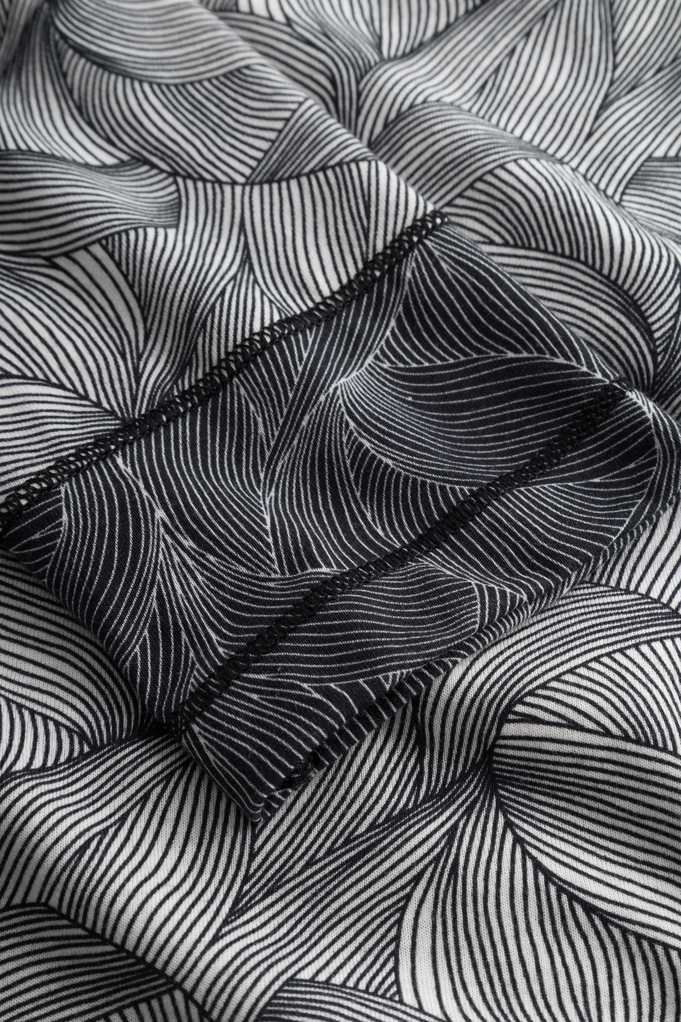 Домашний костюм в сочетании черно-белого узора с контрастной окантовкой горловины и декоративной строчкой соответствующего цвета. Брюки длинные из набивной ткани с комбинированным узором, карманами и удобным поясом