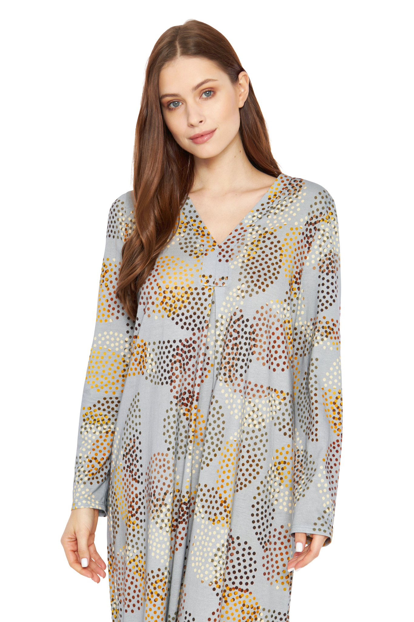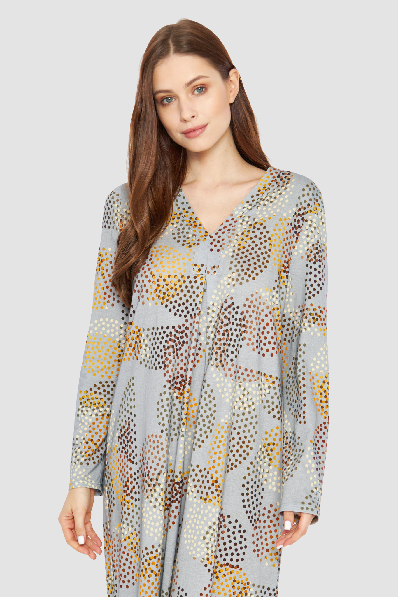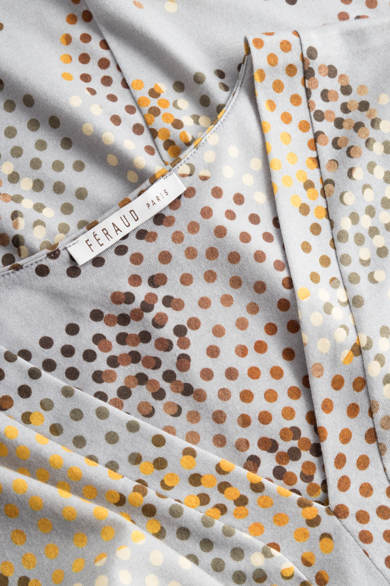Роскошная сорочка с V-образным вырезом, складкой спереди, длинными рукавами и необычным принтом в виде разноцветных горошин. На рукаве вышит логотип Féraud.