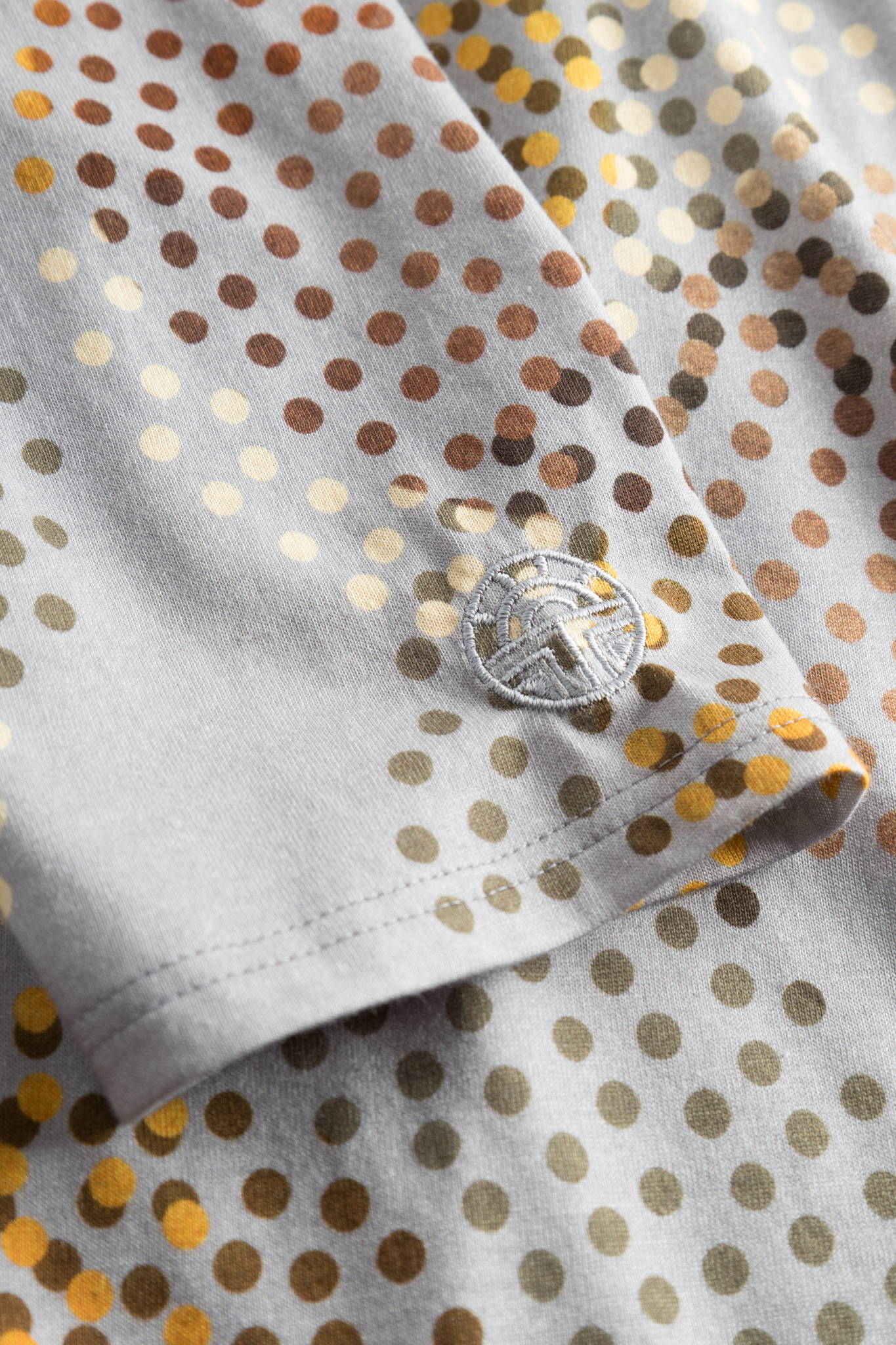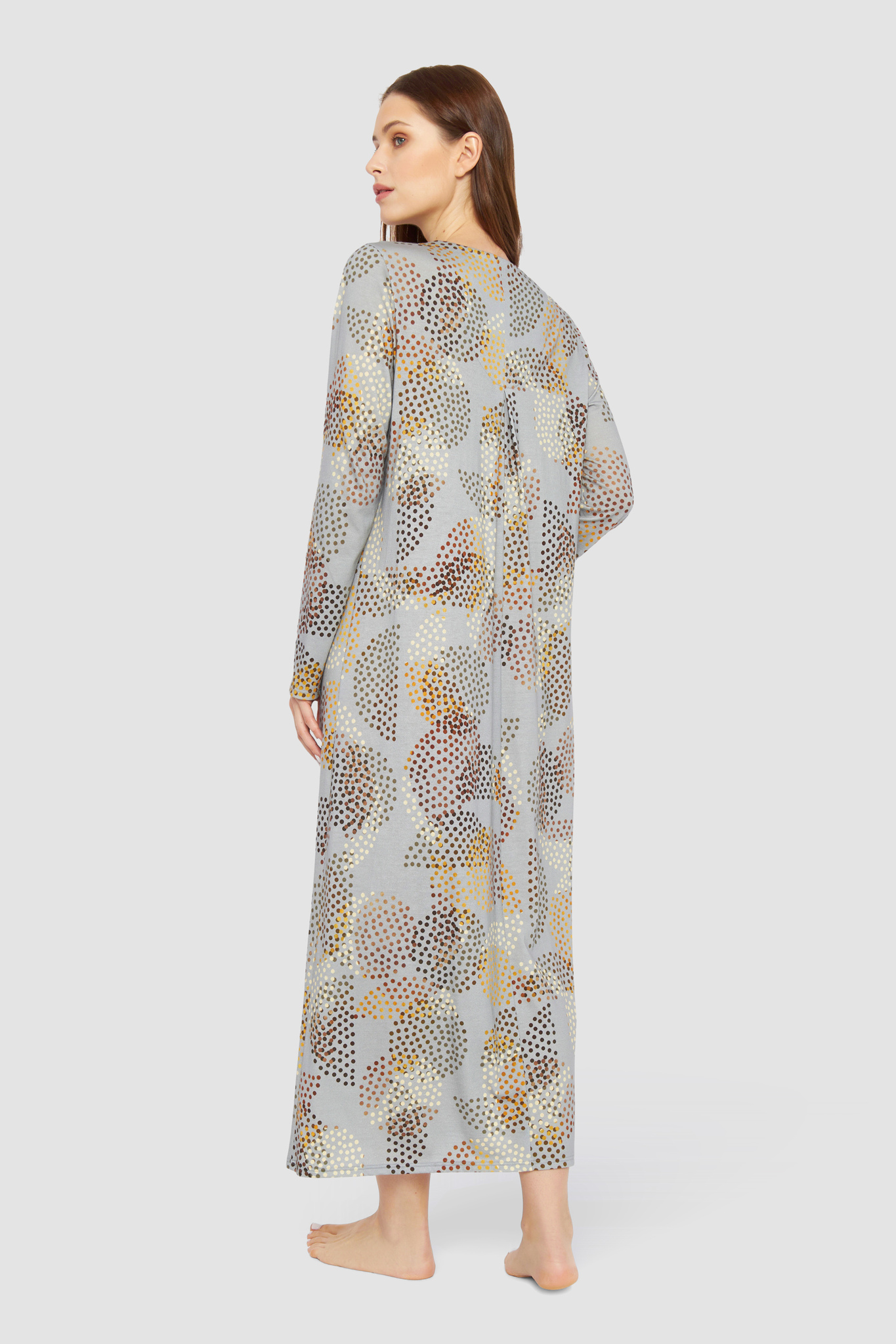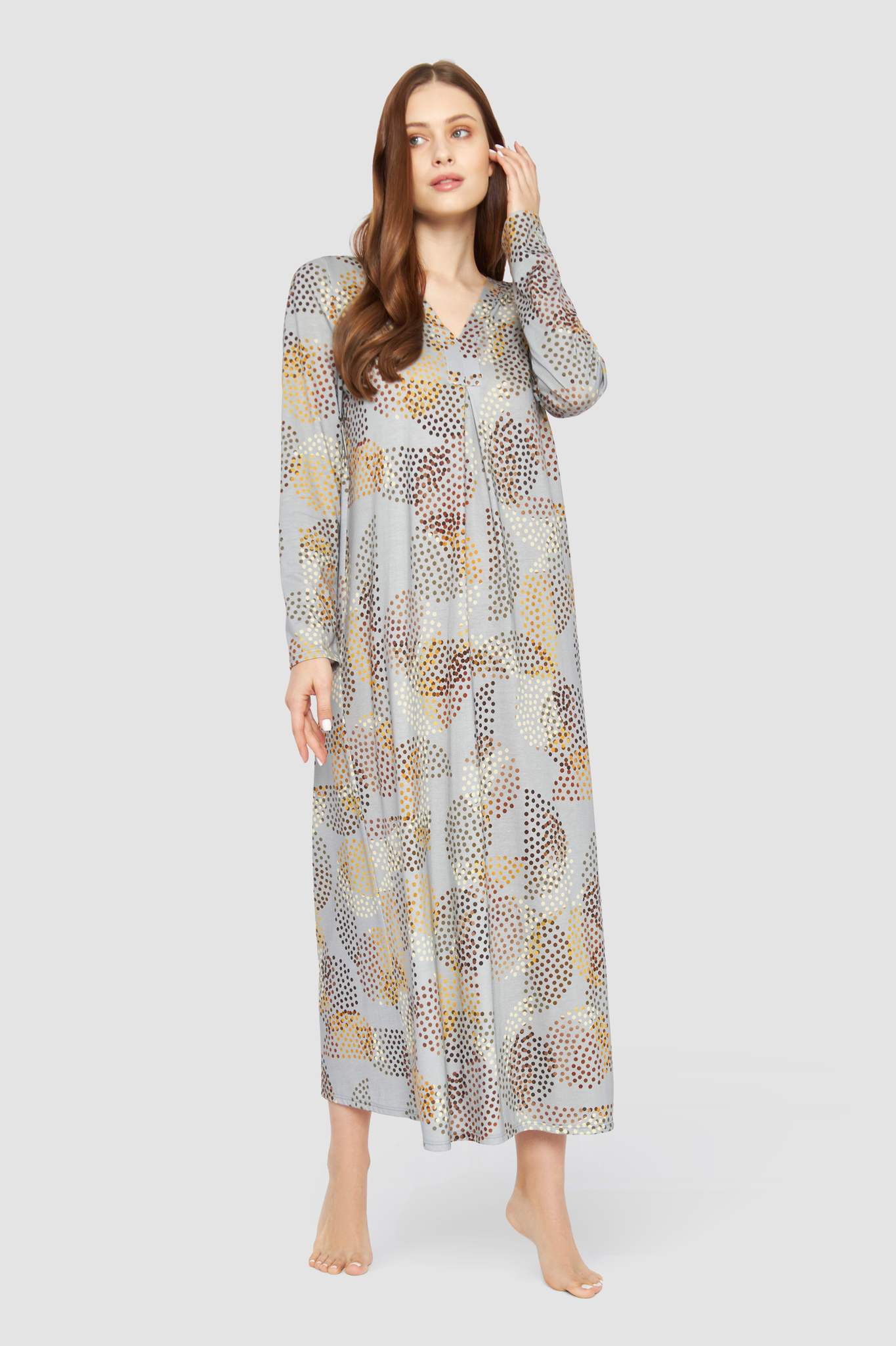 Роскошная сорочка с V-образным вырезом, складкой спереди, длинными рукавами и необычным принтом в виде разноцветных горошин. На рукаве вышит логотип Féraud.