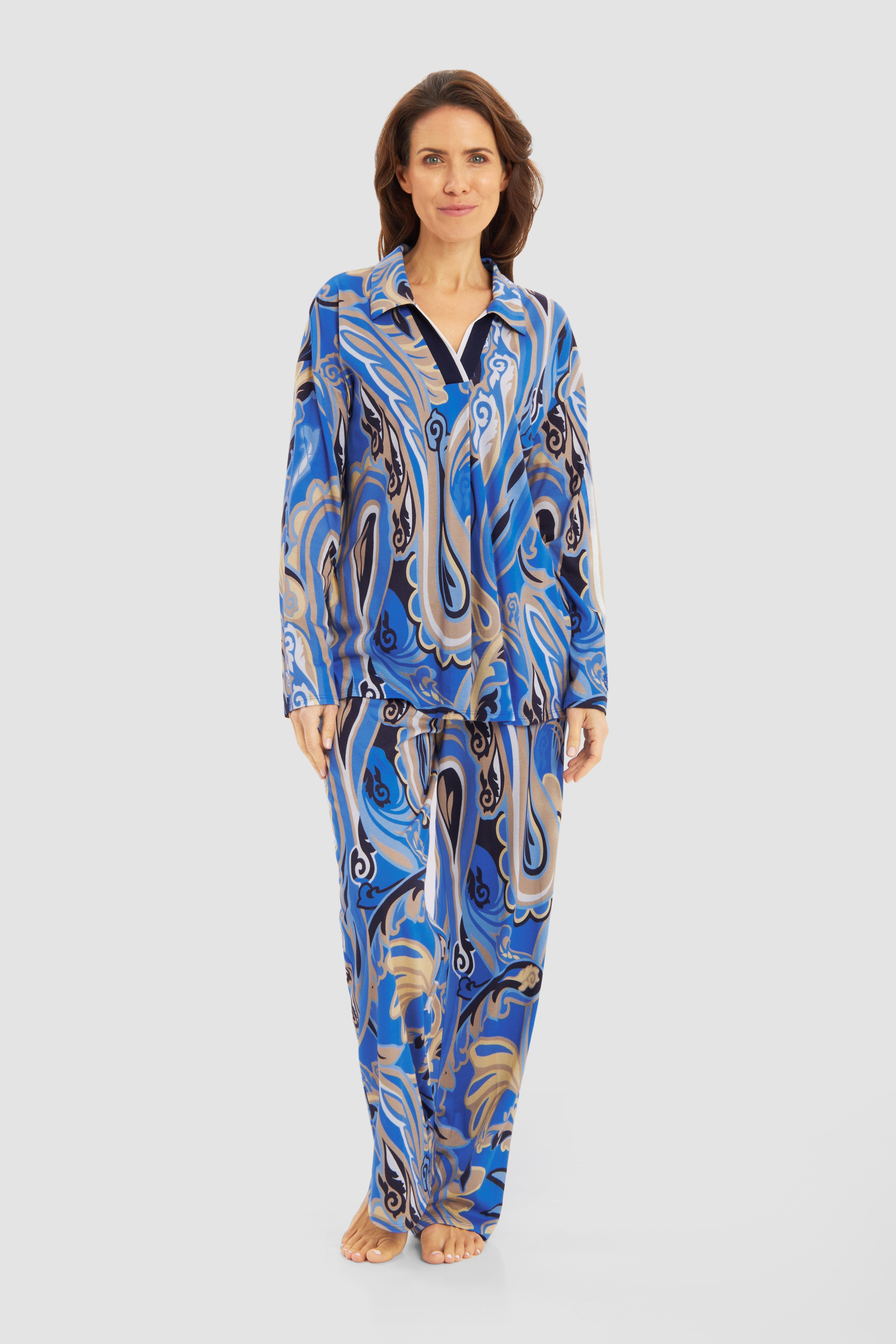 Дивная трикотажная пижама/костюм с воротником и V-образным вырезом с декоративной отделкой, длинными рукавами и роскошным замысловатым принтом в сине-бежевых тонах. Этот красивый костюм осенним дождливым вечером напомнит Вам о солнце, море, летнем отдыхе и подарит Вам радость и уют.