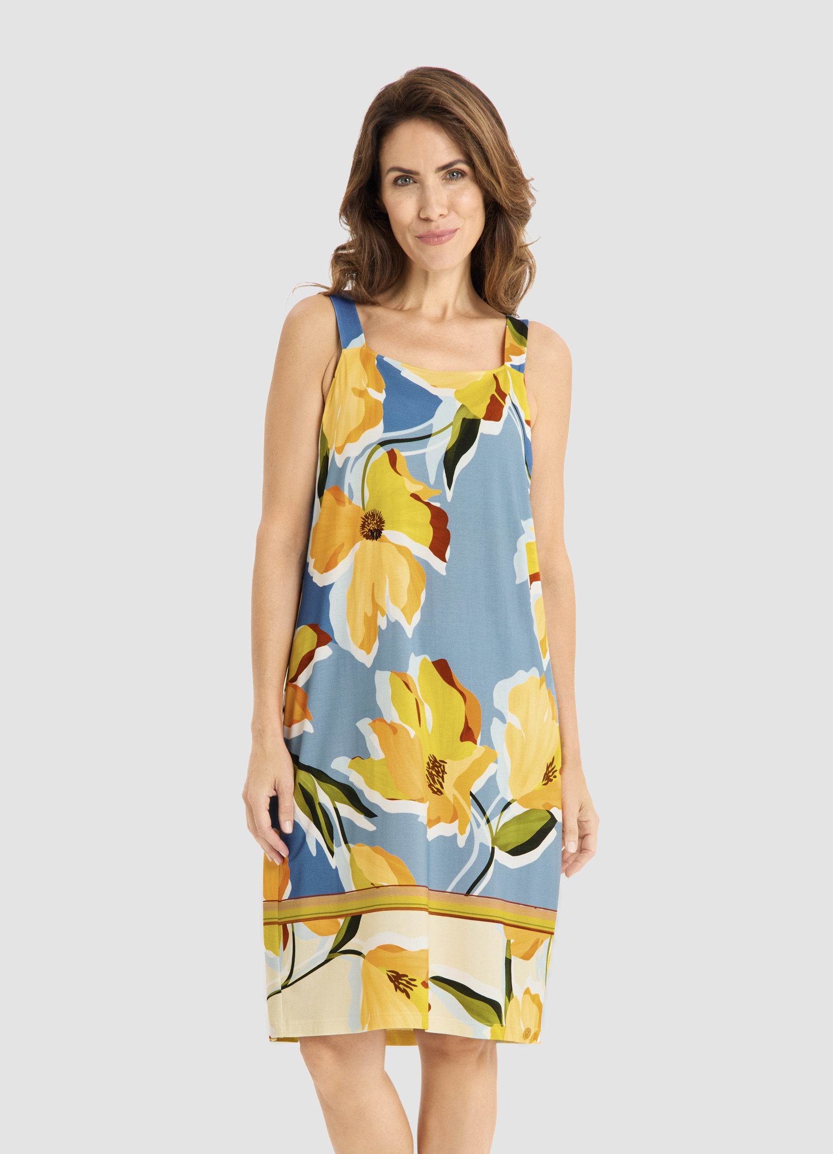 Дивное трикотажное платье на бретелях с лифом внутри и резинкой под грудью с ярким цветочным принтом.