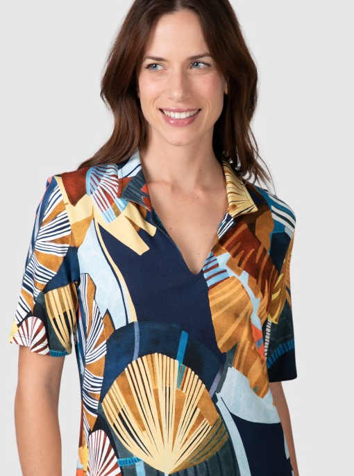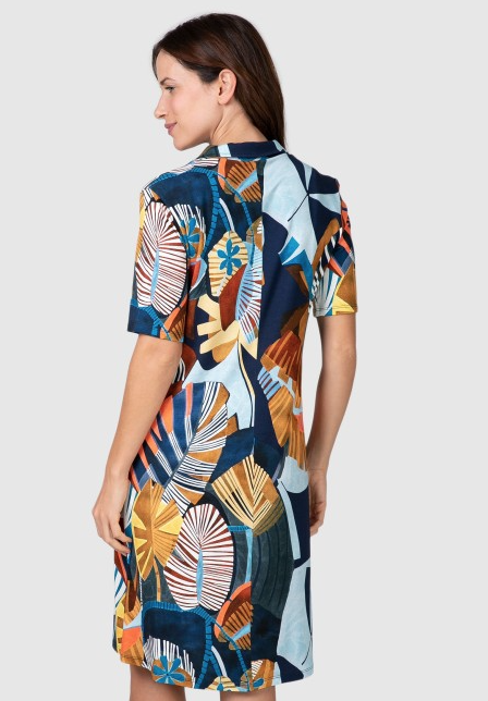 Дивное платье с V-образным вырезом и маленьким отложным воротничком с короткими рукавами и принтом в виде стилизованных пальмовых листьев. В этом платье вам будет необыкновенно комфортно в жару благодаря гигроскопичной вискозе, хорошо впитывающей влагу, оптимальной длине платья и удобным рукавам.