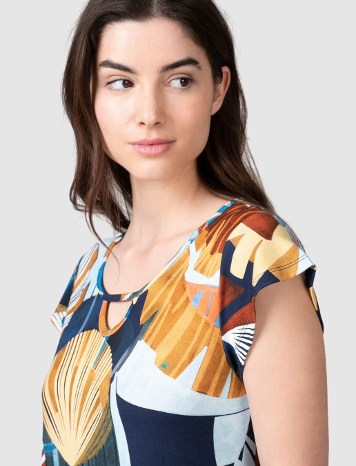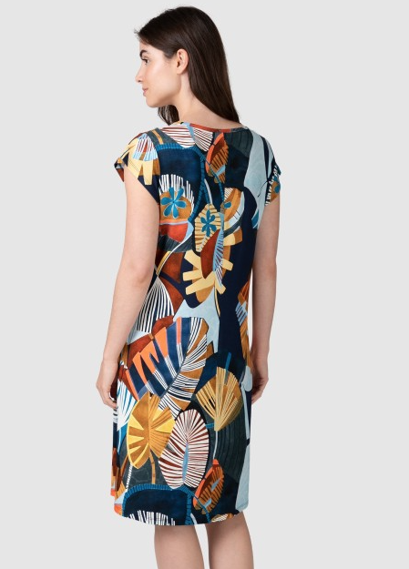 Дивное платье с круглым вырезом и вырезом "капелька" короткими рукавами и принтом в виде стилизованных пальмовых листьев. Мягкая, слегка эластичная ткань обеспечивает естественную посадку, комфорт, легкость и свободу движений.