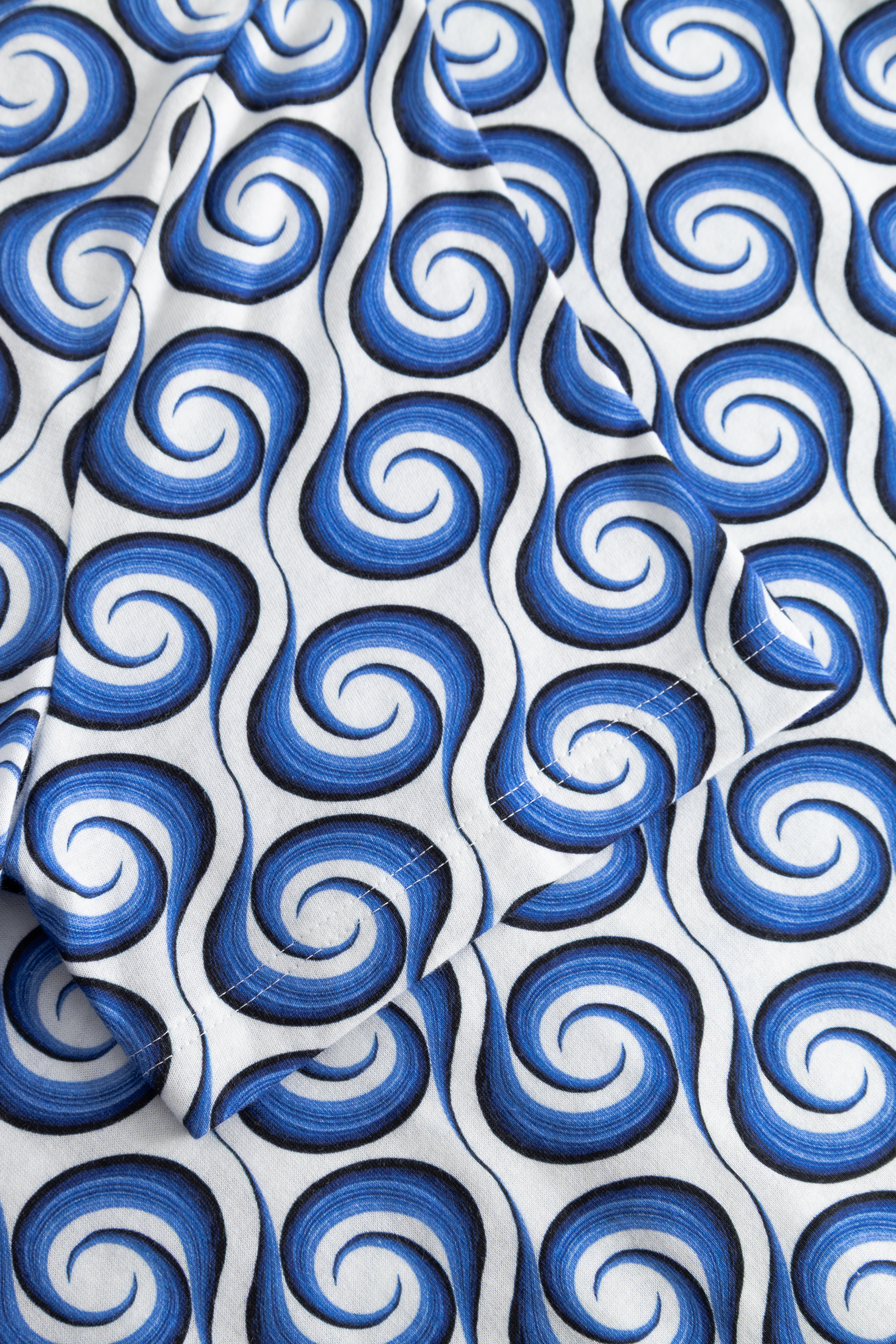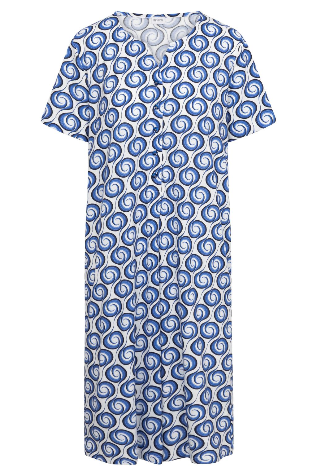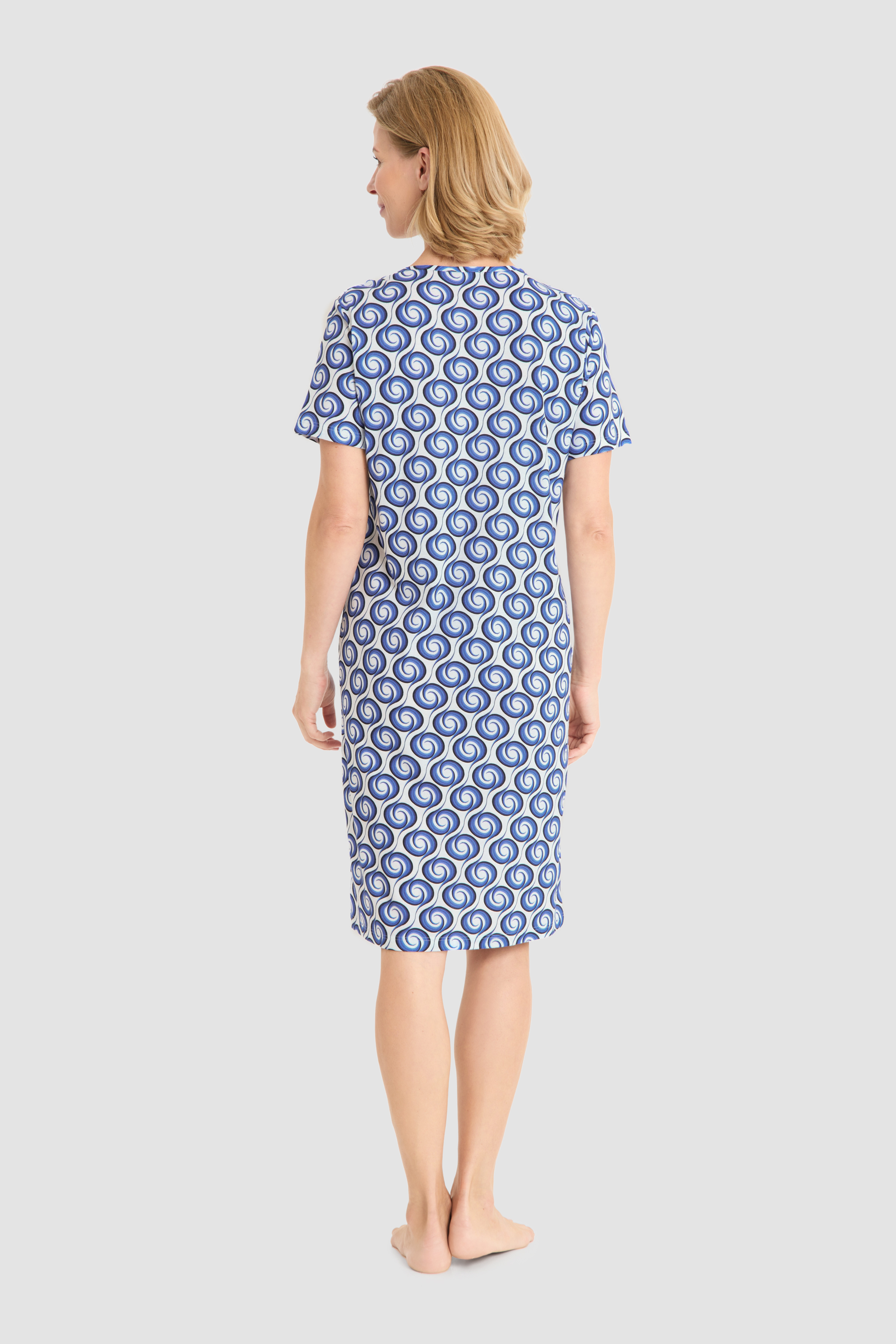 Стильная пижама/костюм с фигурным V-образным вырезом с застежкой-поло, встречной складкой спереди, короткими рукавами и графическим принтом в сине-белых тонах. Однотонные длинные брюки с эластичным поясом дополняют элегантный образ. Эта пижама/костюм -прекрасный вариант и для дома, и для сна.Длина 65 смСостав 50% хлопок 50% модал