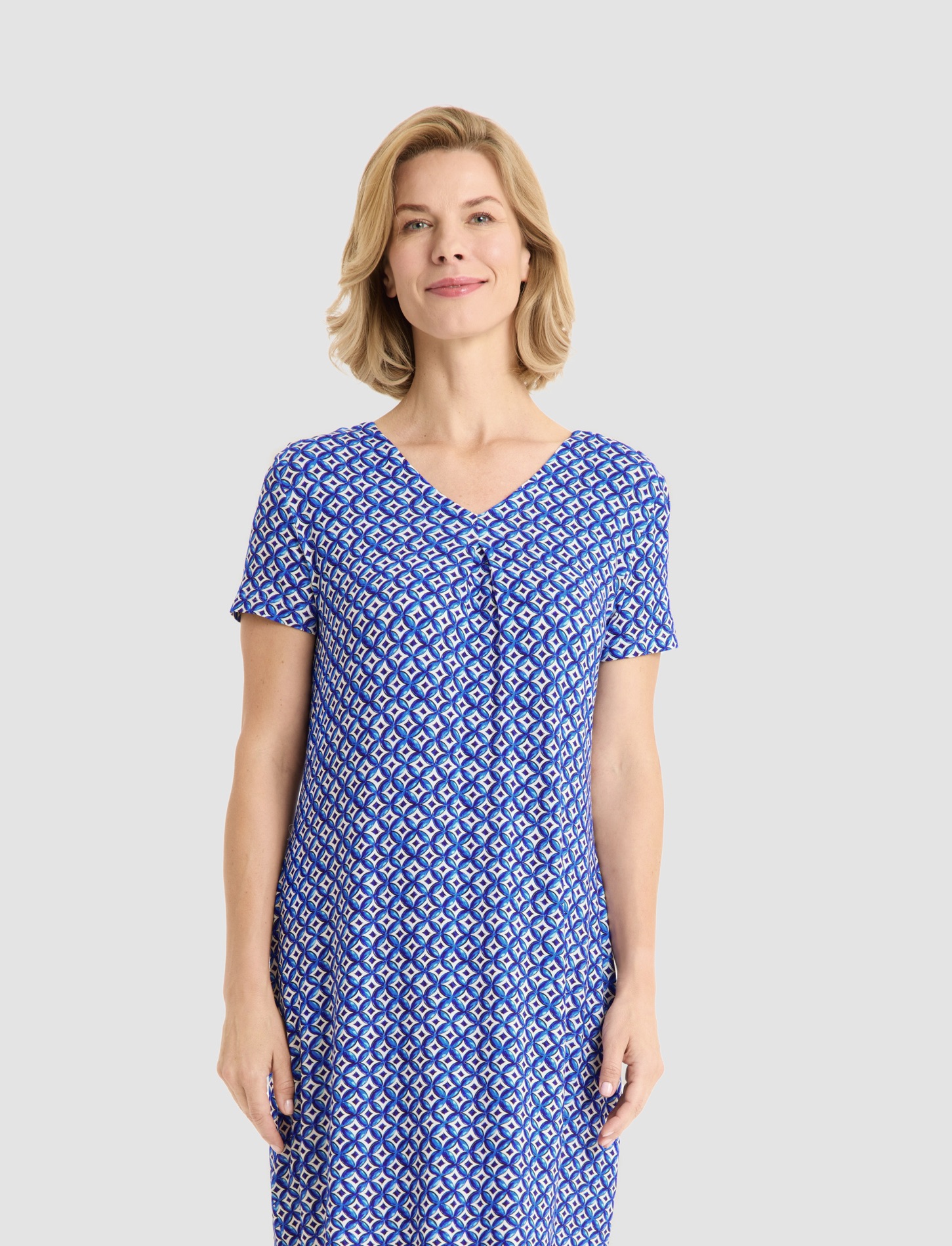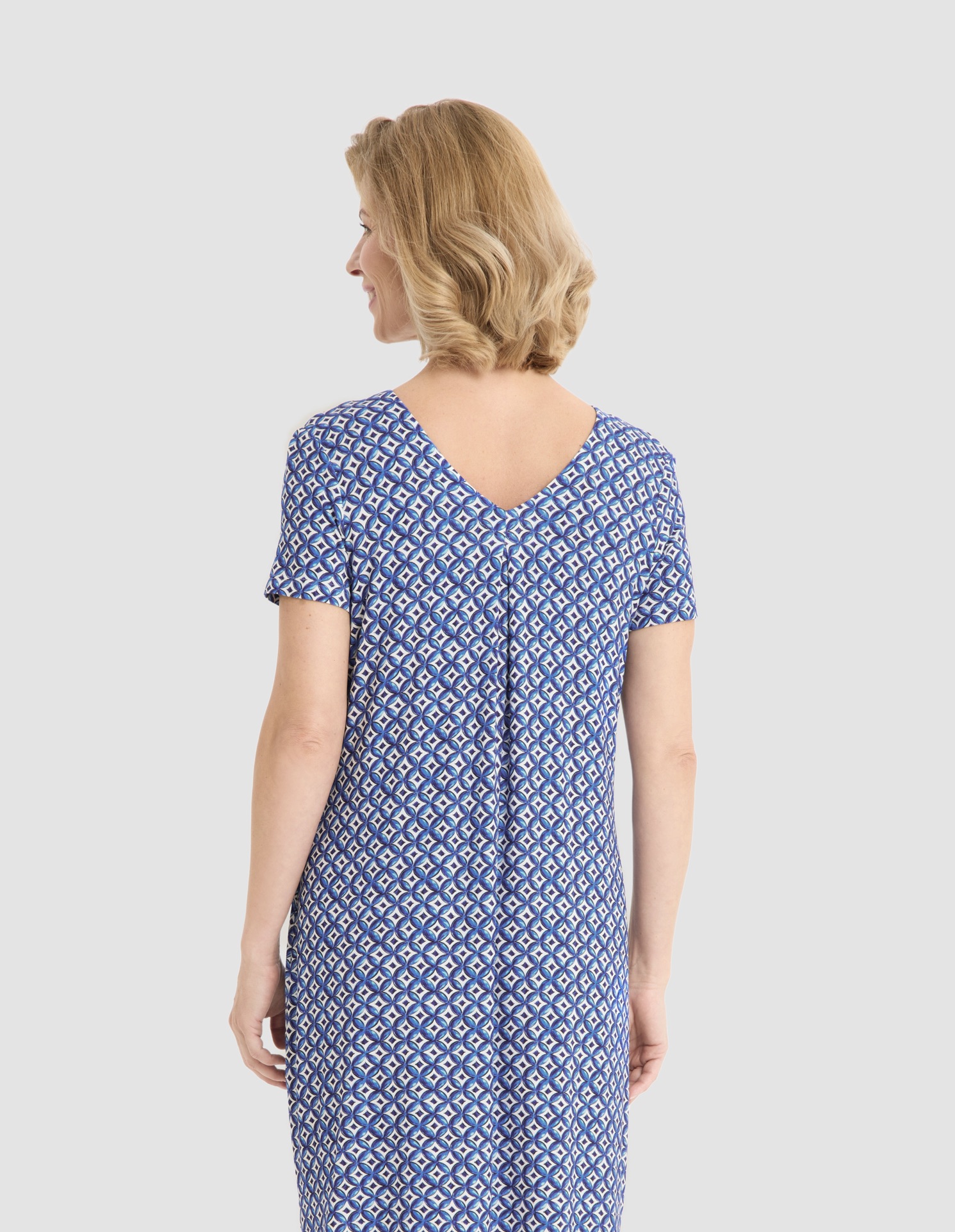 Необыкновенно красивое трикотажное платье с короткими рукавами, с V-образным вырезом и встречной складкой спереди и сзади с потрясающим графическим принтом в виде картинок калейдоскопа.Длина 95 смСостав 95% вискоза 5% эластан