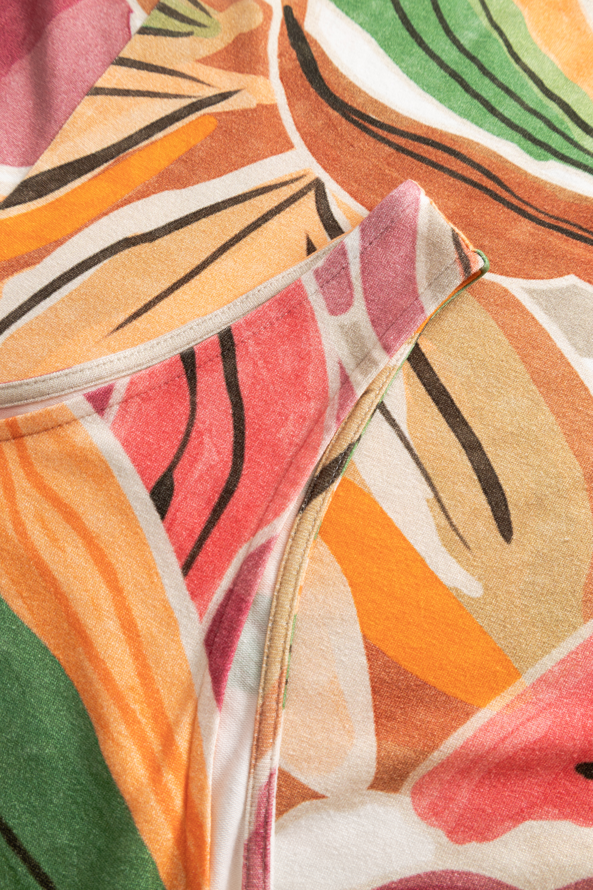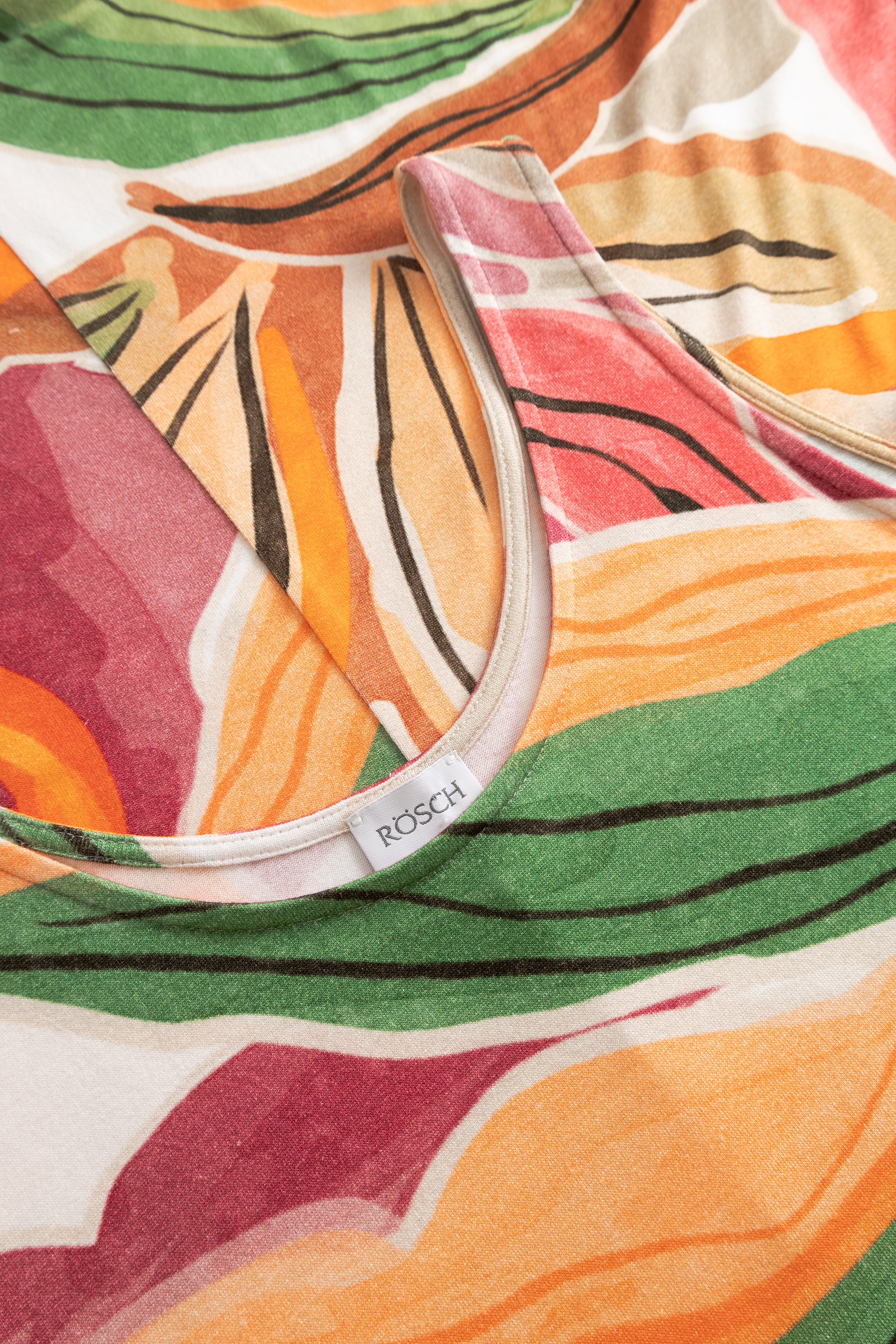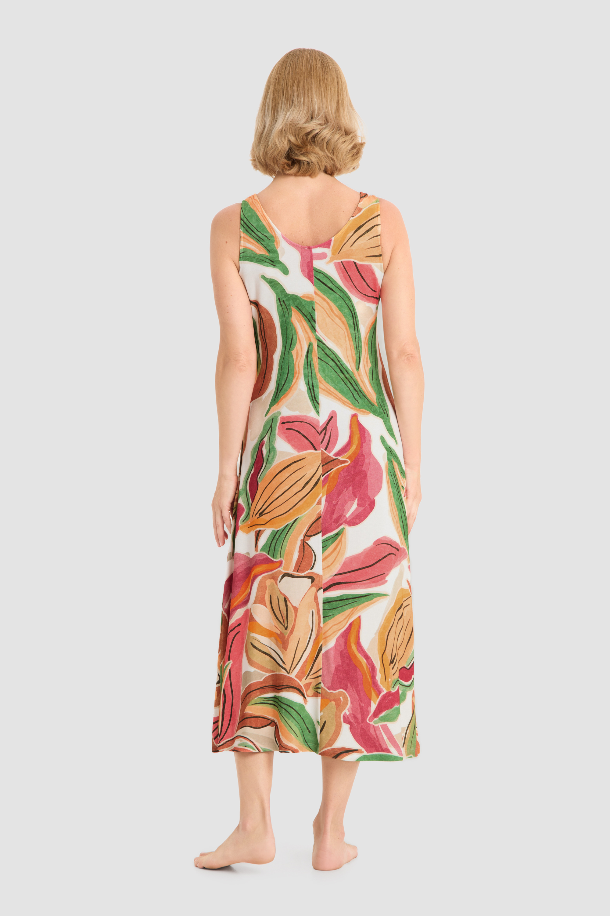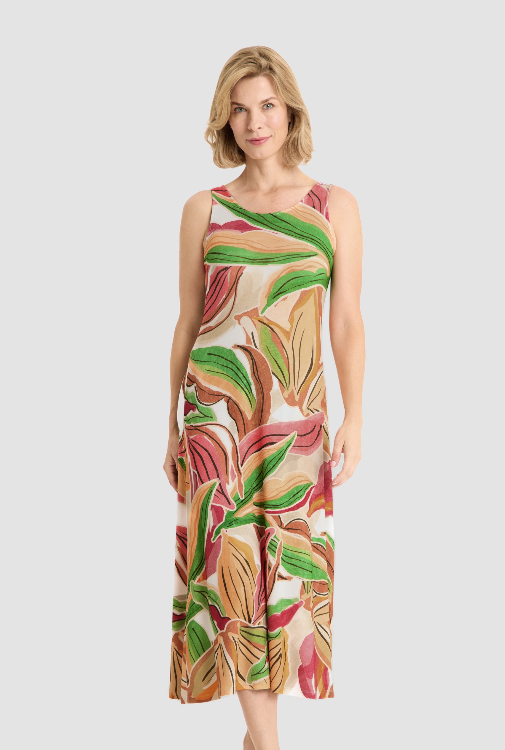Необыкновенно красивое платье А-силуэта без рукавов с принтом из тропических растений.Длина 125 смСостав 95% вискоза 5% эластан