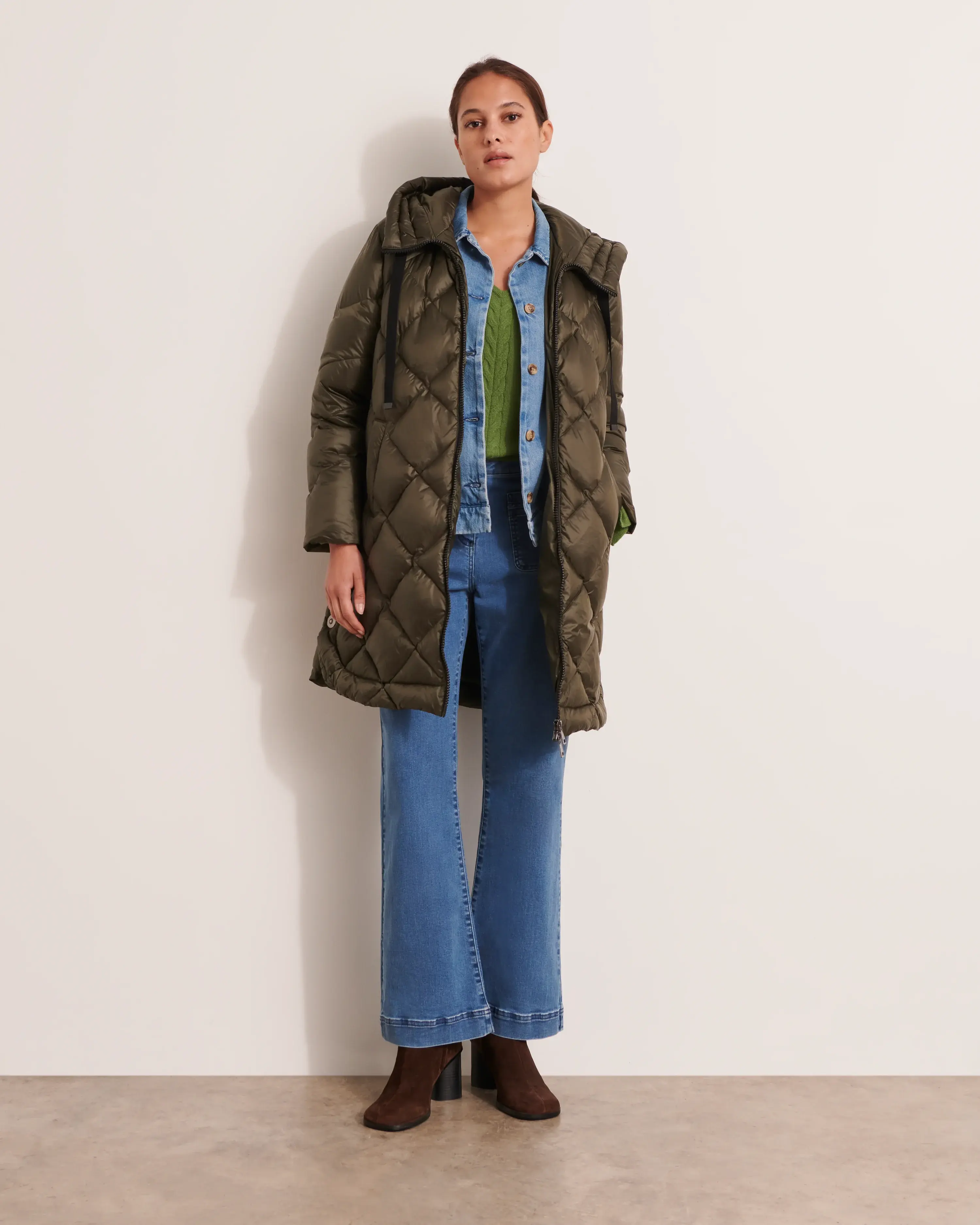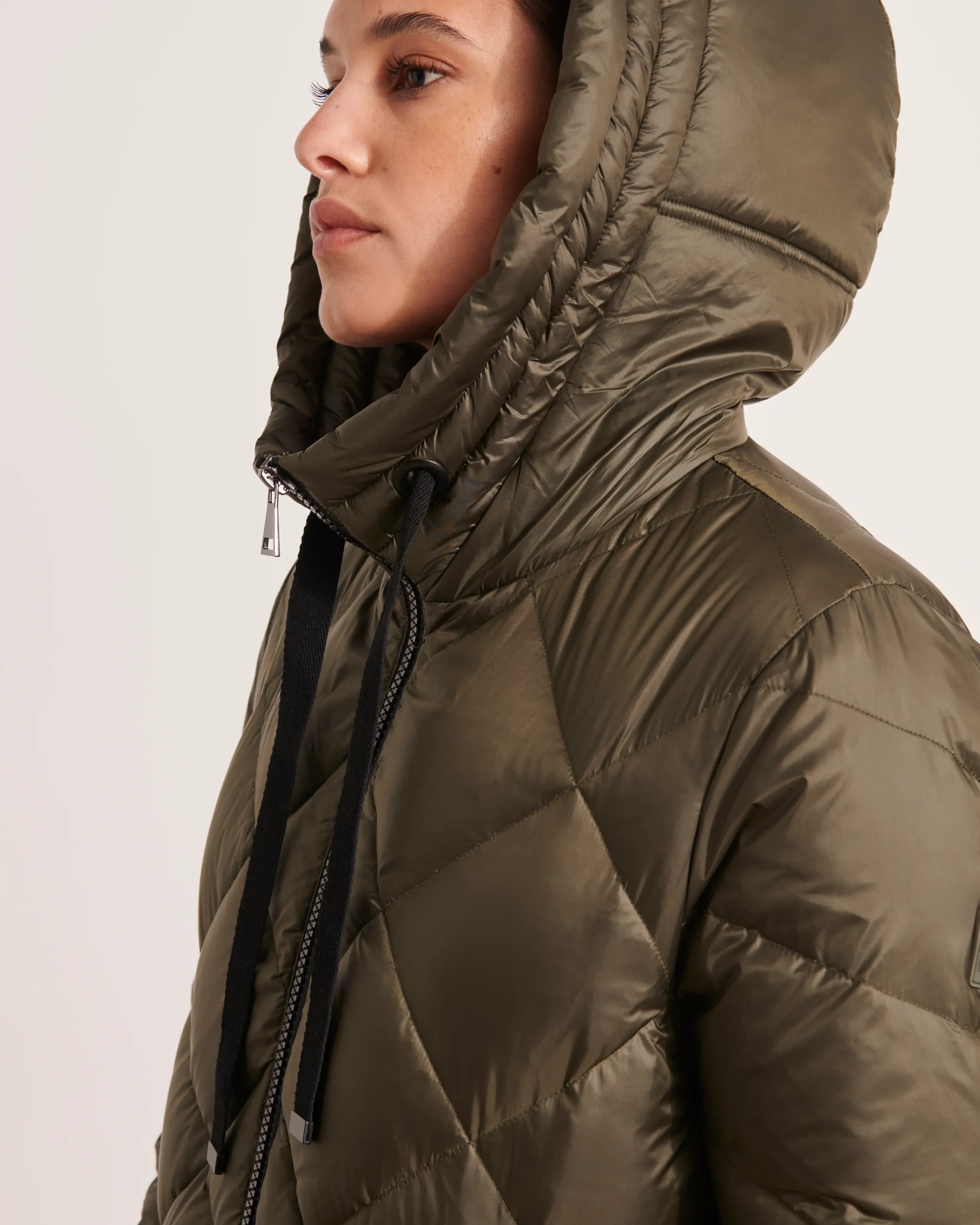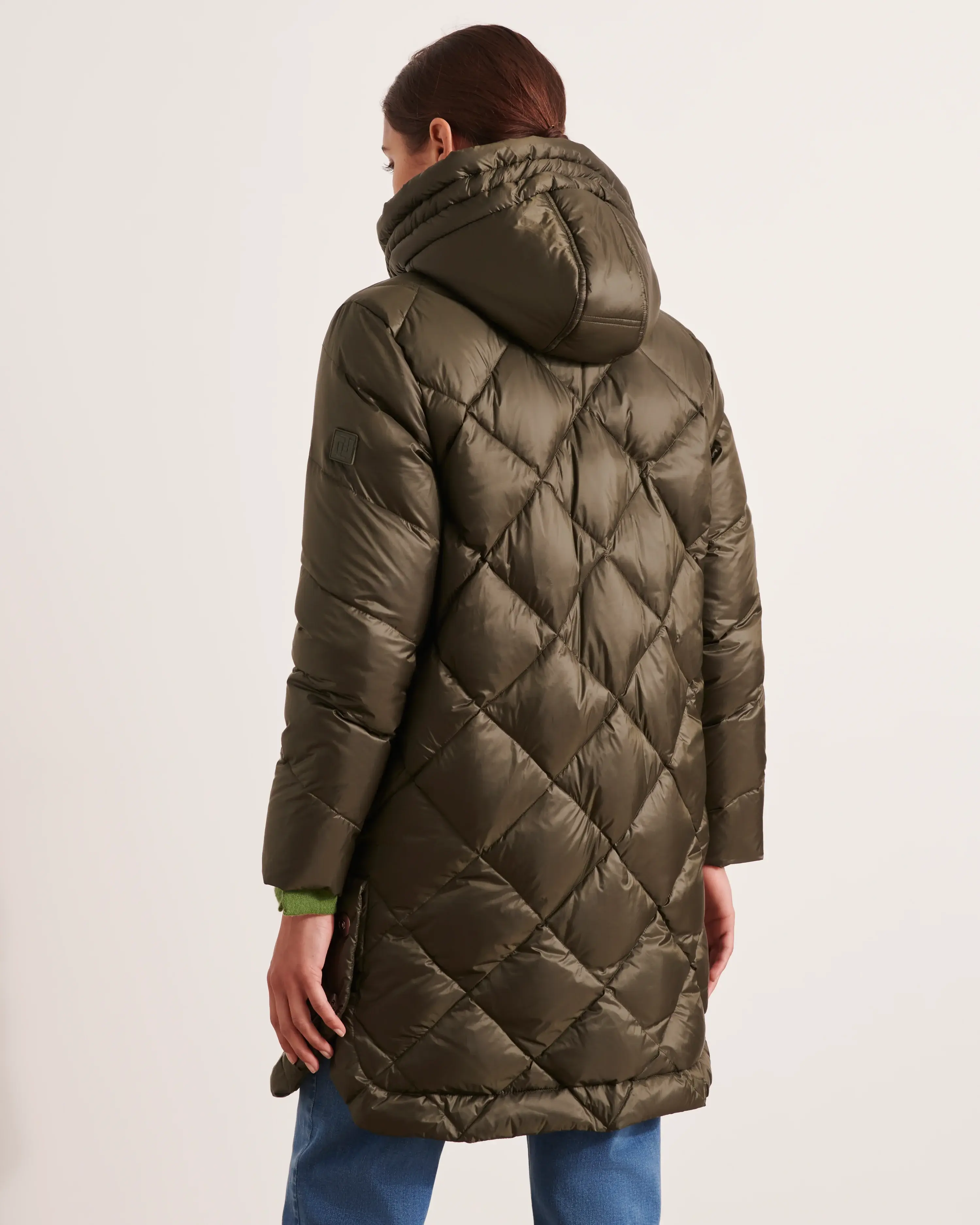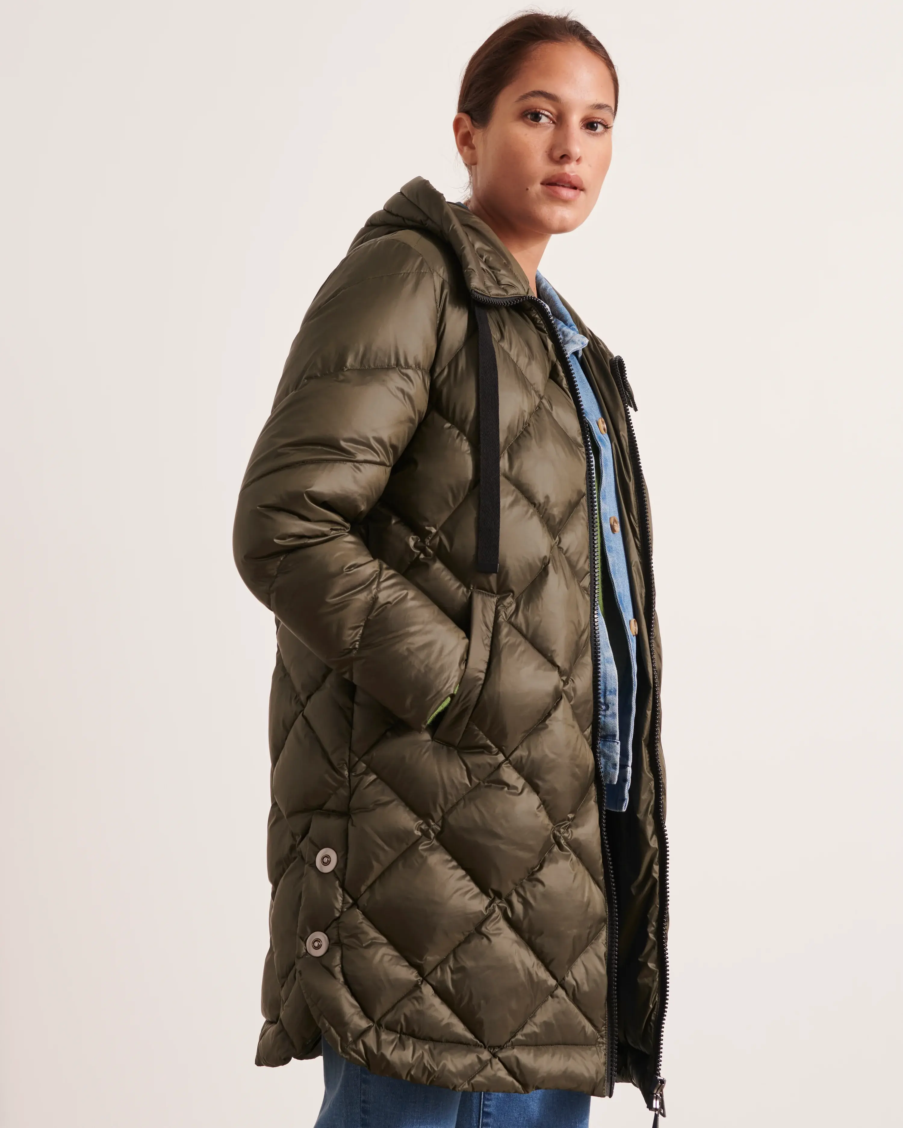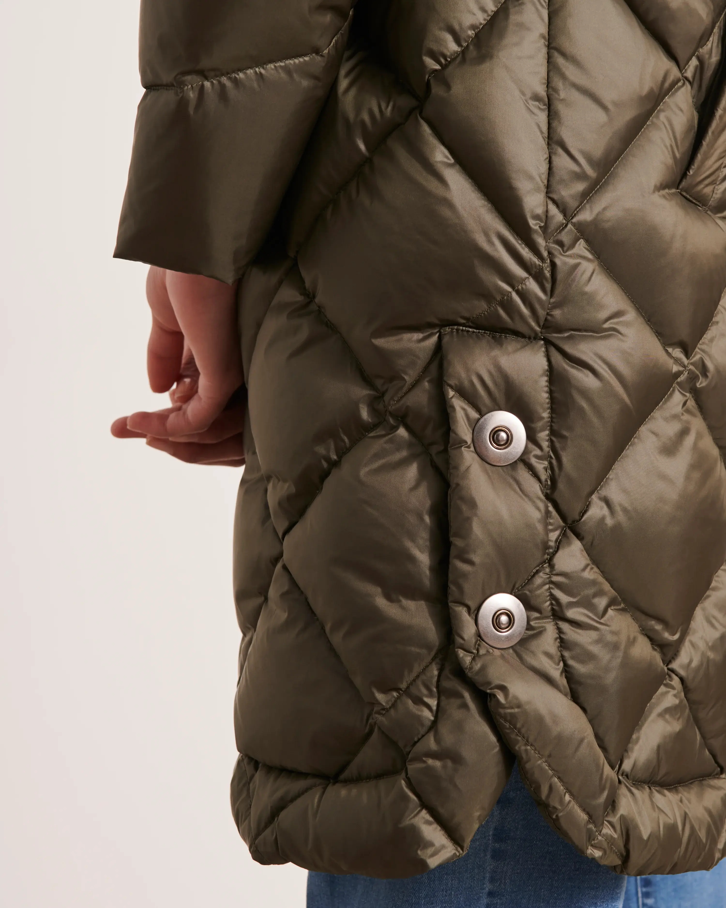 Стеганый пуховик средней длины сочетает в себе вневременную элегантность и современный комфорт, а капюшон обеспечит стильную защиту. Утеплитель из утиного пуха и пера гарантирует обволакивающее тепло, не утяжеляя силуэт. Разрезы и металлические люверсы внизу, как и аккуратная застёжка-молния , придают современный вид. Два практичных кармана с окантовкой в области таза обеспечивают функциональность и комфорт.