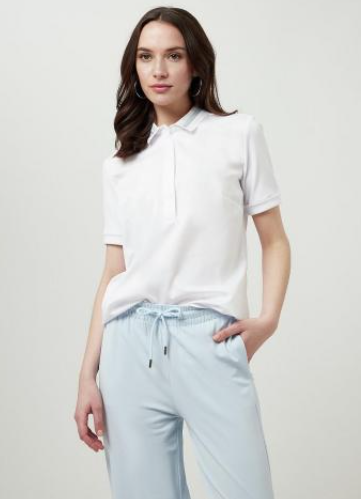 Великолепная рубашка-поло белого цвета с короткими рукавами, с застежкой на пуговицы с круглой эмблемой на груди (фото имеет отличие).