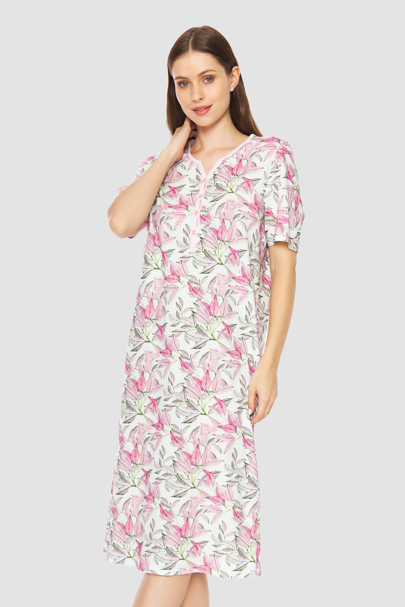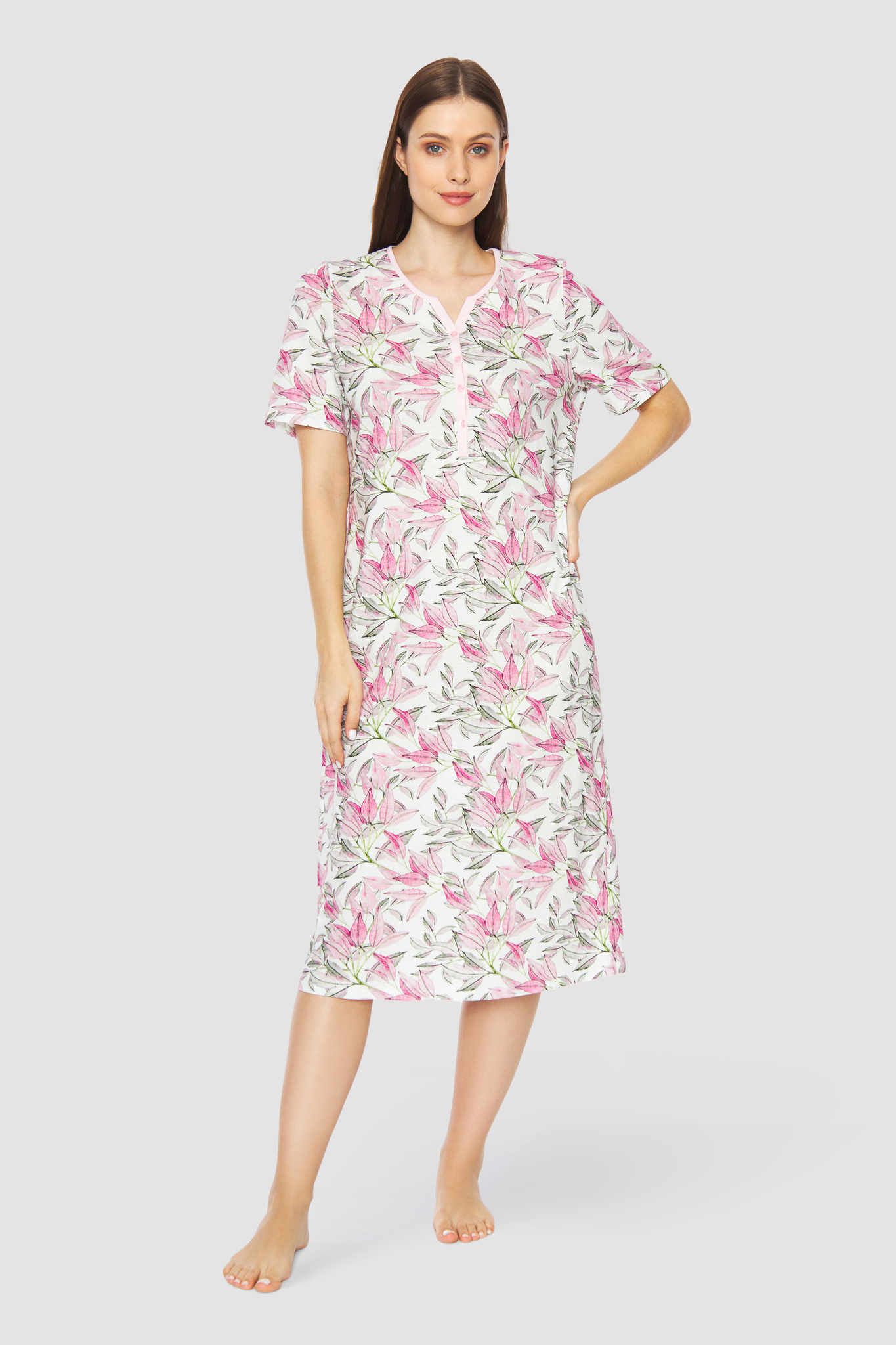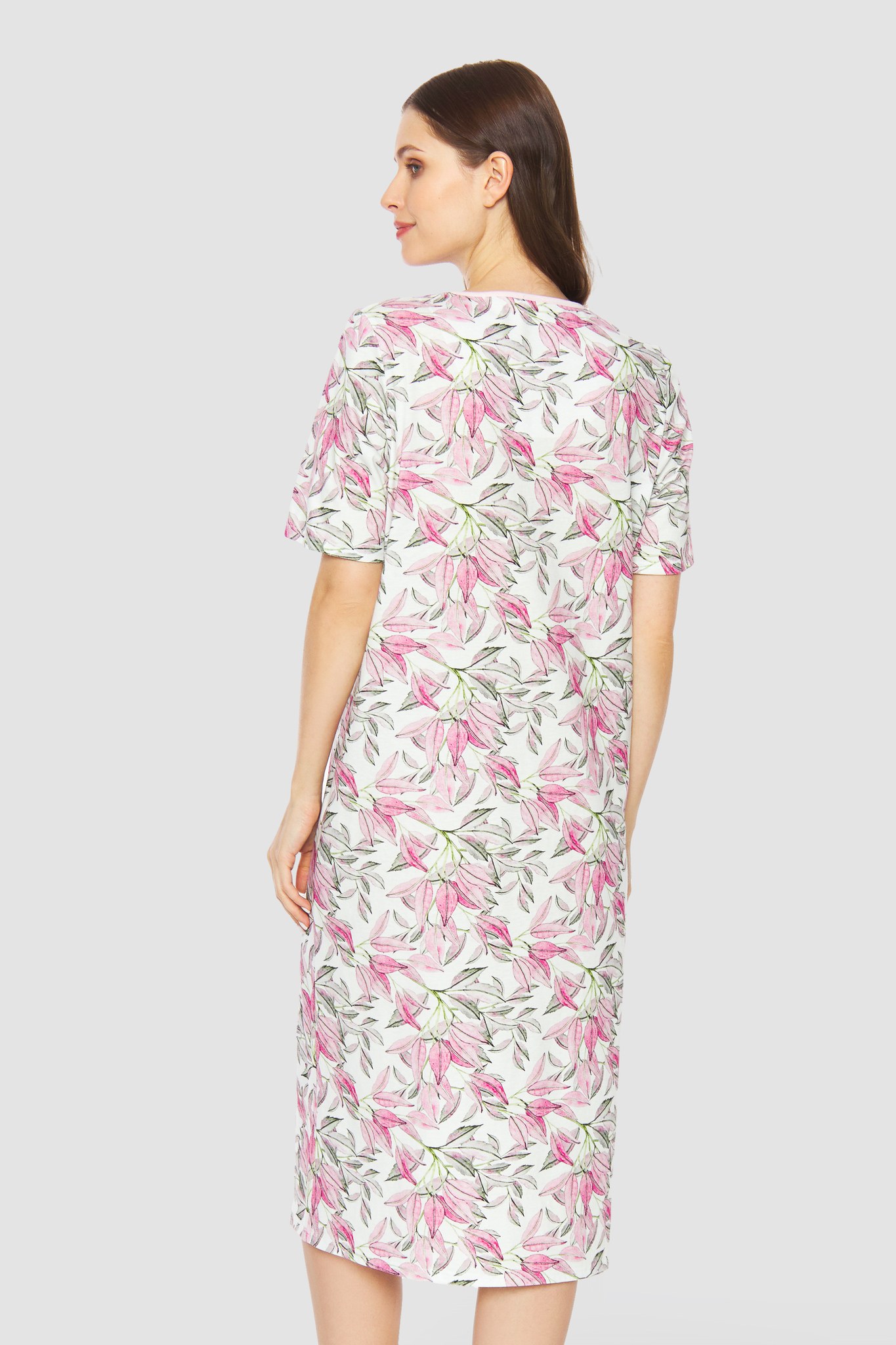 Романтическая ночная сорочка с цветочным принтом на леопардовом узоре с круглым вырезом и приспущенными плечами.