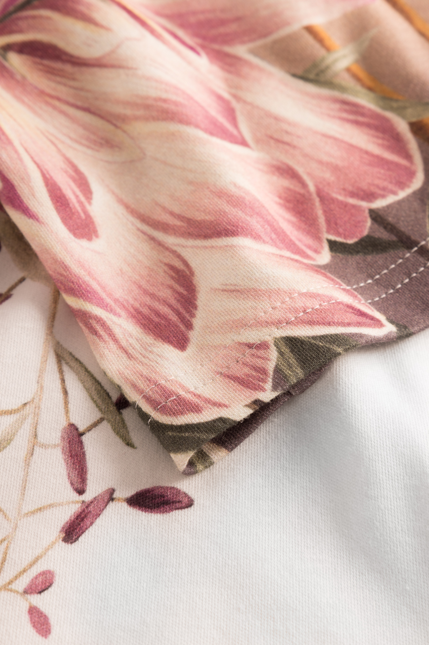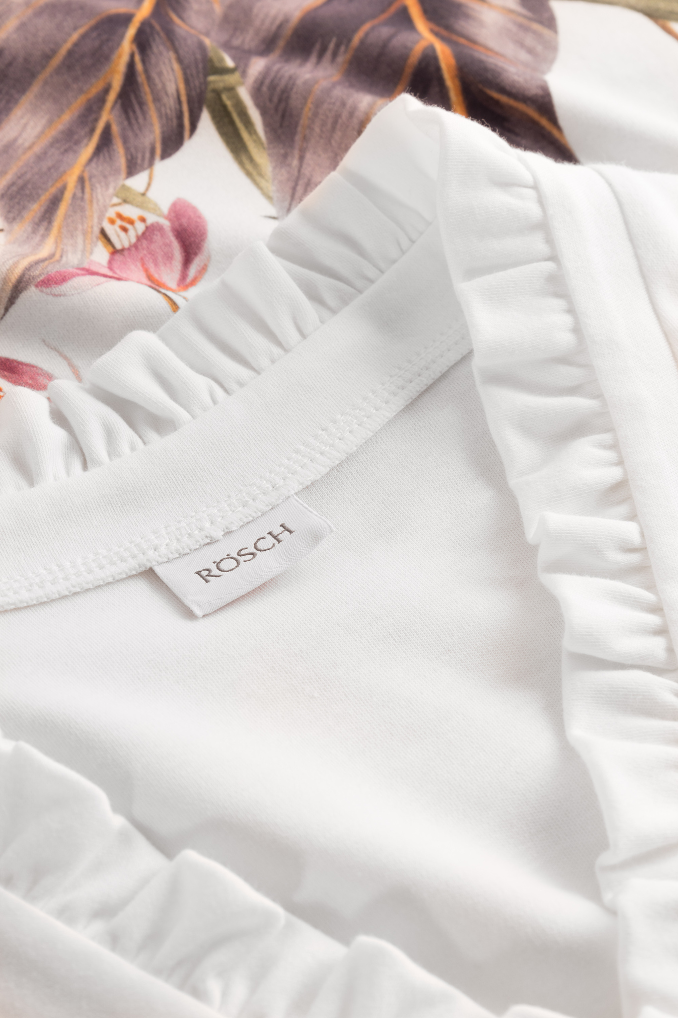 Великолепная сорочка сливочного цвета с V-образным вырезом, который изящно декорирован мягкой оборкой в тон сорочки, с длинными рукавами и цветочным узором, напоминающим об ушедшем лете и украшающим низ сорочки.