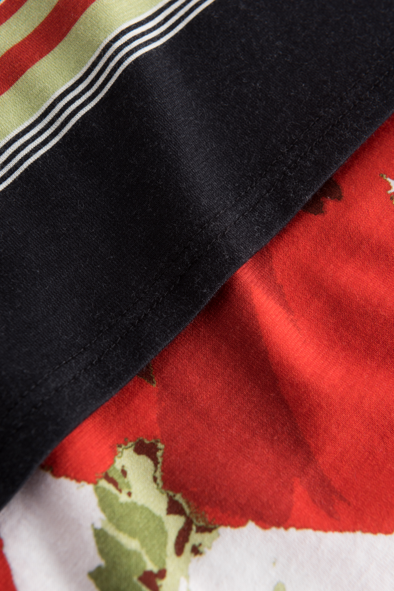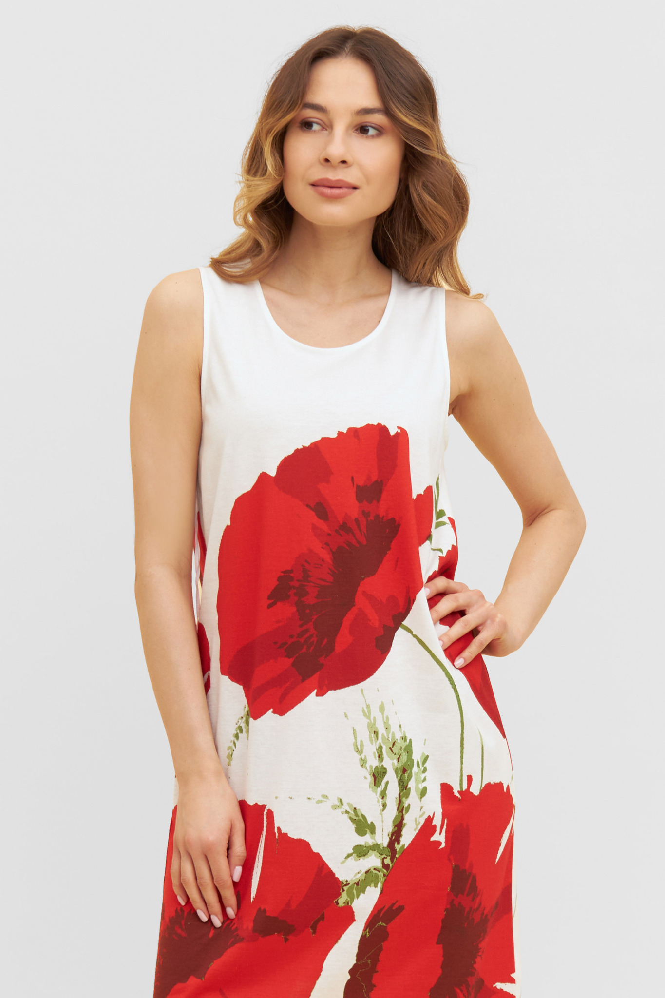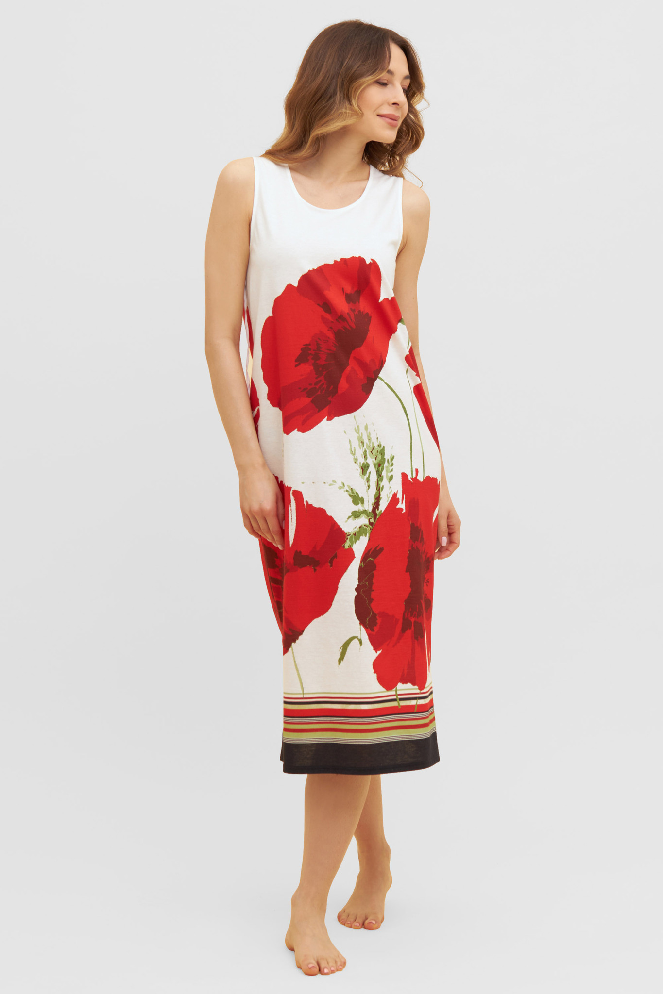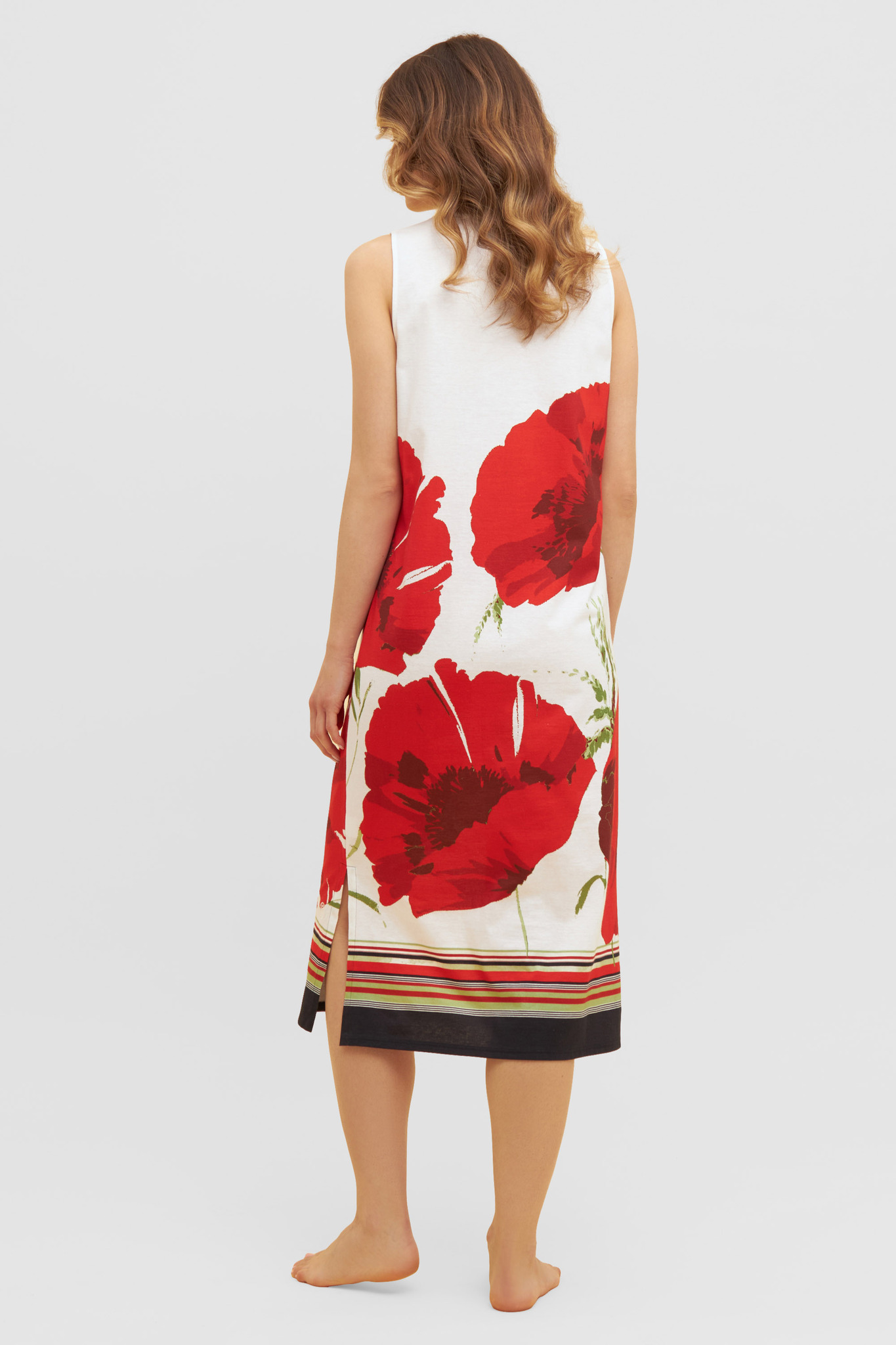 Шикарная ночная сорочка без рукавов с декоративным маковым принтом. Полосатая кайма по низу и высокие разрезы в боковых швах подчеркивают экстравагантный стиль.