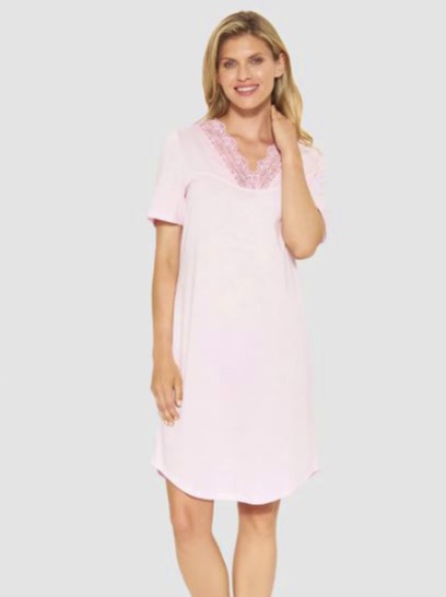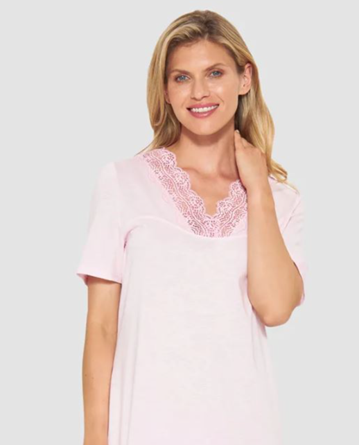 Rösch - Новый романс Тема- Времена года Стиль - нежный, свежий, простой. Великолепная сорочка с короткими рукавами и V-образным вырезом, декорированным великолепным кружевом. Низ сорочки скруглен к боковым швам.Состав 100% хлопок Длина 95 смЦвет чайная роза