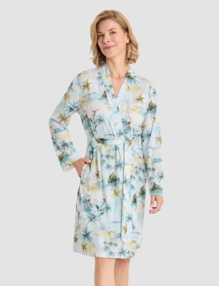 Великолепный халат - кимоно с контрастной отделкой, поясом, боковыми карманами и очаровательным принтом. Тонкая трикотажная ткань обеспечивает ощущение мягкости и комфорта.