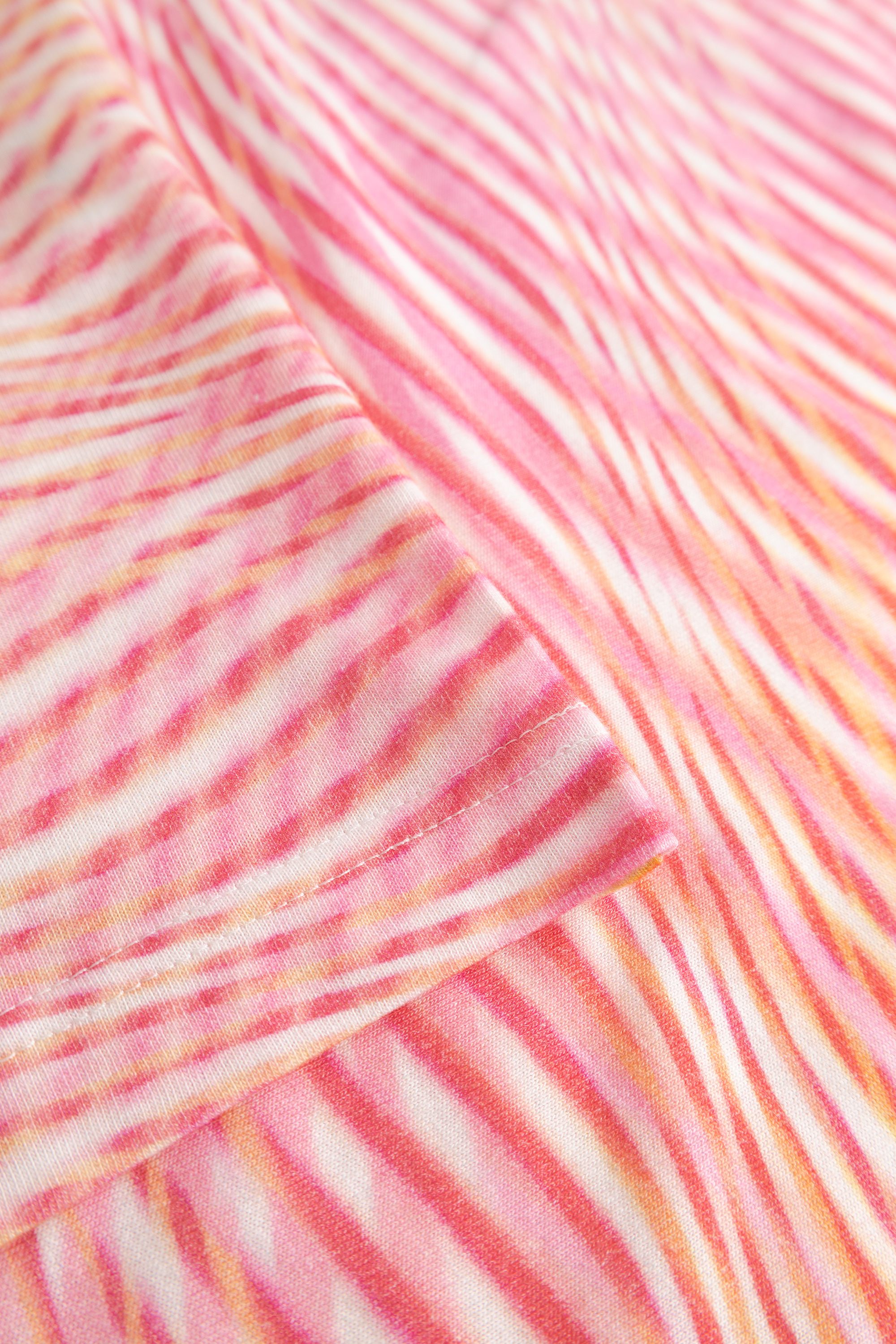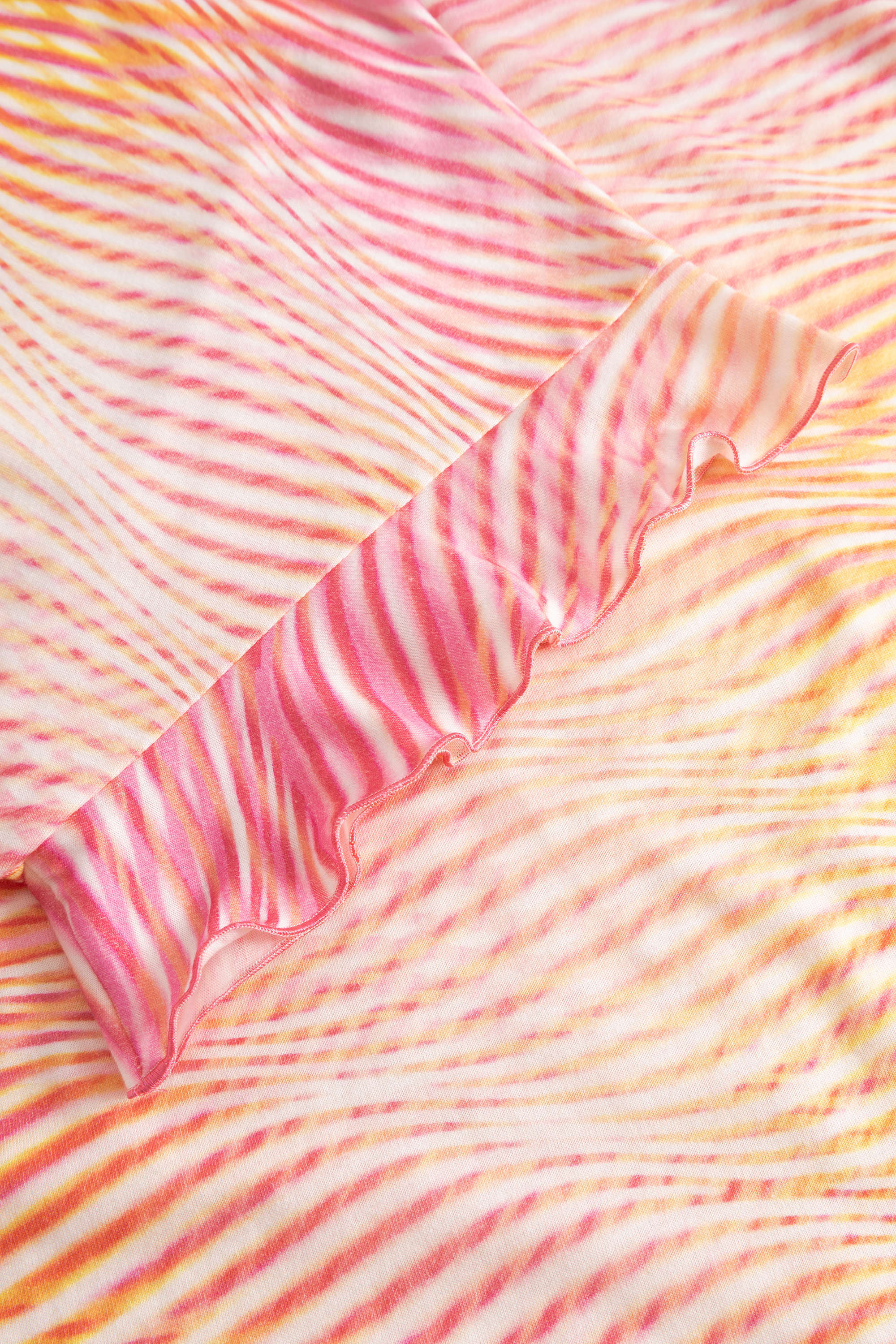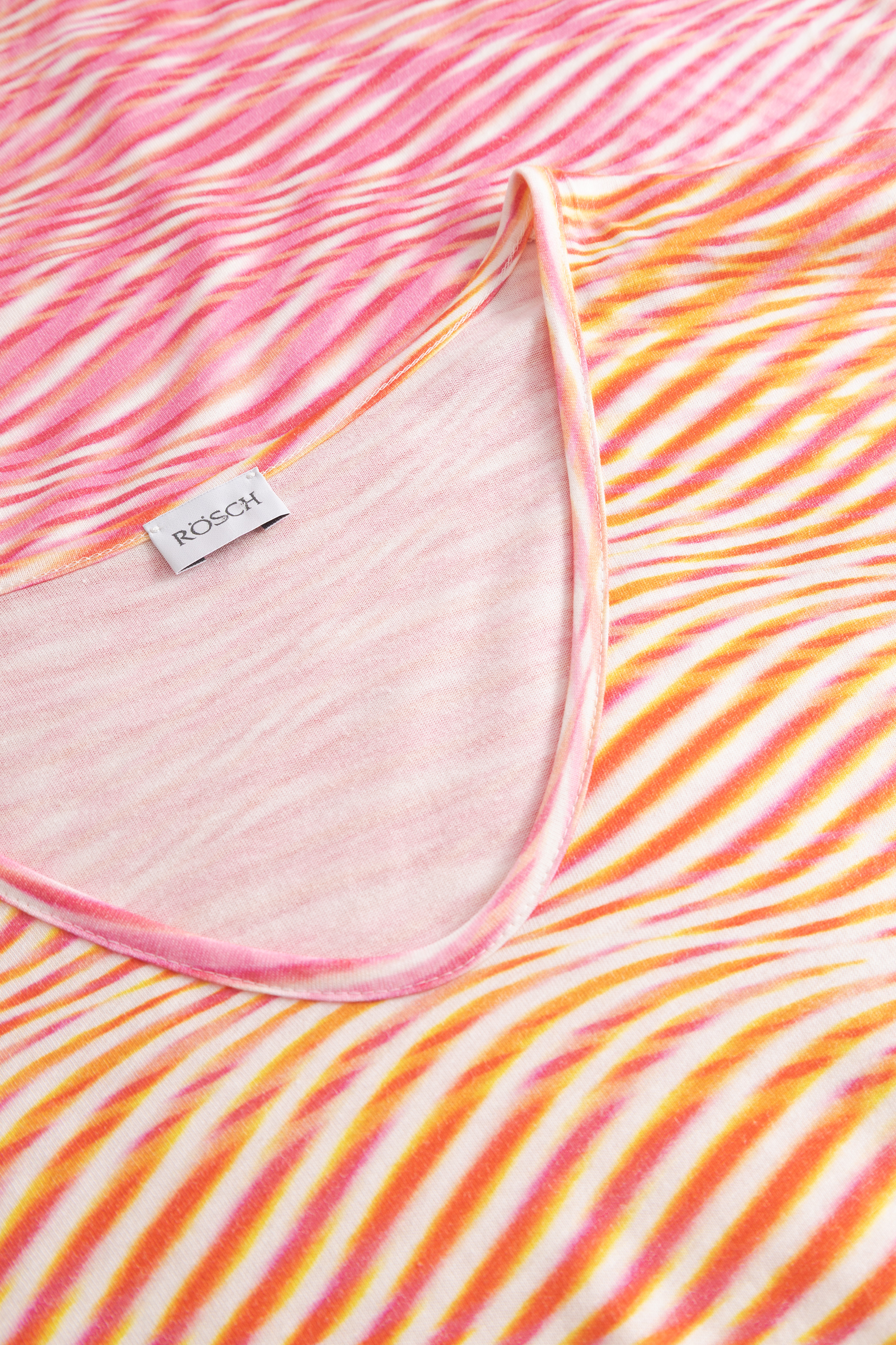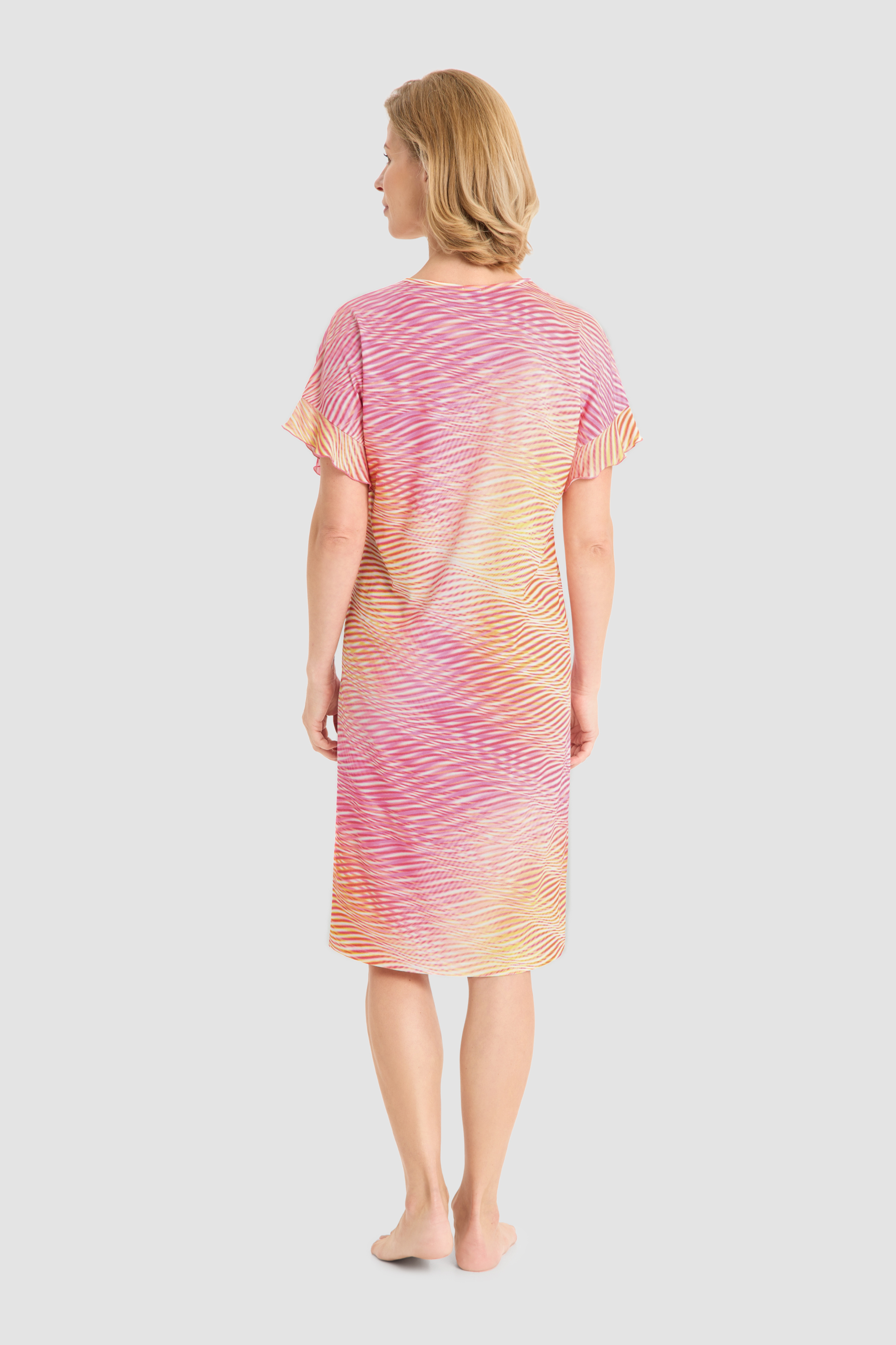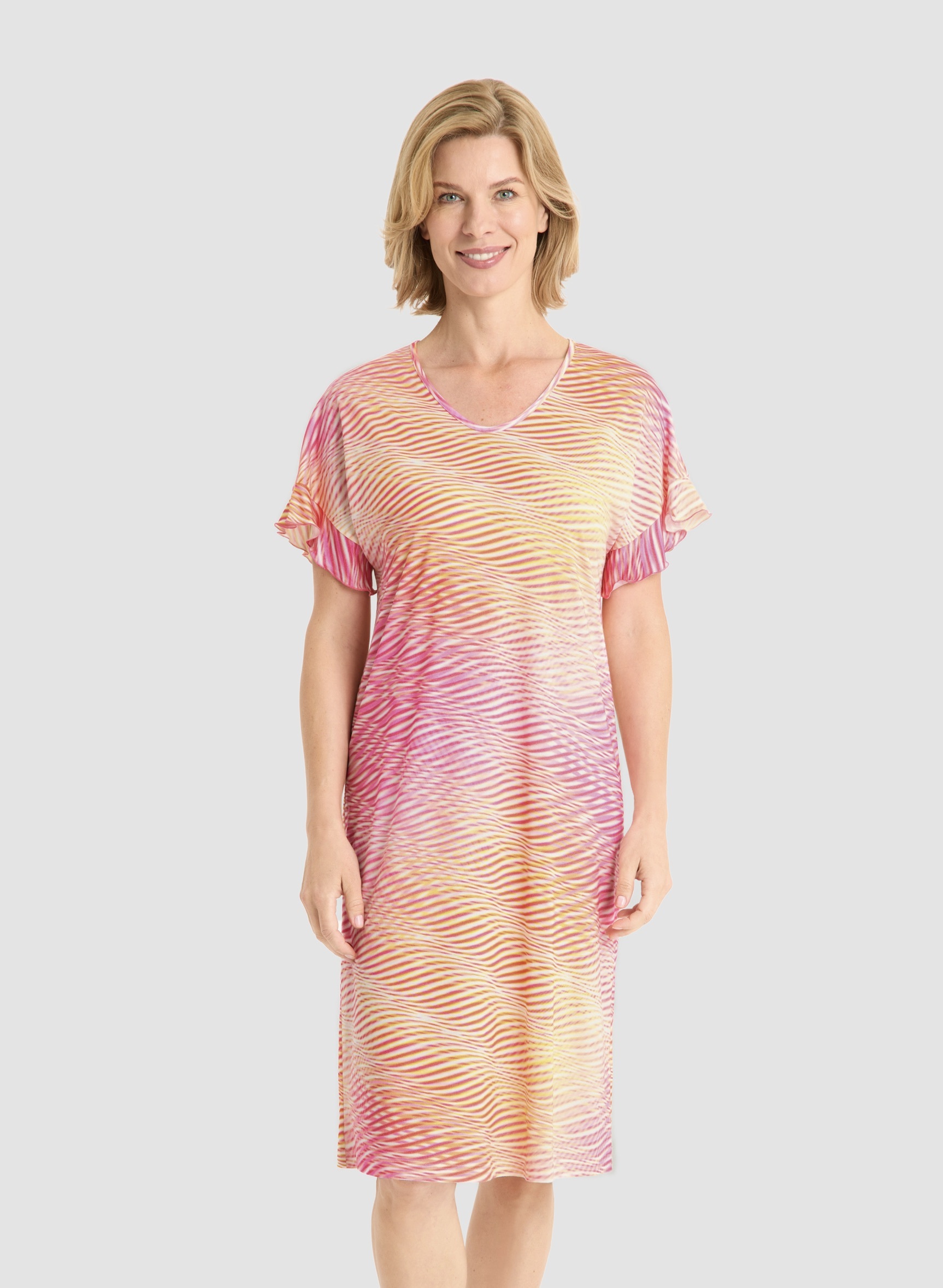 Яркая сорочка с V-образным вырезом, короткими рукавами с оборками и принтом в желто-розовых тонах из мягкой ткани. Сорочку можно носить как домашнее платье.