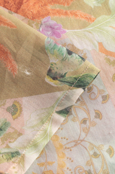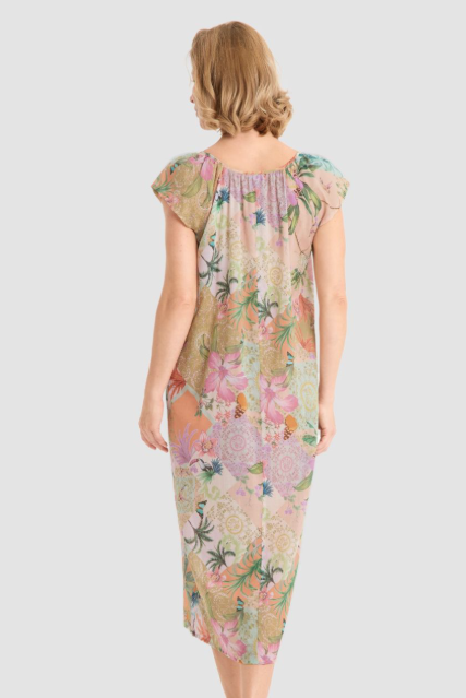 Дивная нетрикотажная сорочка из легкого муслина с рукавами-крылышками с круглым вырезом со сборками в зоне декольте и нежным цветочным принтом в пастельных тонах.