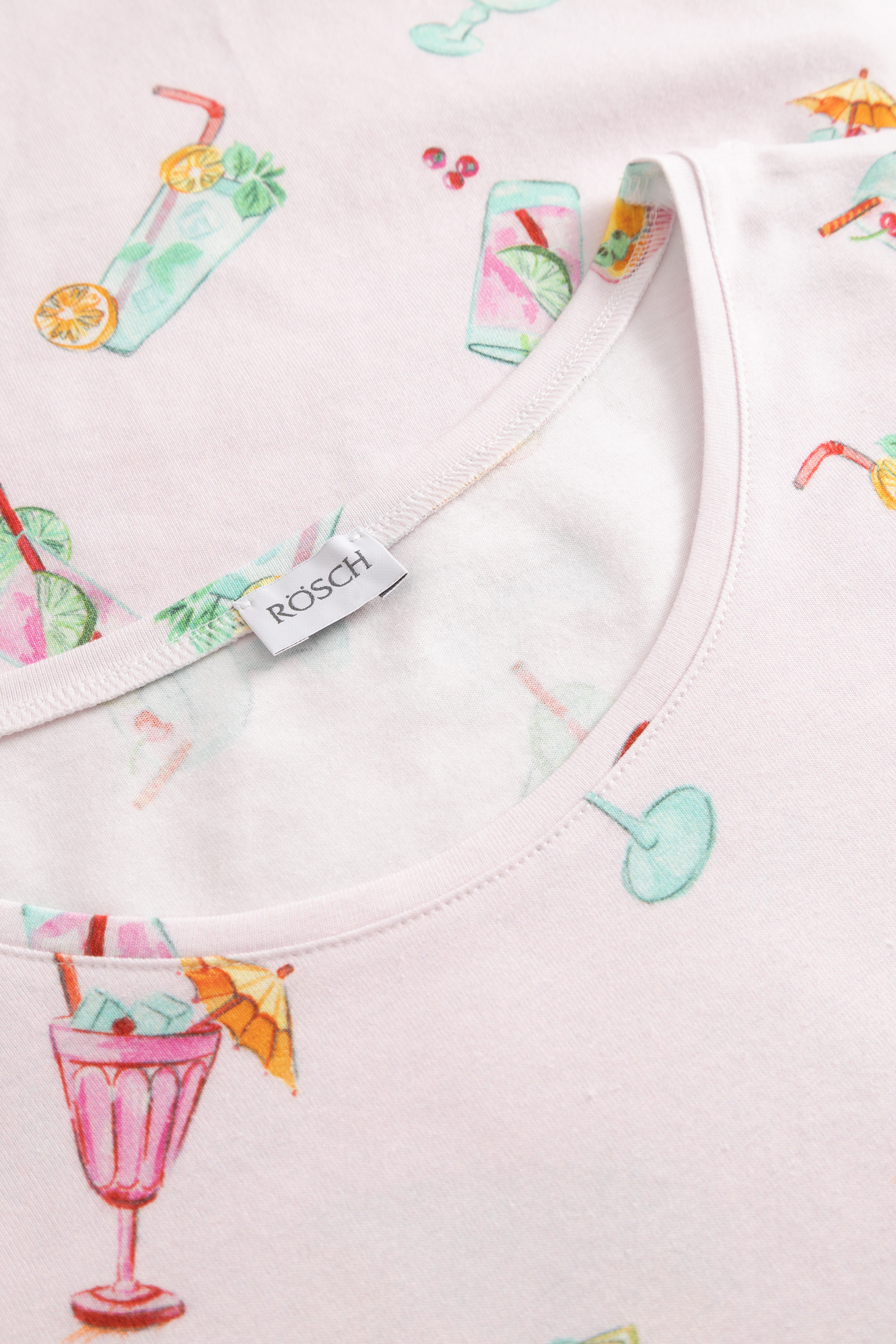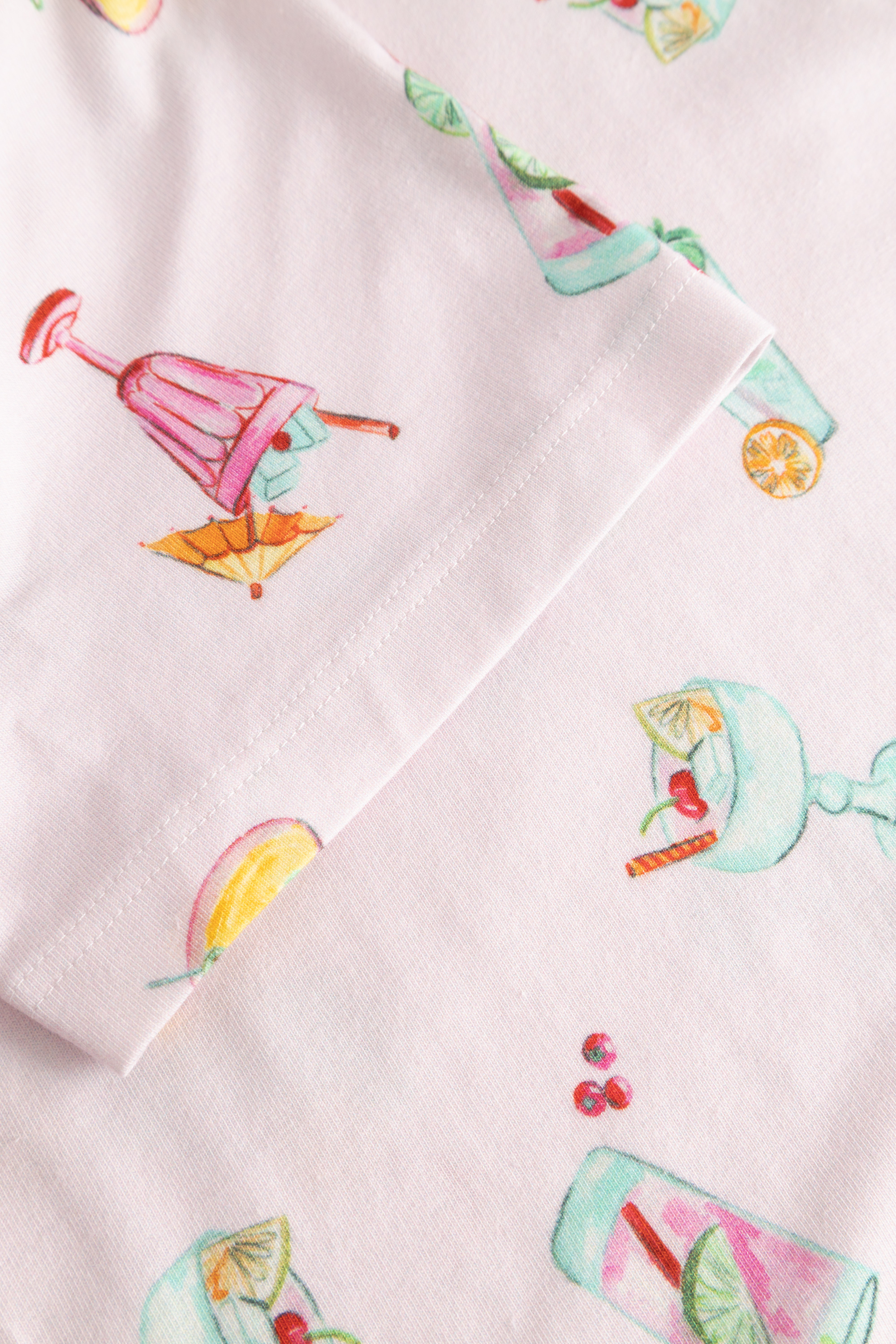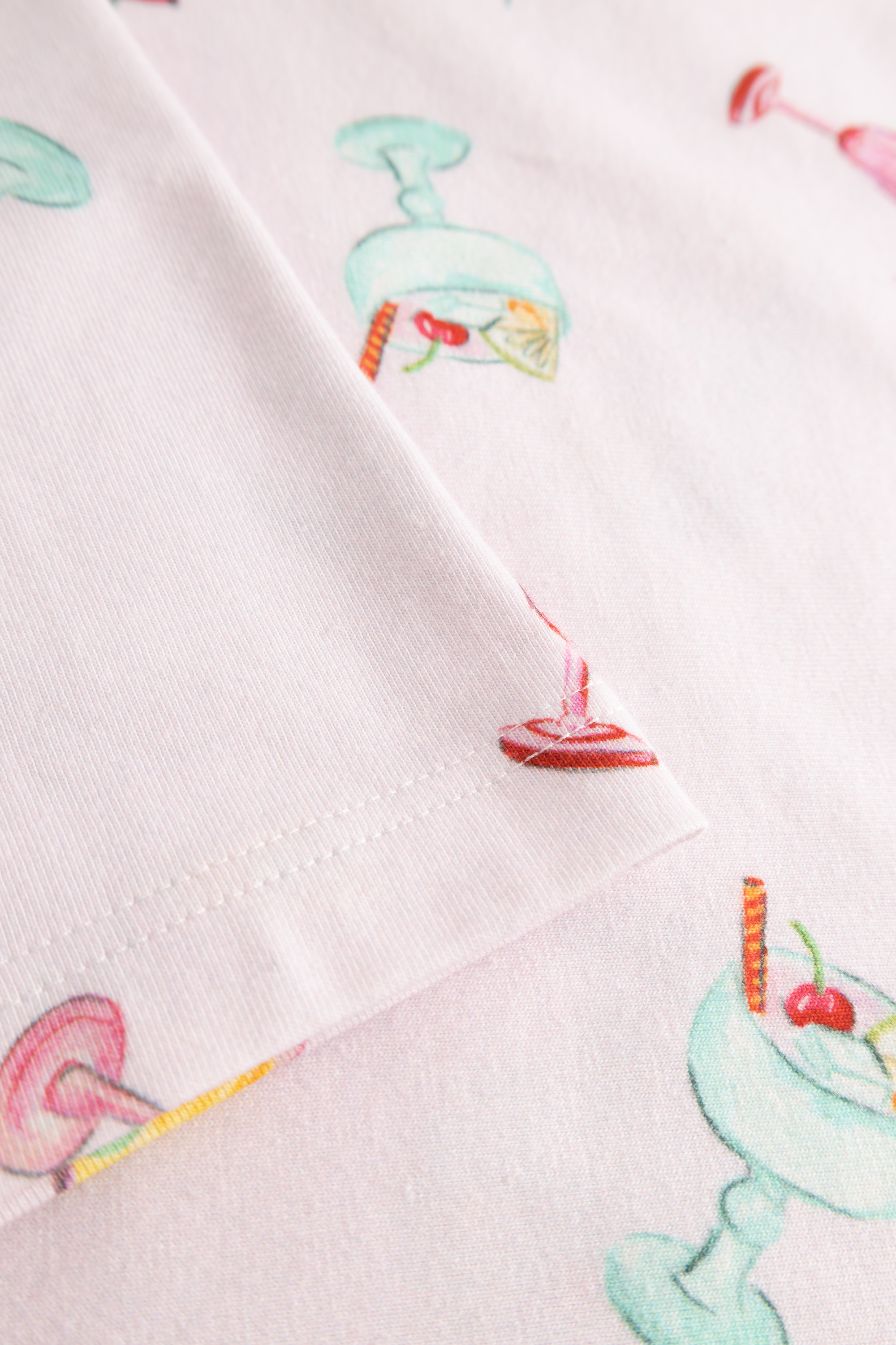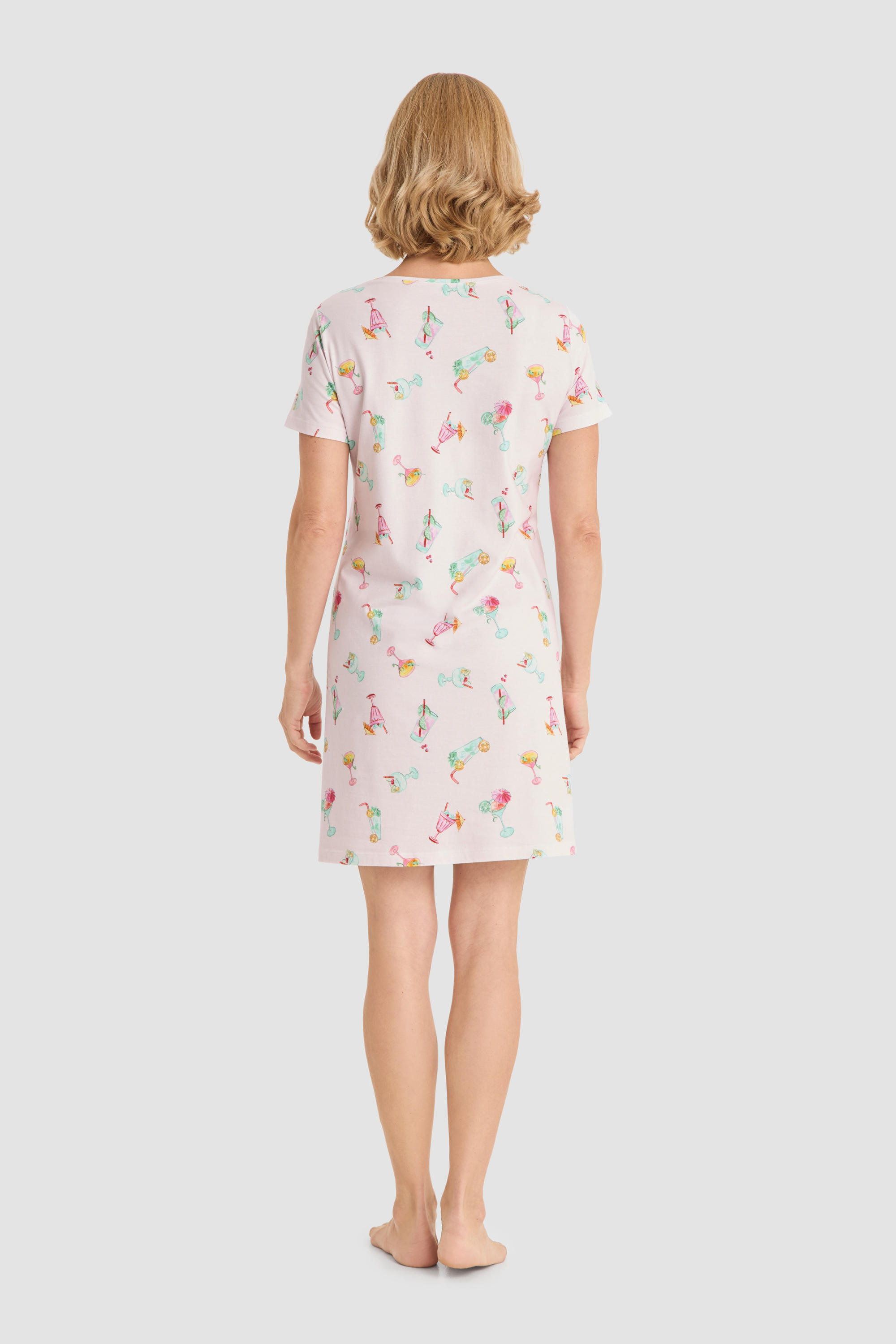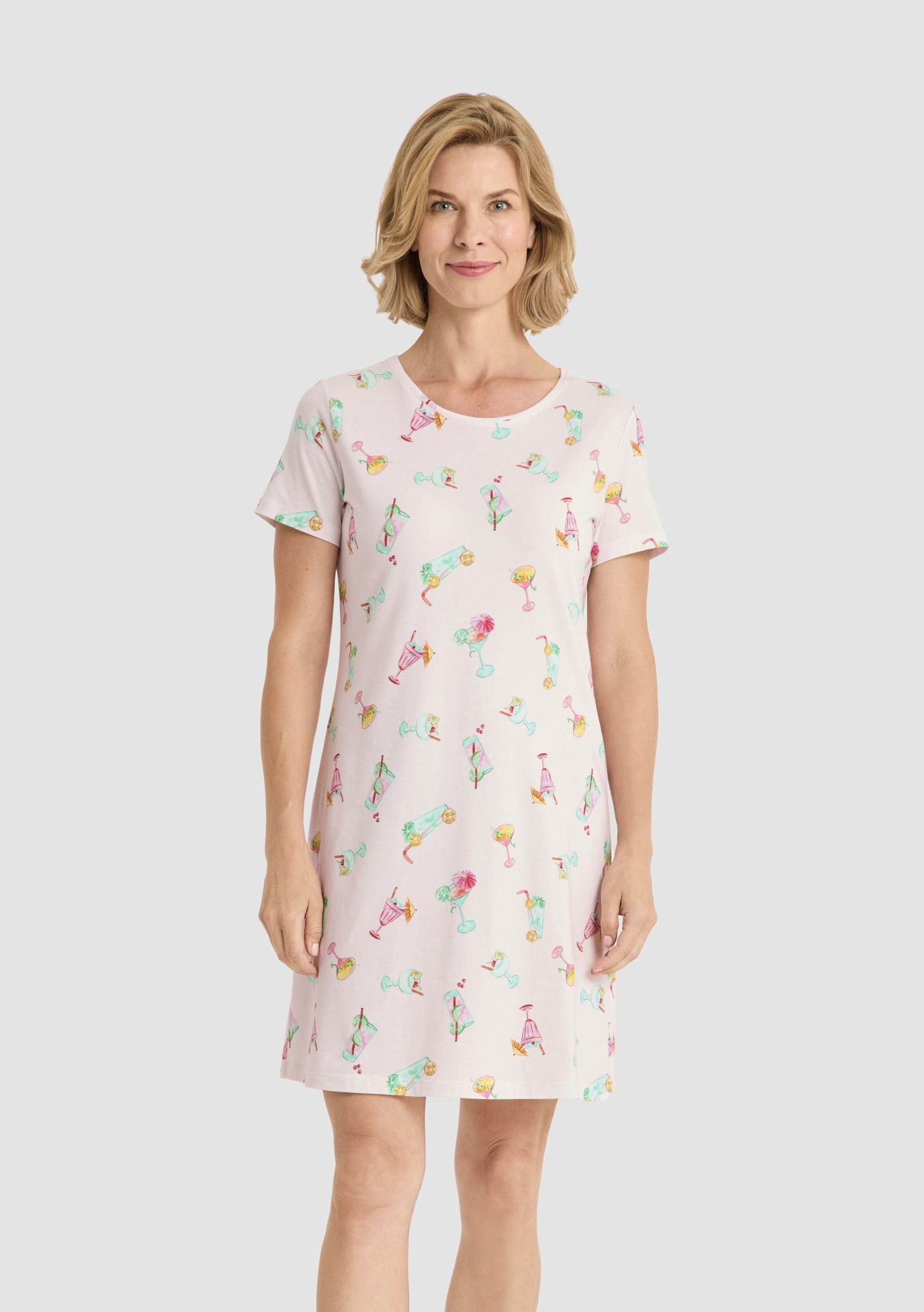 Симпатичная сорочка с круглым вырезом, короткими рукавами и забавным принтом, изображающим креманки с мороженым и коктейли.