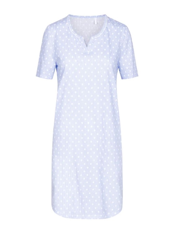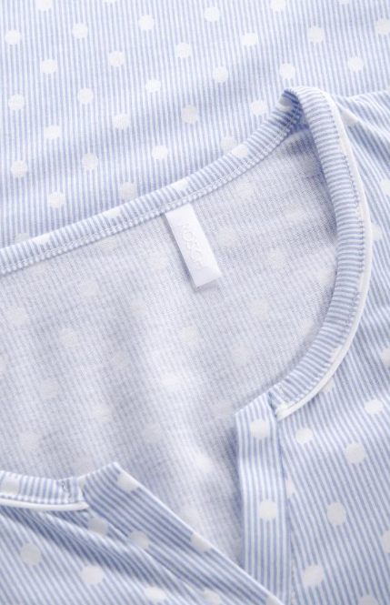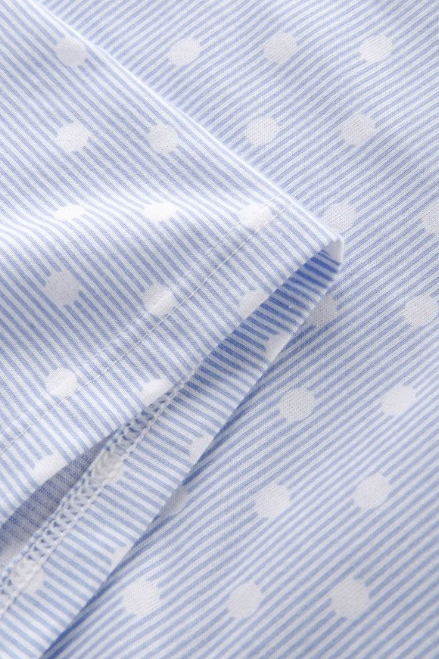 Лаконичная сорочка с фигурным вырезом горловины с короткими рукавами и романтичным принтом одновременно в горошек и полоску.