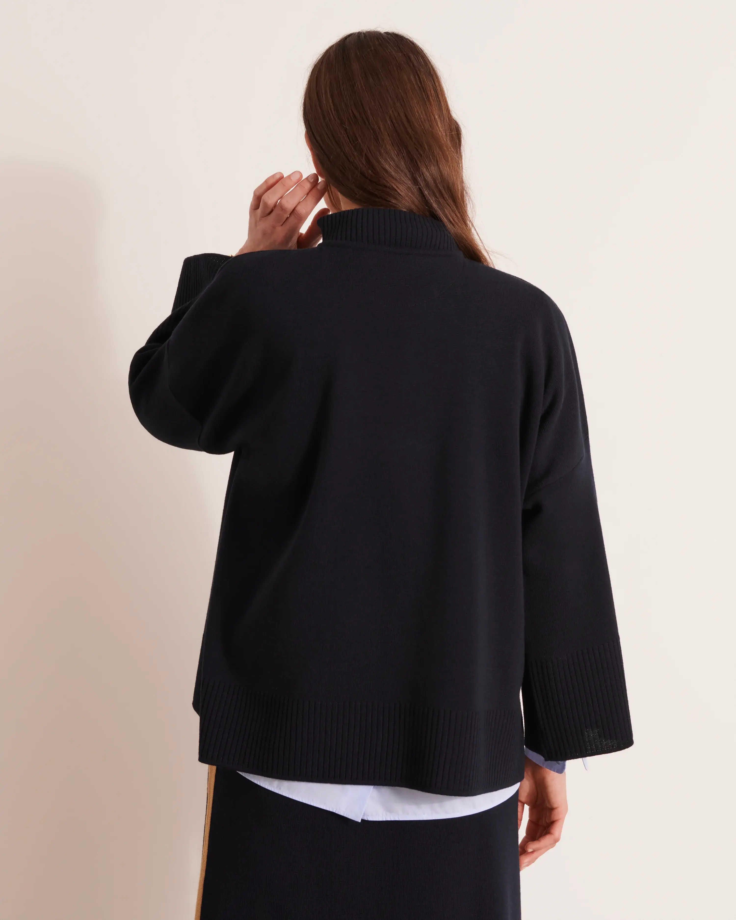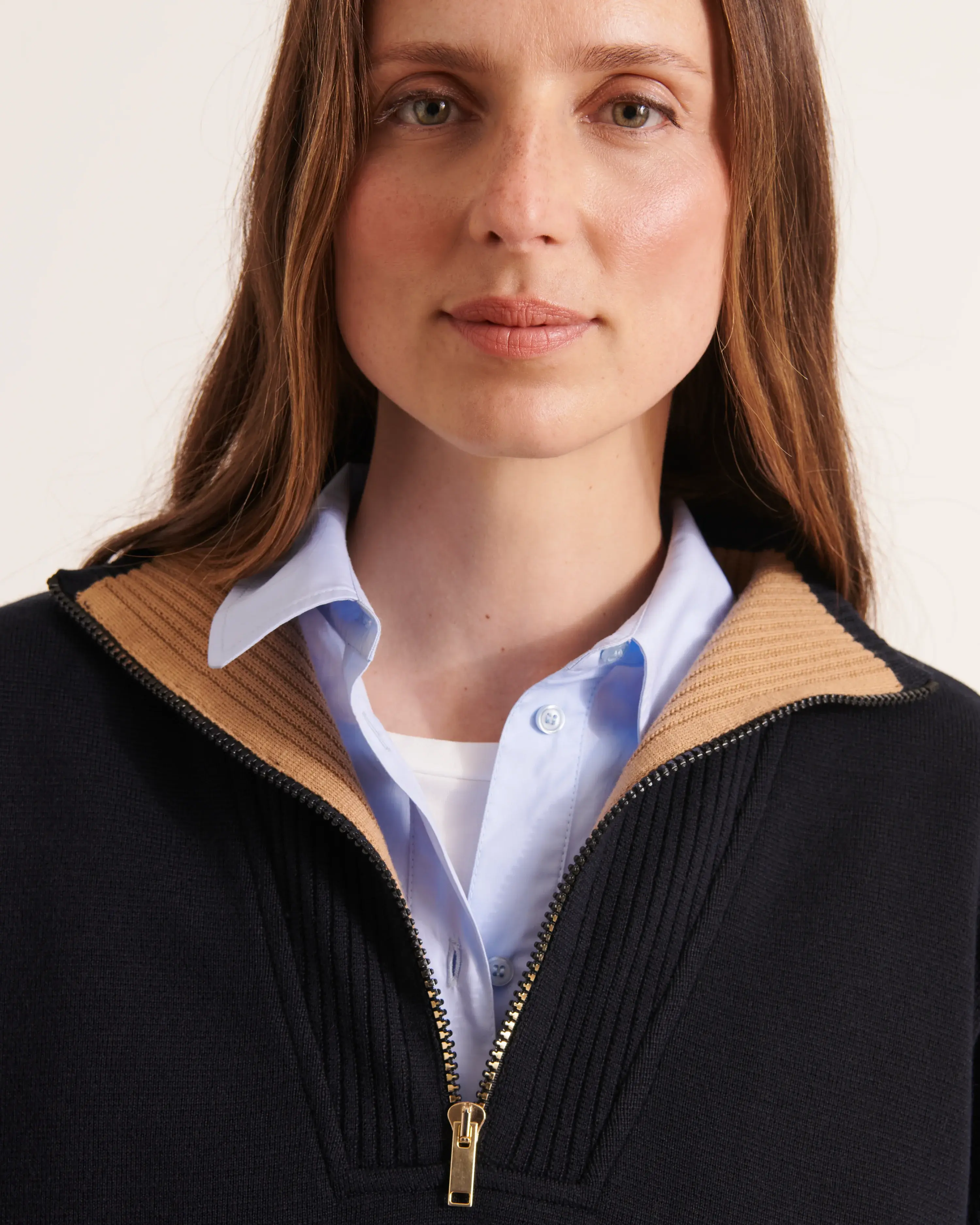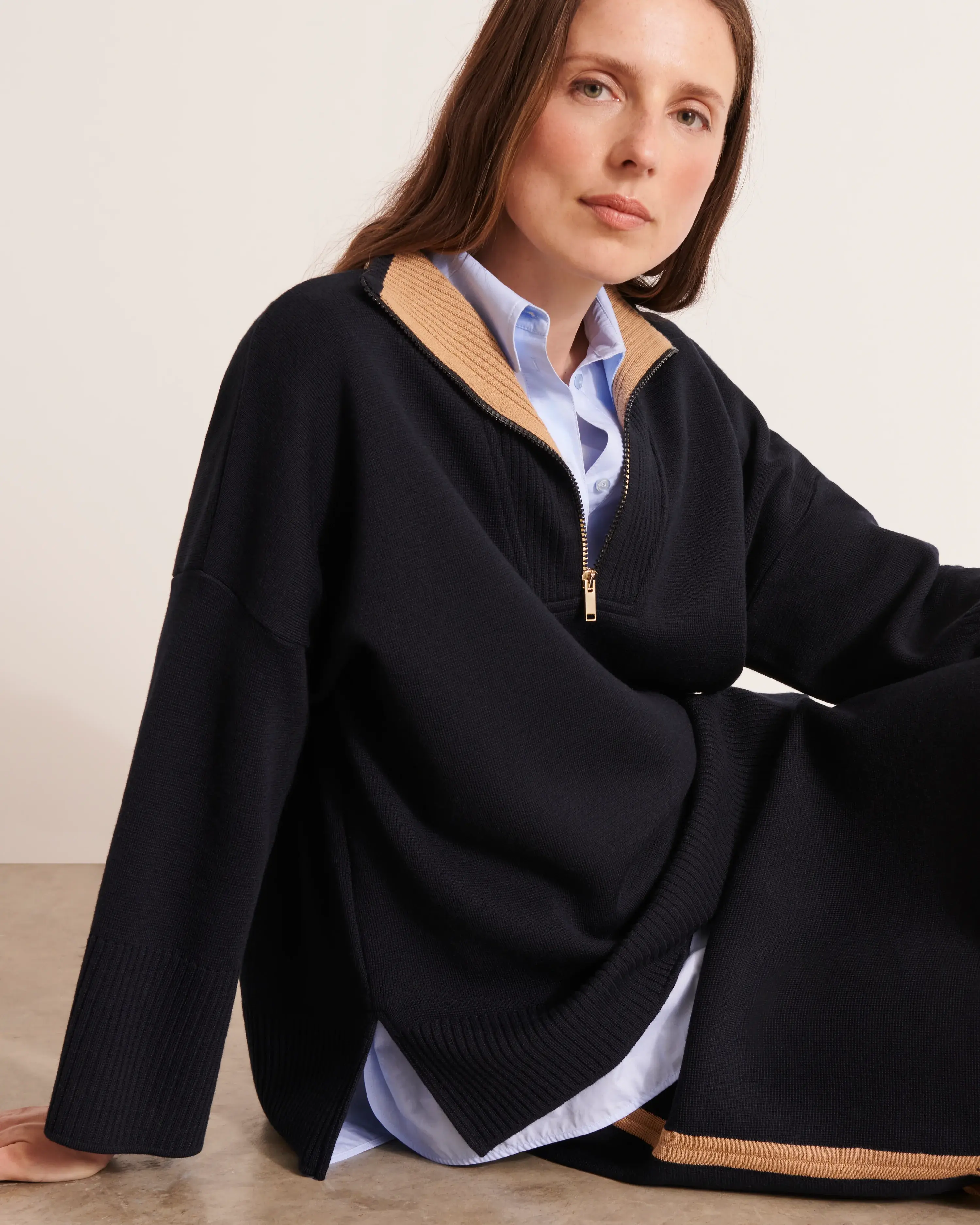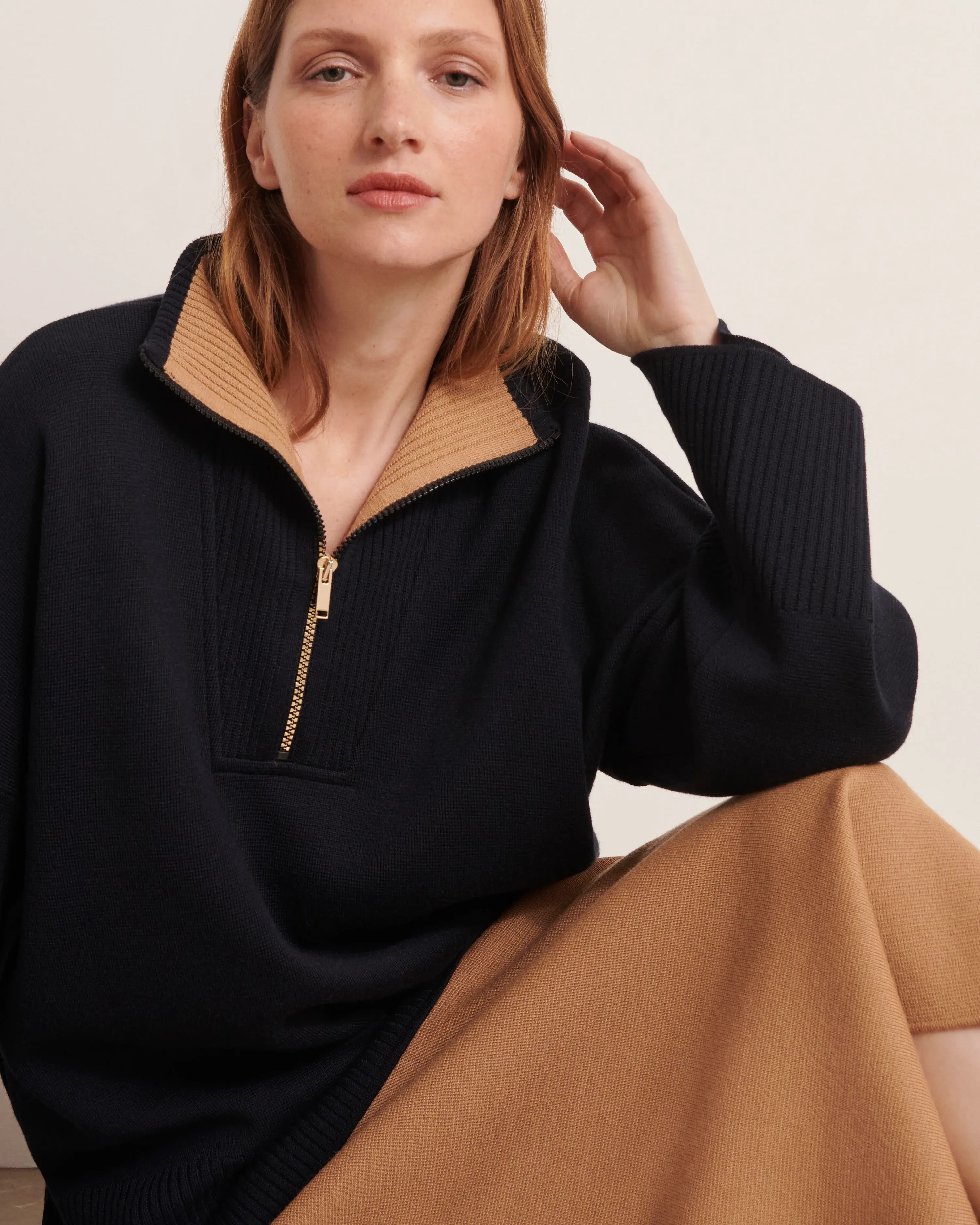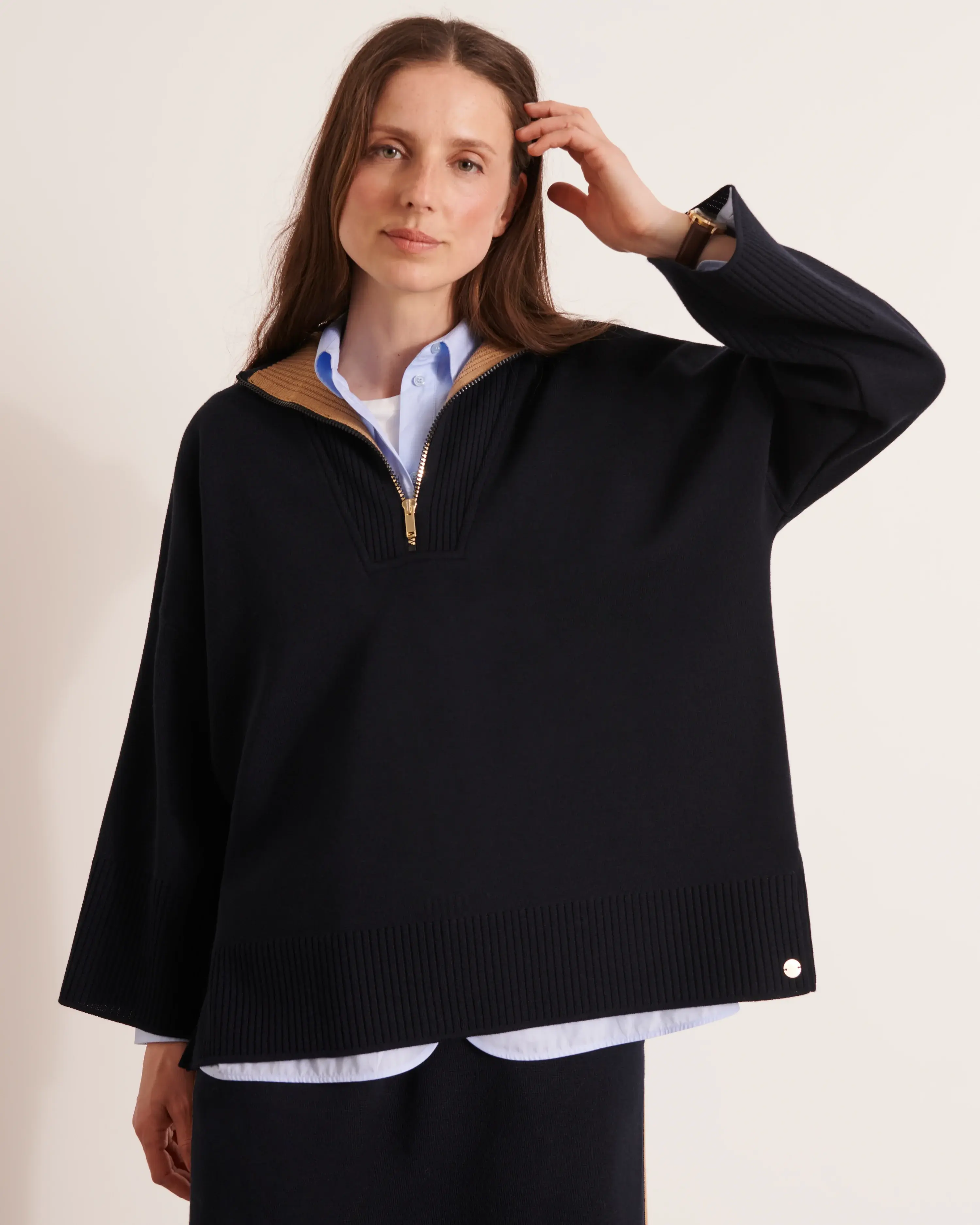 Великолепный свитер свободного силуэта с воротником-стойкой, связанный в мастерских в Роанне из мериносовой шерсти, обеспечивает абсолютный комфорт без ущерба для элегантности. Классический темно- синий цвет в сочетании с песочно-бежевой внутренней частью воротника и золотой молнией, боковые разрезы придаёт французский шик повседневной элегантности.