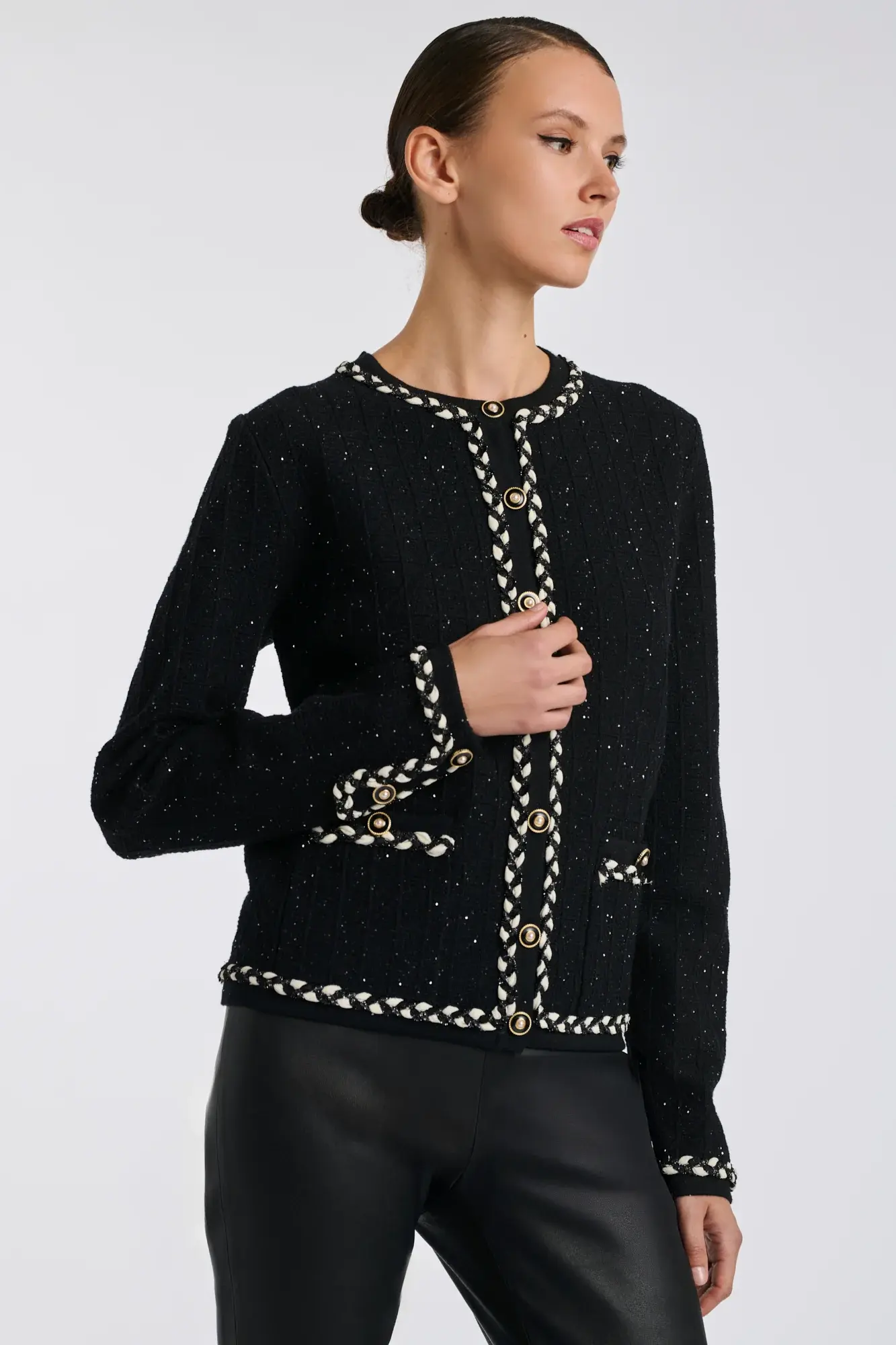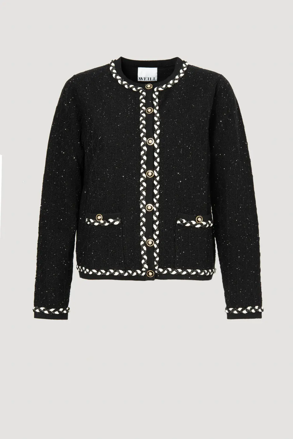 Твидовый жакет с люрексовой нитью, украшенный двухцветной плетеной отделкой, фирменными пуговицами Weill и двумя накладными карманами. Жакет был разработан в Париже, в его исторической мастерской.